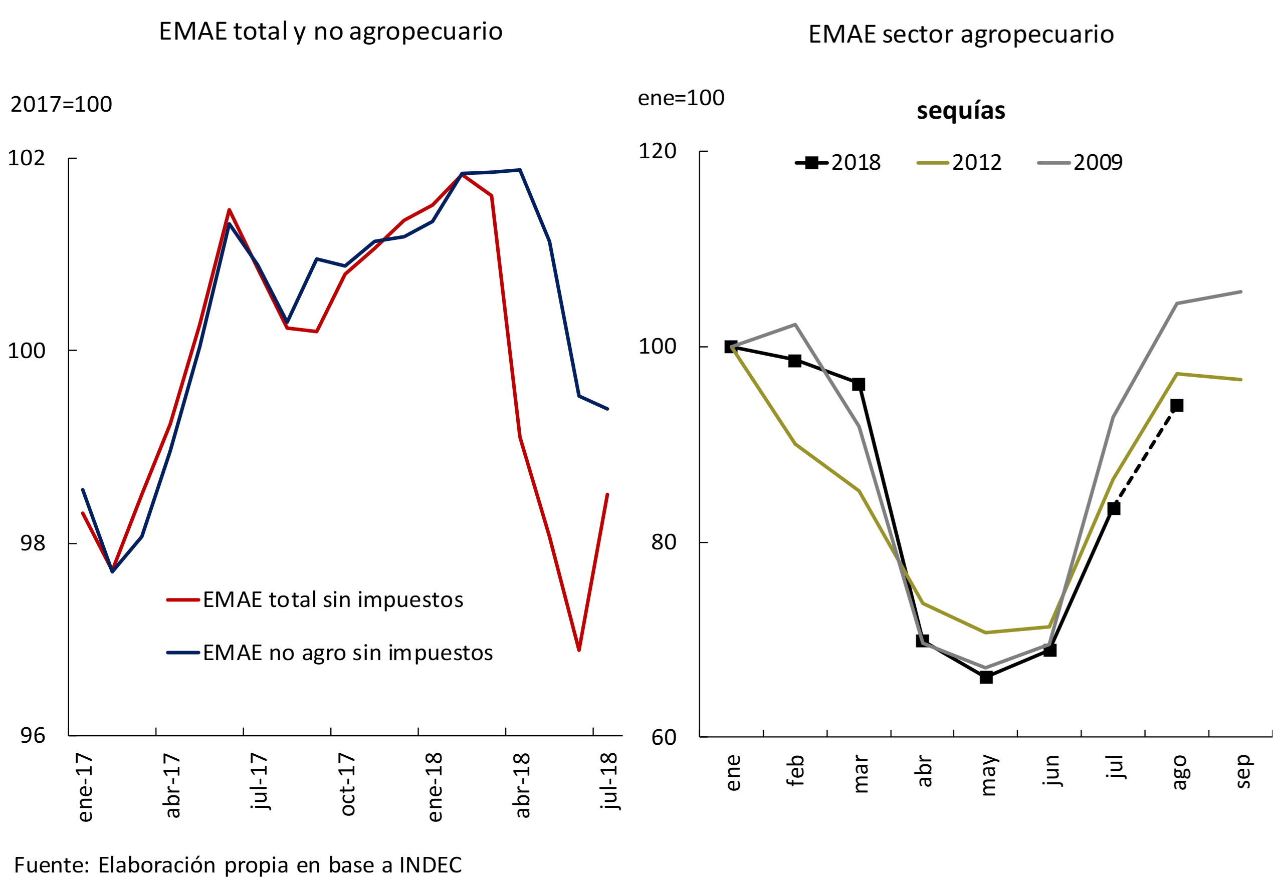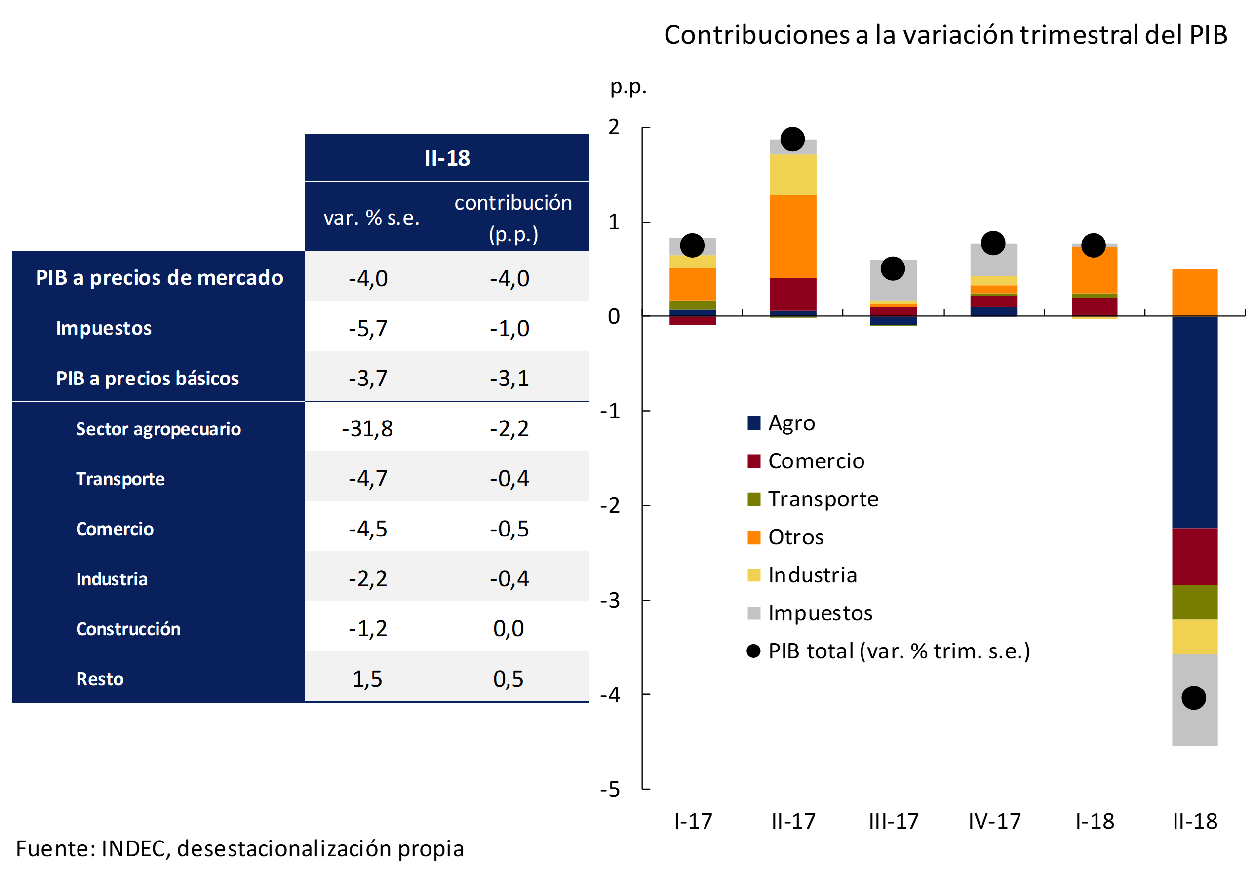 Durante el segundo trimestre, el PIB cayó 4% s.e. y 4,2% i.a. en línea con el escenario adverso previsto en el anterior IPOM. La caída del PIB “no agropecuario” (-1,1% trimestral s.e.) se explica por la contracción de la demanda interna como consecuencia de las tensiones financieras que derivaron en un salto abrupto del tipo de cambio, con el consecuente aumento de la inflación, la caída del salario real y el incremento de la incertidumbre. El transporte y el comercio sufrieron además el impacto indirecto de la sequía que afectó fuertemente al producto agropecuario.