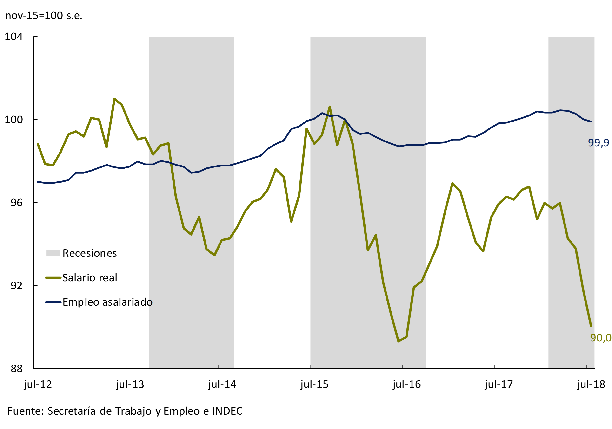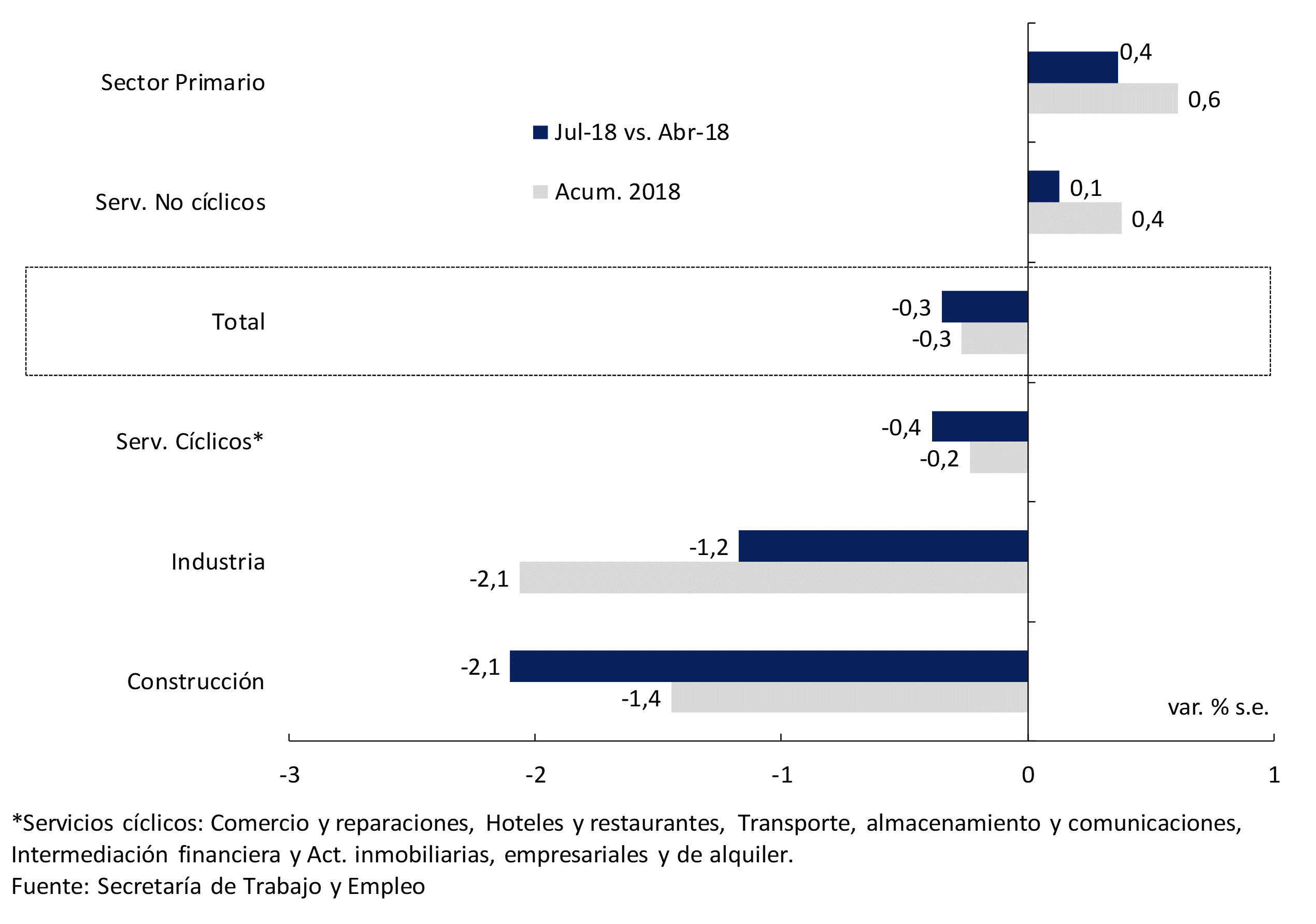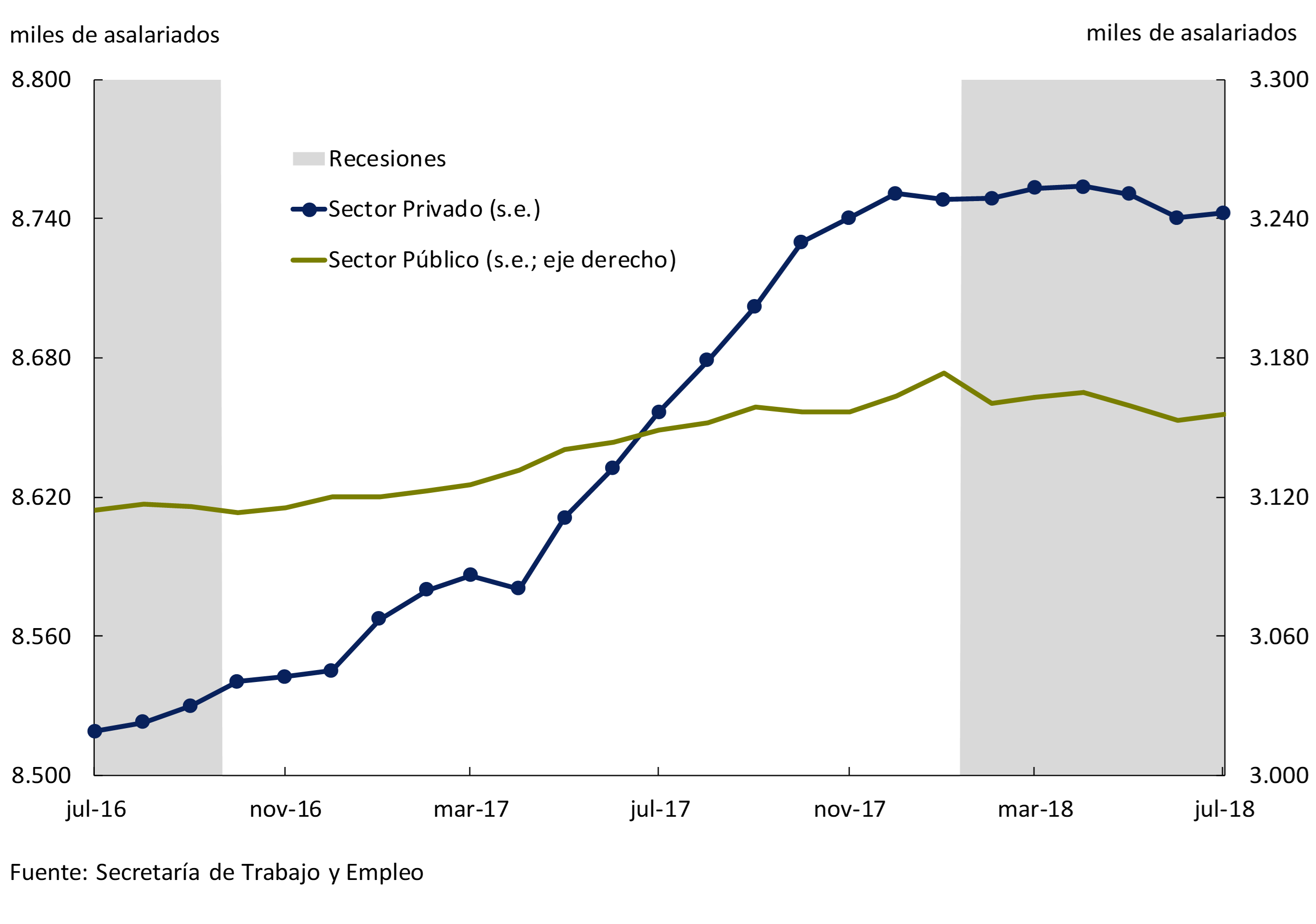 En el segundo trimestre de 2018 la caída del PIB dio lugar a una moderada contracción del empleo formal, deteniéndose el ciclo de expansión iniciado a mediados de 2016 (ver Gráfico 3.11). El trabajo asalariado formal evidenció un estancamiento entre diciembre y marzo y luego inició una leve tendencia contractiva.