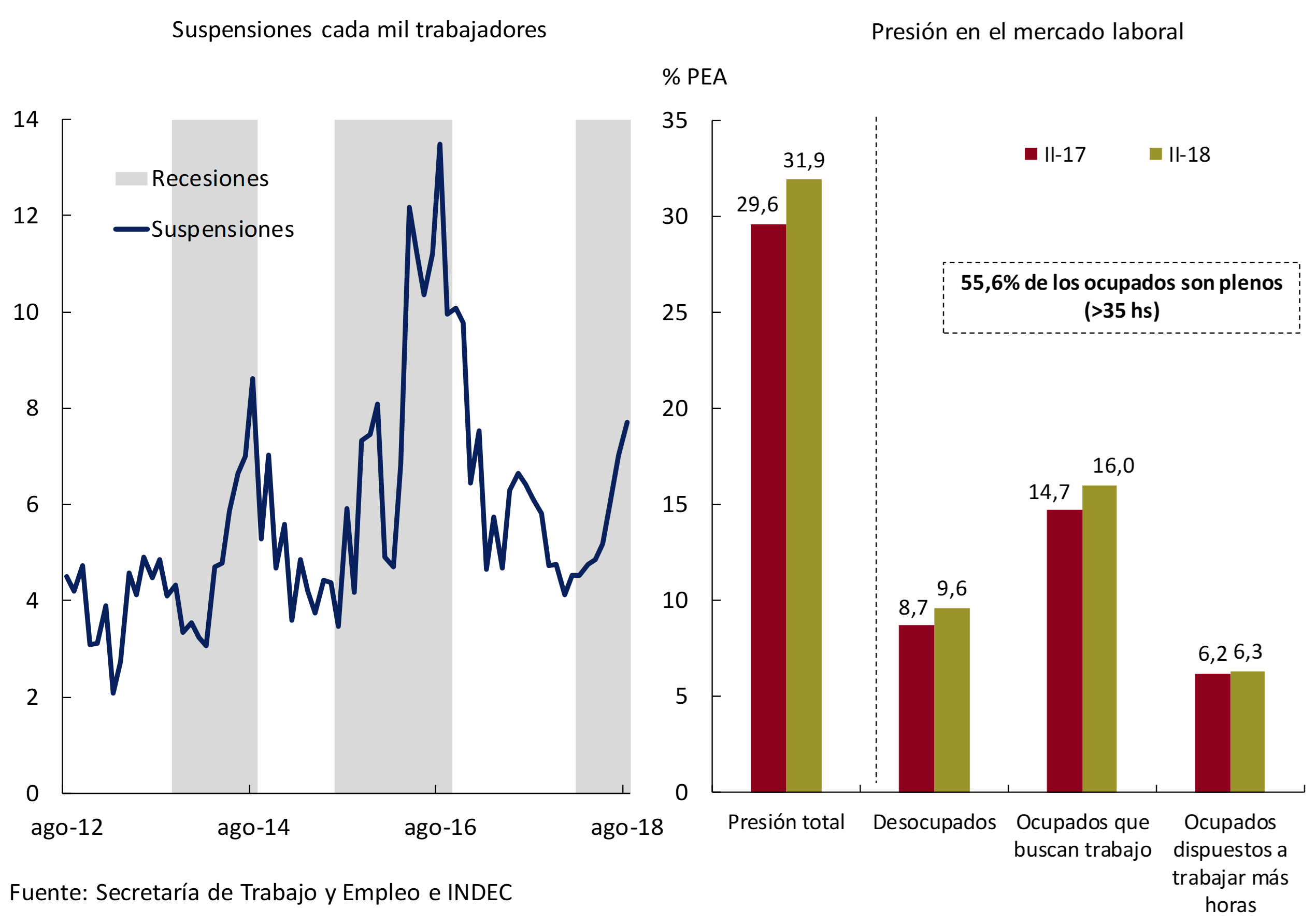 El incremento de las suspensiones junto a la reducción de las horas de trabajo y la disminución del poder adquisitivo del salario, se reflejó en un incremento de las presiones en el mercado laboral: la cantidad de personas que estaban inactivas y deciden buscar empleo, que estaban ocupados o subocupados y que buscan otro trabajo y/o están dispuestos a trabajar más horas, se elevó respecto de un año atrás (ver Gráfico 3.13).