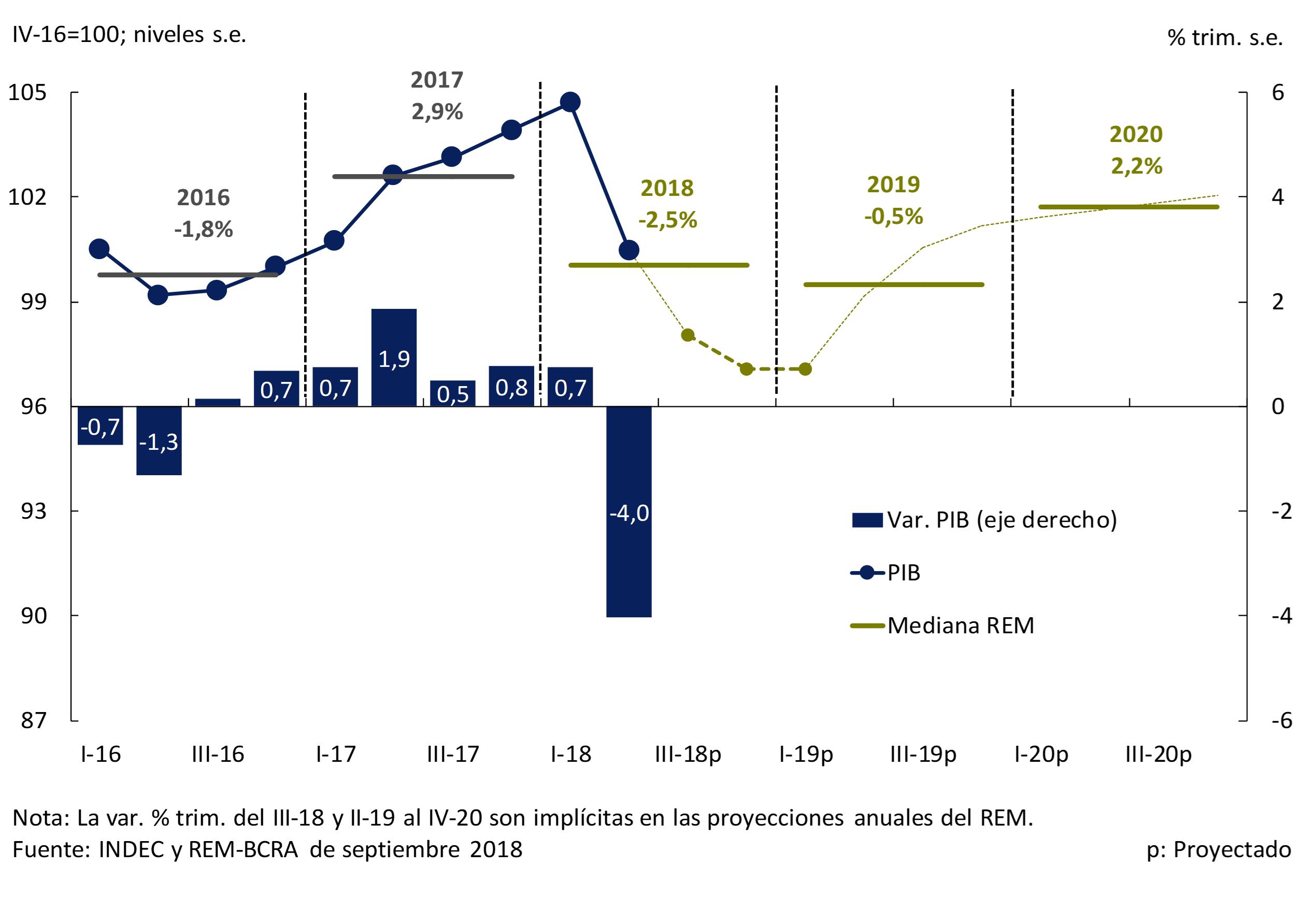 Estas proyecciones son consistentes con el escenario base del BCRA que prevé el inicio de una fase expansiva en 2019, a partir del mejor desempeño del sector exportador y la normalización del funcionamiento de los mercados financieros, contribuyendo a la corrección del desequilibrio en cuenta corriente.