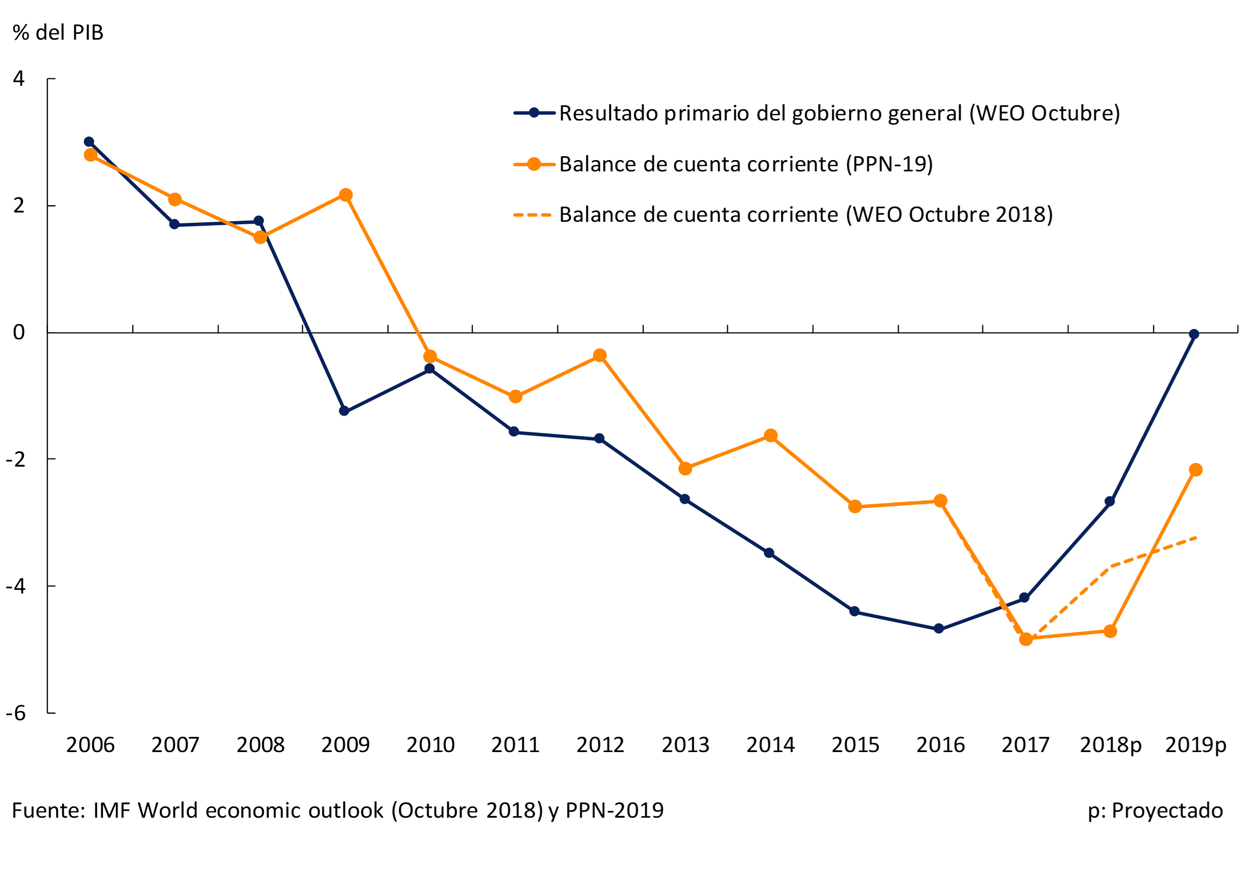 Por otra parte, como se mencionó en el IPOM de Julio, la cosecha esperada para la siguiente campaña se encuentra entre las más elevadas de la historia, lo cual implicaría un marcado aumento de las exportaciones agrícolas en 2019 (en particular del complejo sojero) en relación con la baja base de comparación de 2018. Asimismo, el nuevo sendero de consolidación fiscal previsto, más exigente que el anterior, implicará un cierre más acelerado de la brecha ahorro-inversión del sector público, siendo ésta —como se mencionó— uno de los principales determinantes del déficit de cuenta corriente (ver Apartado 2 / Consolidación fiscal y resultado de la cuenta corriente del IPOM de Julio de 2018).