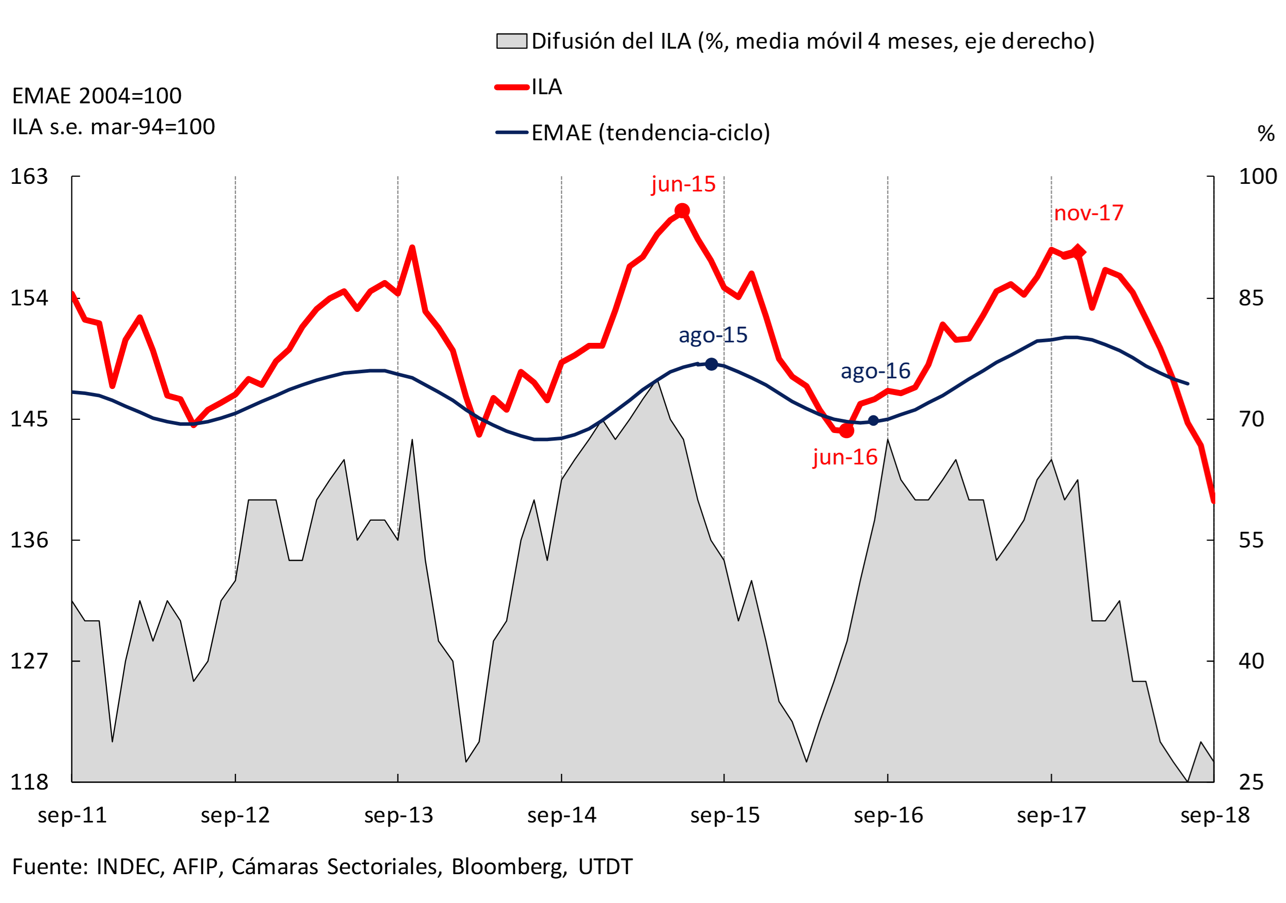 Para el resto del año el Indicador Líder de la Actividad (ILA-BCRA) no permite anticipar un cambio en la fase recesiva iniciada en el segundo trimestre de 2018. En septiembre el ILA registró la séptima caída mensual consecutiva y la difusión del crecimiento se ubicó en 27,5%, cerca de los mínimos históricos8 (ver Gráfico 3.2).