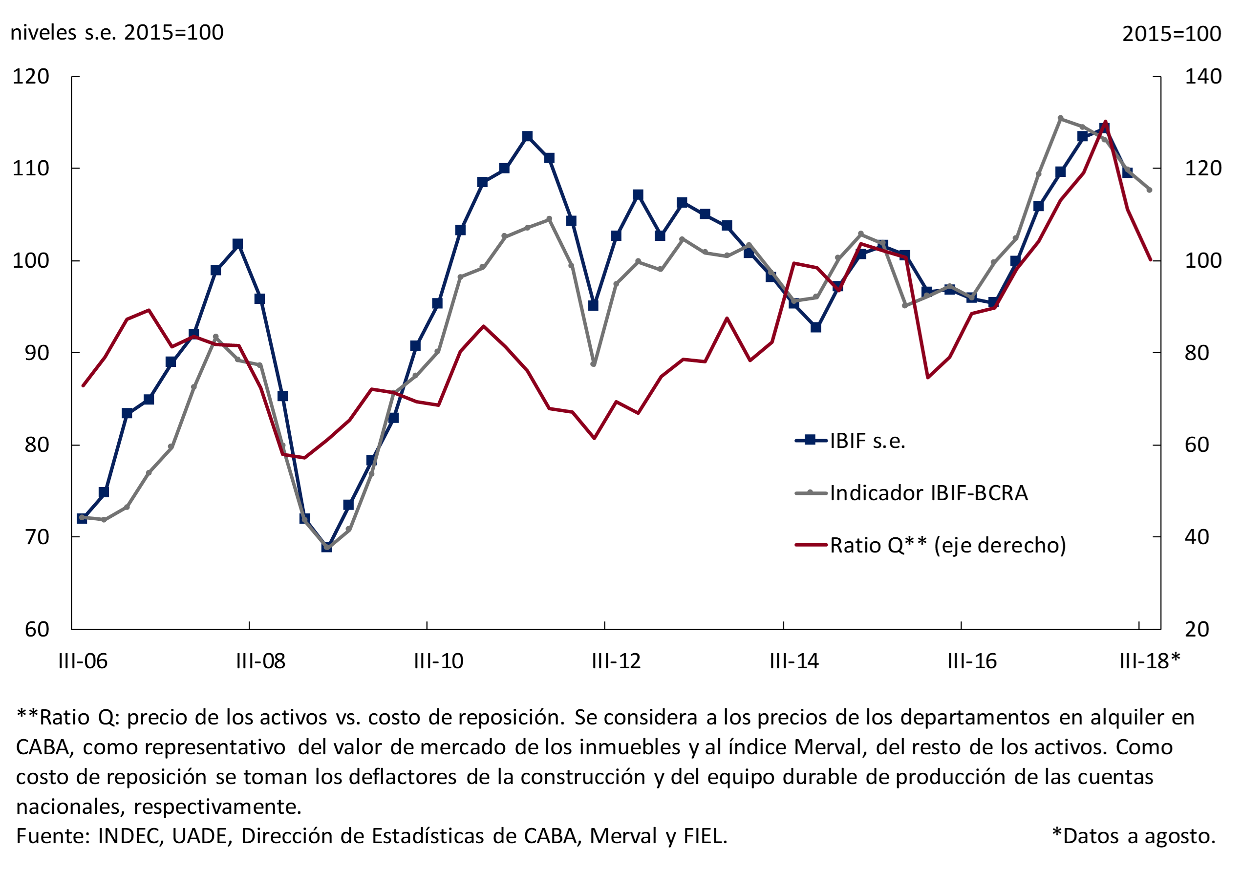 Los indicadores parciales señalan que en el tercer trimestre la inversión continuó en baja. El indicador IBIF-BCRA11 cayó 2,3% s.e. respecto del trimestre anterior en tanto que el Índice Coincidente de Inversión elaborado por la Subsecretaría de Programación Macroeconómica del Ministerio de Hacienda muestra una caída de 5% s.e. Este desempeño puede anticiparse mediante el ratio Q, que relaciona el valor de mercado de los activos con el costo de reposición de los mismos y continuó cayendo hasta agosto (ver Gráfico 3.5).
