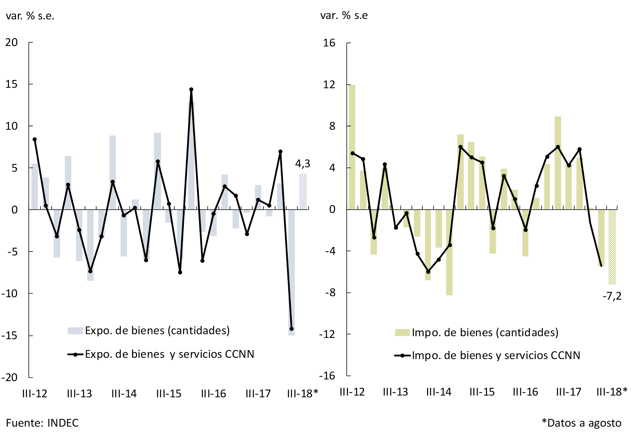 De esta manera, los datos del bimestre julio-agosto confirmaron las tendencias esperadas: las cantidades exportadas de bienes aumentaron 4,3% s.e. en relación con el trimestre anterior y las importadas se redujeron 7,2% s.e. con caídas en todos los usos siendo más notorias las compras asociadas a la inversión. Por el lado de los servicios, se esperan comportamientos similares, destacándose el repunte del turismo receptivo y un marcado descenso del emisivo. En particular en el mes de agosto, la cantidad de turistas extranjeros que ingresaron al país por vía aérea aumentó 7,4% i.a. mientras que la salida al exterior de turistas argentinos por la misma via se redujo 11,9% i.a.