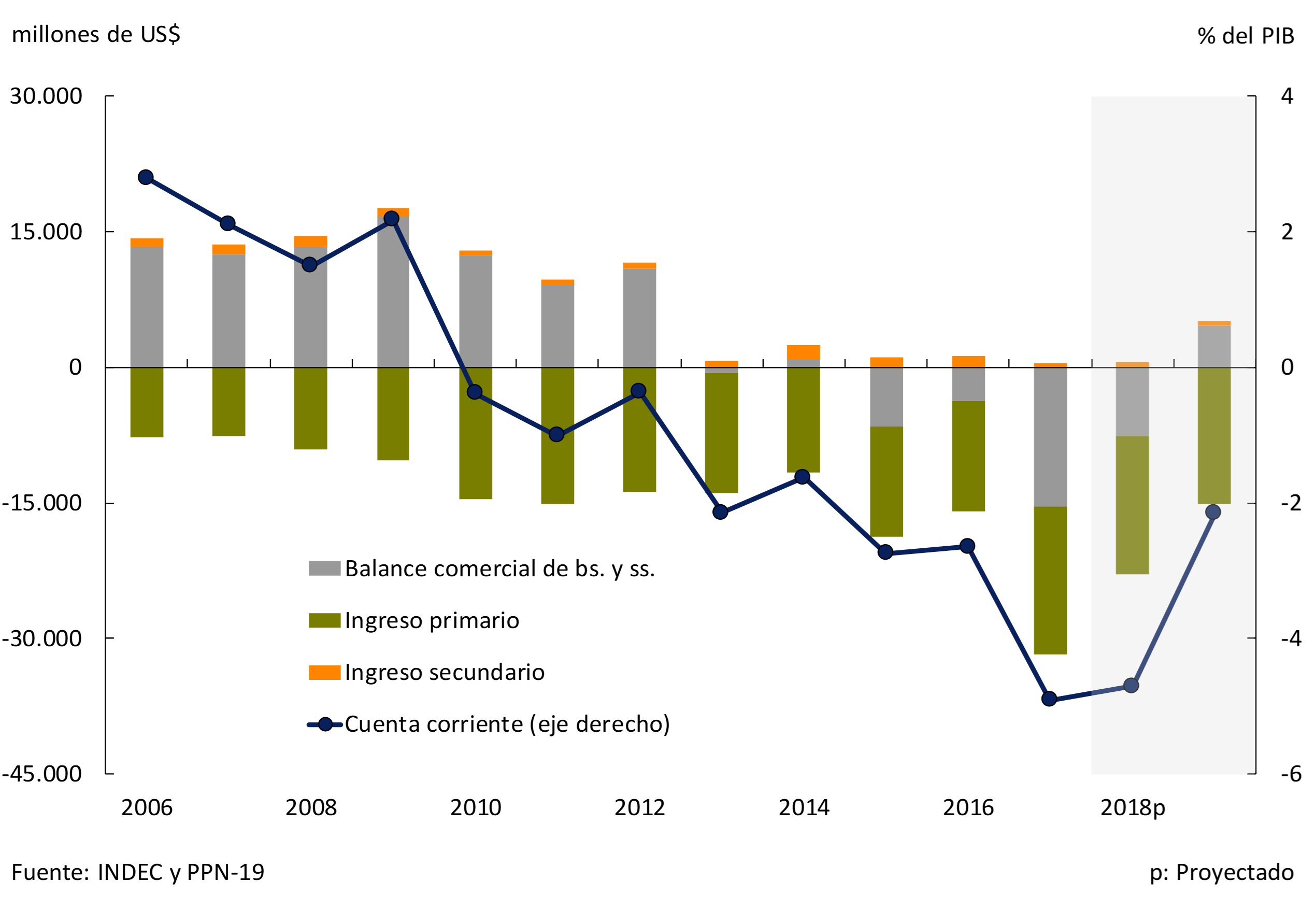 La confluencia de los efectos sustitución (de bienes extranjeros por bienes nacionales) e ingreso (provocada en el corto plazo por la recesión), sumada a los mayores saldos exportables agrícolas, permitiría una reversión del balance comercial de bienes (de una situación deficitaria en 2018 a un superávit proyectado para 2019) y una reducción significativa en el déficit de los servicios. Esto permitiría que Argentina modere considerablemente su déficit de cuenta corriente en 2019 y reduzca así una de sus principales vulnerabilidades.