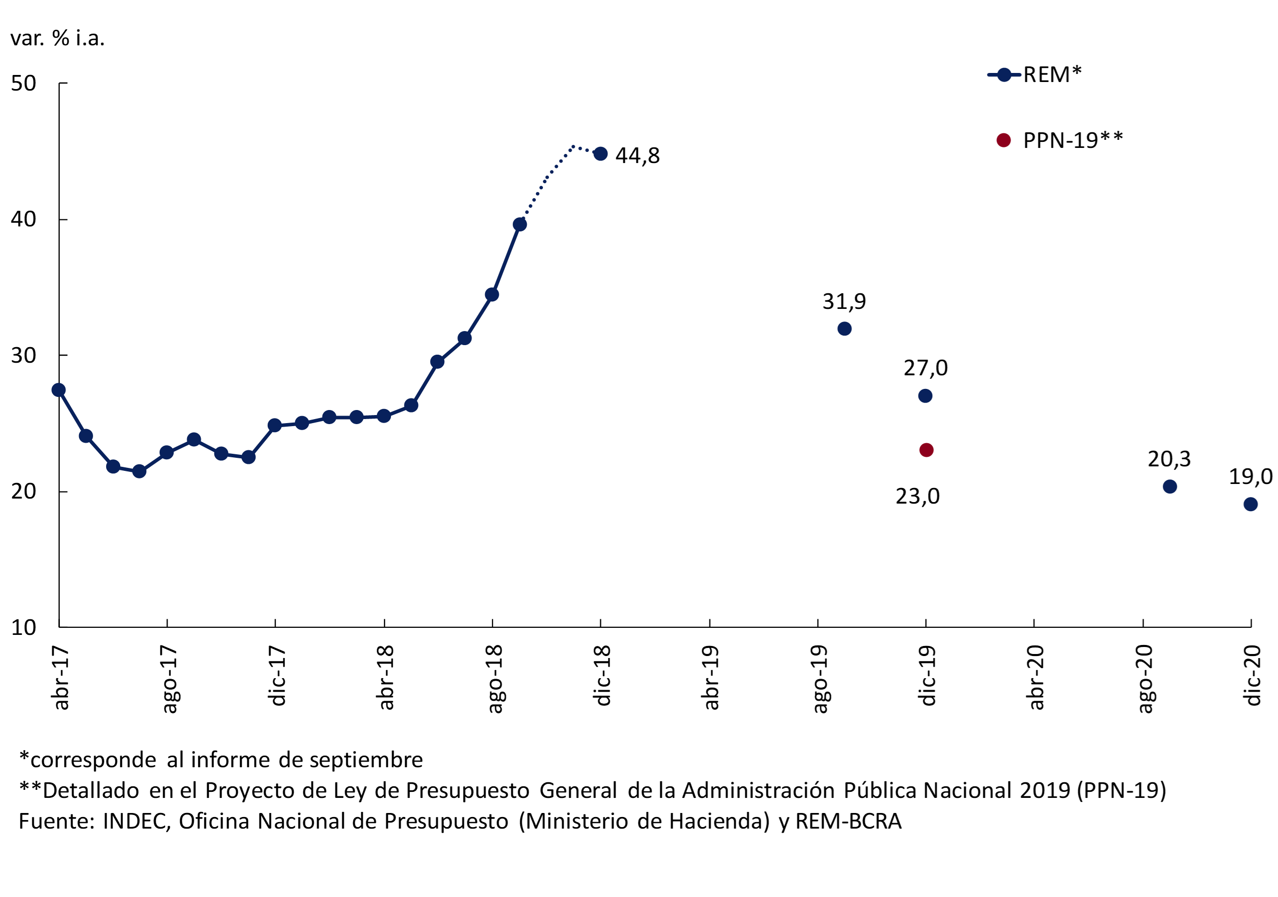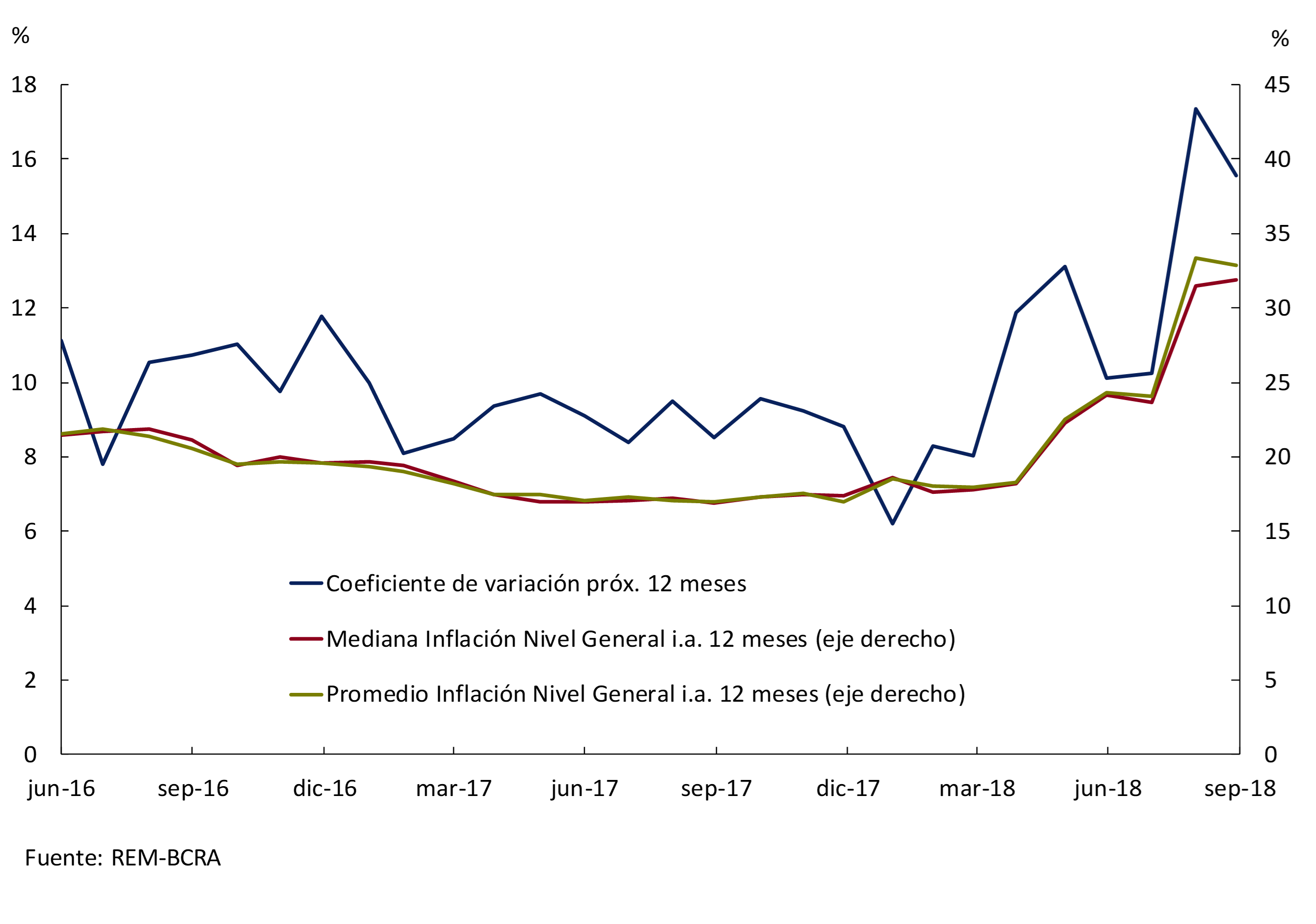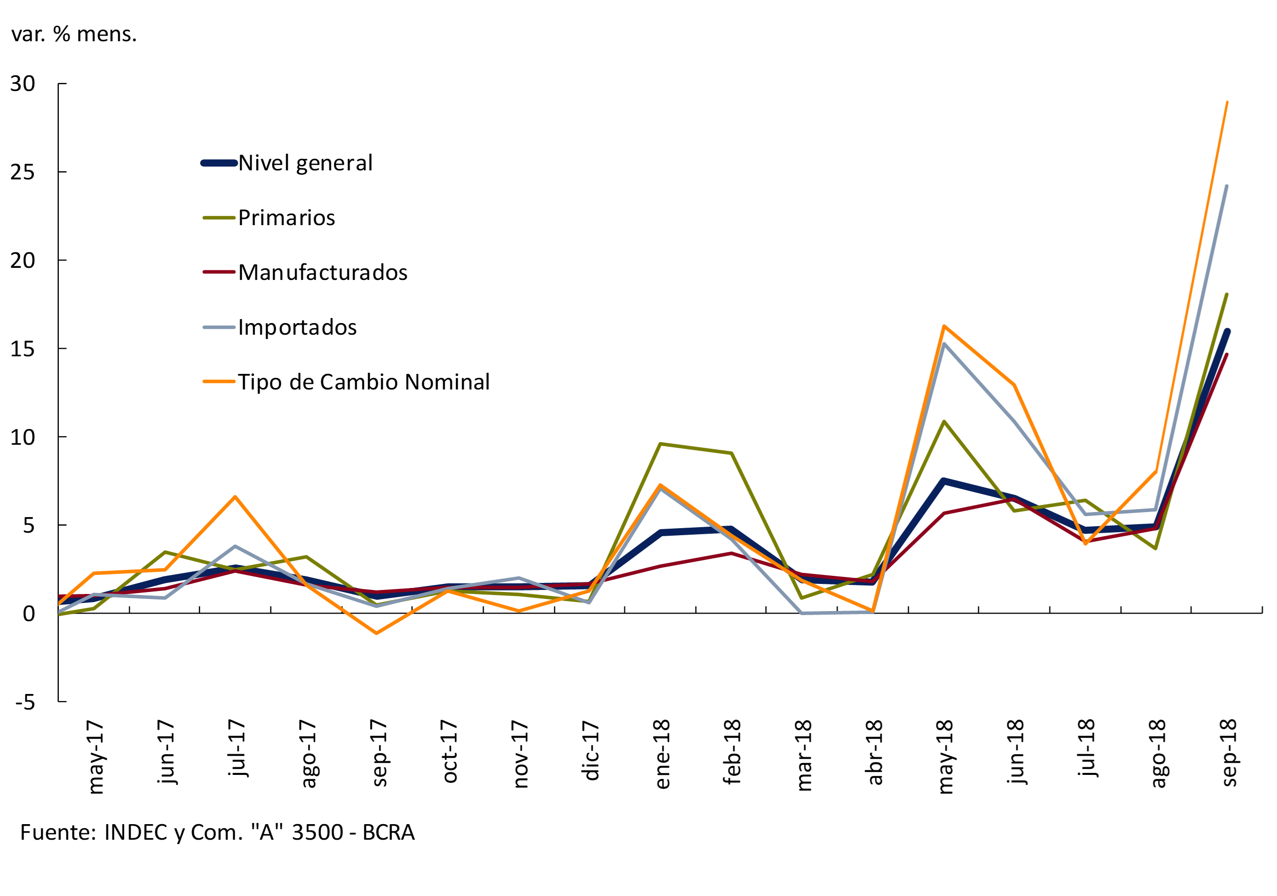 La inflación se aceleró fuertemente en el tercer trimestre de 2018, alcanzando un promedio mensual de 4,5% y un registro de 6,5% en septiembre. Este incremento estuvo asociado a la depreciación del peso, que comenzó en abril pero volvió a marcar un registro elevado a fines de agosto. Este segundo episodio de inestabilidad cambiaria, en agosto, profundizó la incertidumbre, dio lugar a una mayor corrección de precios y planteó el riesgo de un desancle de las expectativas inflacionarias. Las expectativas de inflación a 12 meses de los analistas pasaron de 24,1% a fines de julio a 33,4% a fines de agosto (promedio del Relevamiento de Expectativas de Mercado).