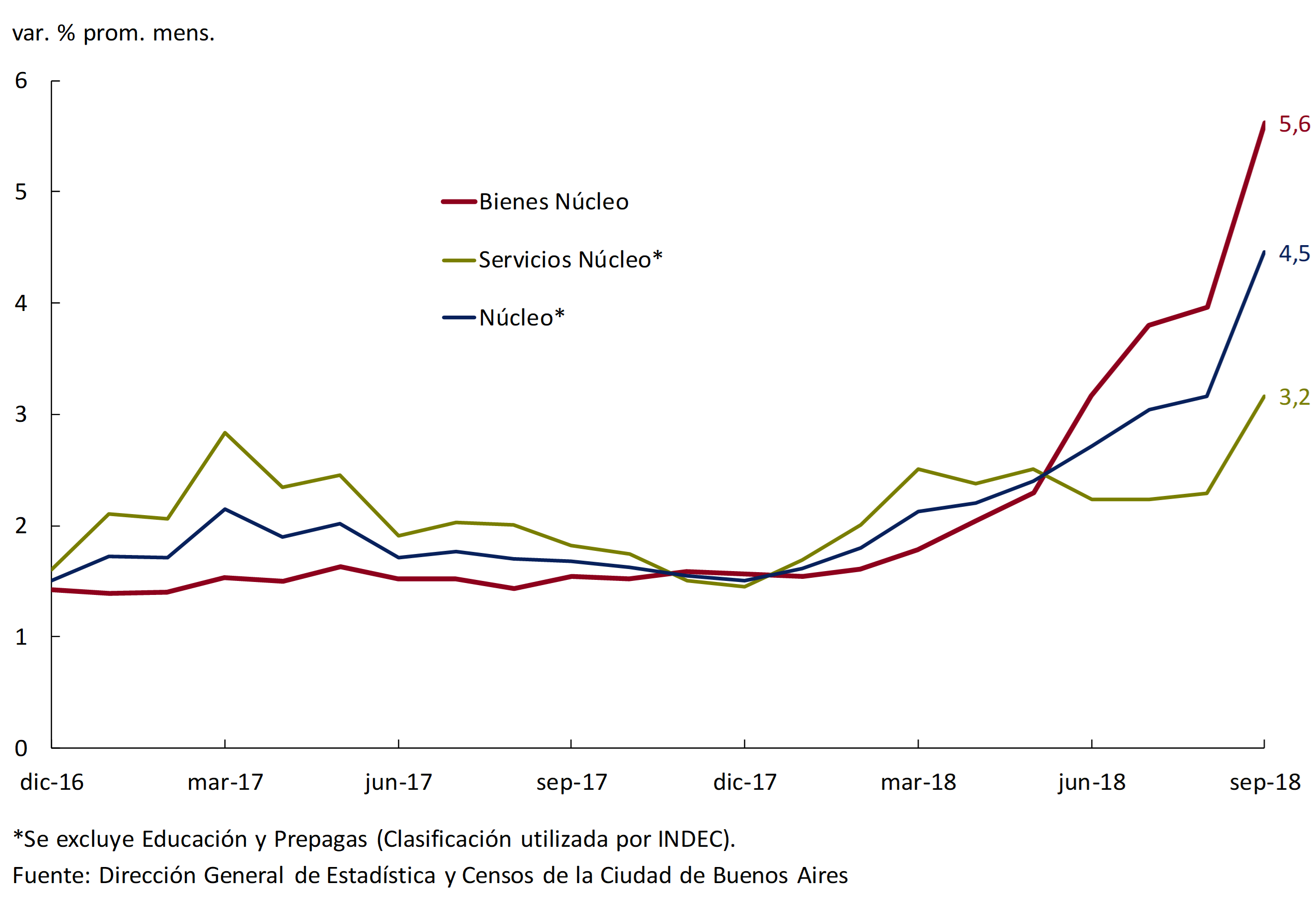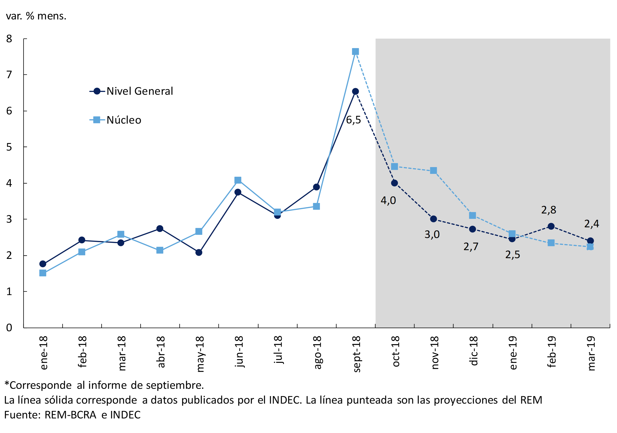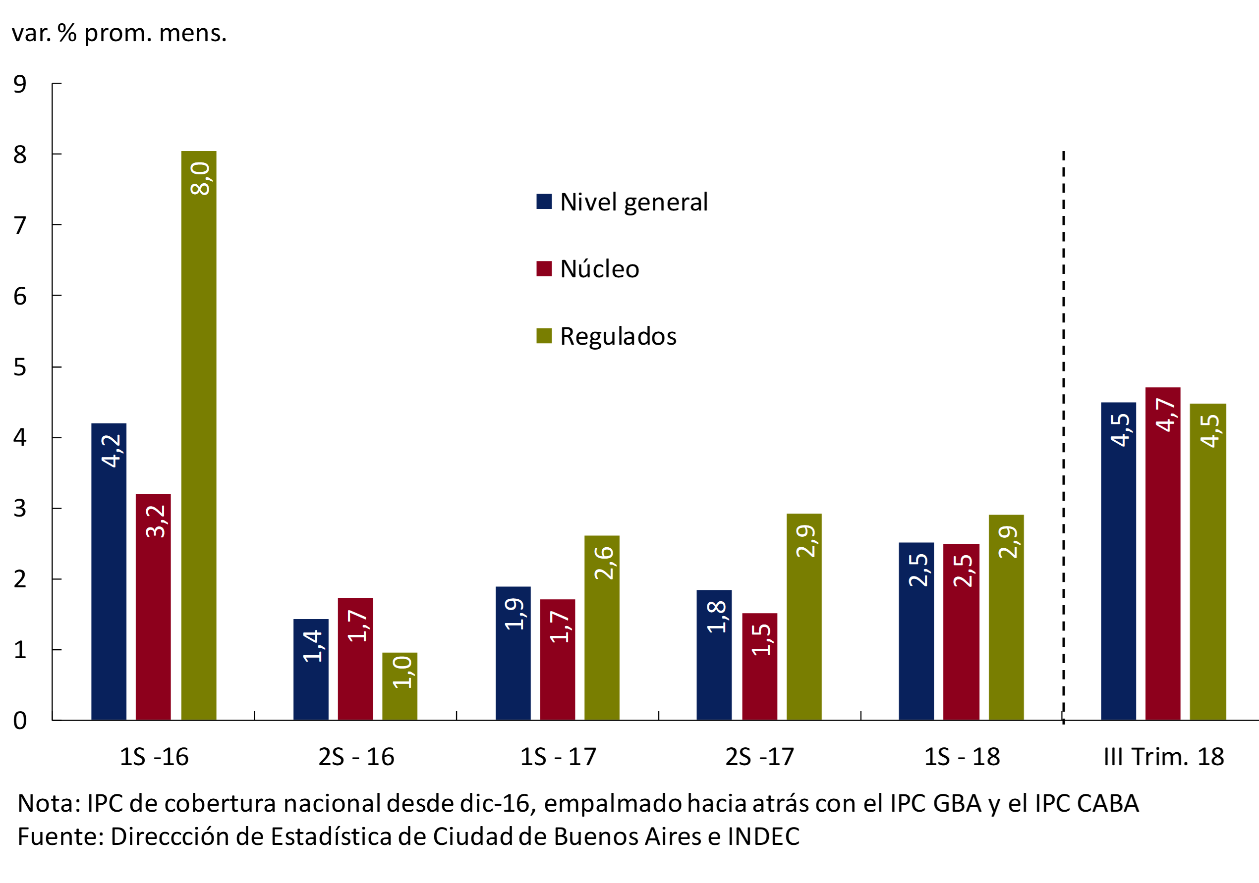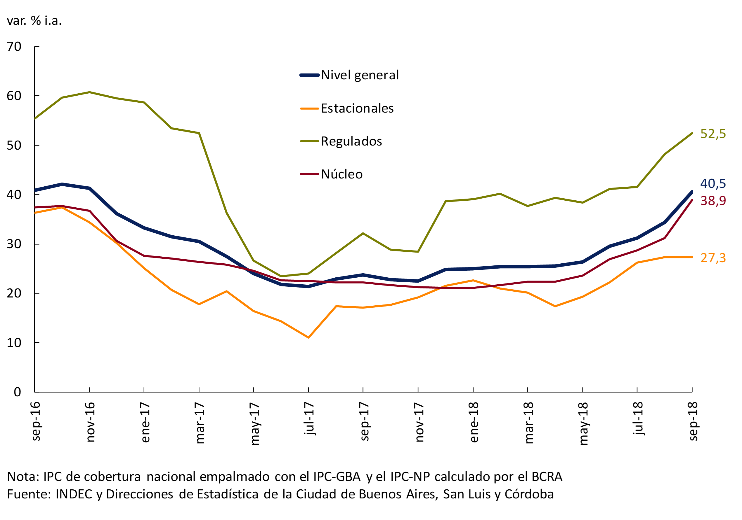 La inflación se aceleró fuertemente en el tercer trimestre de 2018, alcanzando un promedio mensual de 4,5% y un registro de 6,5% en septiembre. Este incremento estuvo asociado a la depreciación del peso, que comenzó en abril pero volvió a marcar un registro elevado a fines de agosto. Este segundo episodio de inestabilidad cambiaria, en agosto, profundizó la incertidumbre, dio lugar a una mayor corrección de precios y planteó el riesgo de un desancle de las expectativas inflacionarias. Las expectativas de inflación a 12 meses de los analistas pasaron de 24,1% a fines de julio a 33,4% a fines de agosto (promedio del Relevamiento de Expectativas de Mercado).