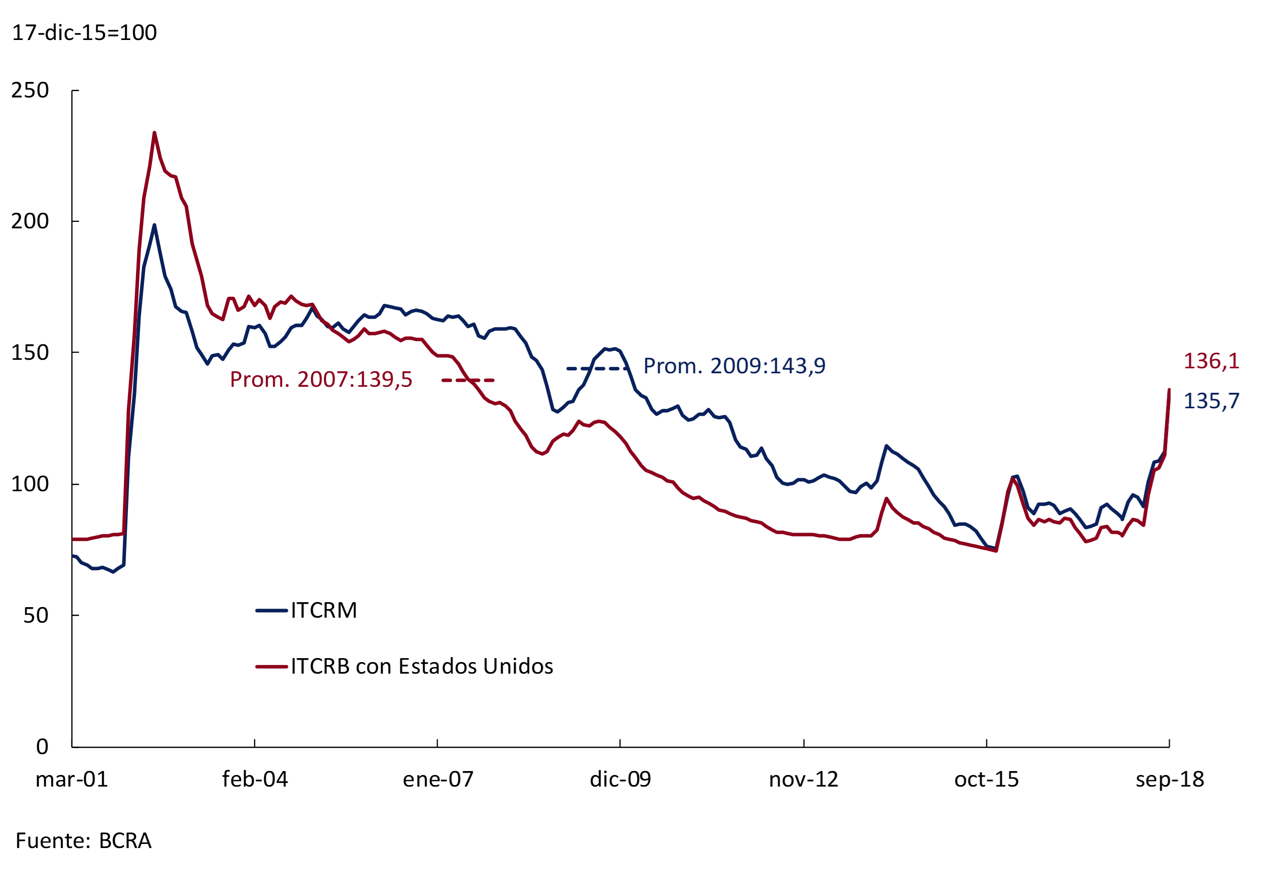 En el tercer trimestre el Índice de Tipo de Cambio Real Multilateral (ITCRM) subió 18% en promedio respecto al segundo trimestre, fundamentalmente por una depreciación nominal del peso frente al dólar. El incremento punta a punta fue aún mayor, 24%. De esta manera el ITCRM se ubicó en septiembre un 21% por encima del promedio de los últimos veinticuatro años (ver Gráfico 2.12). En la comparación con otros países de la región, el peso es la moneda que se encuentra más depreciada respecto a su promedio histórico, lo que le otorga a los bienes domésticos una marcada mejora en la competitividad precio. Esta situación no se daba desde comienzos de 2012, cuando Argentina registraba un superávit comercial de bienes en torno a 2% del PIB.