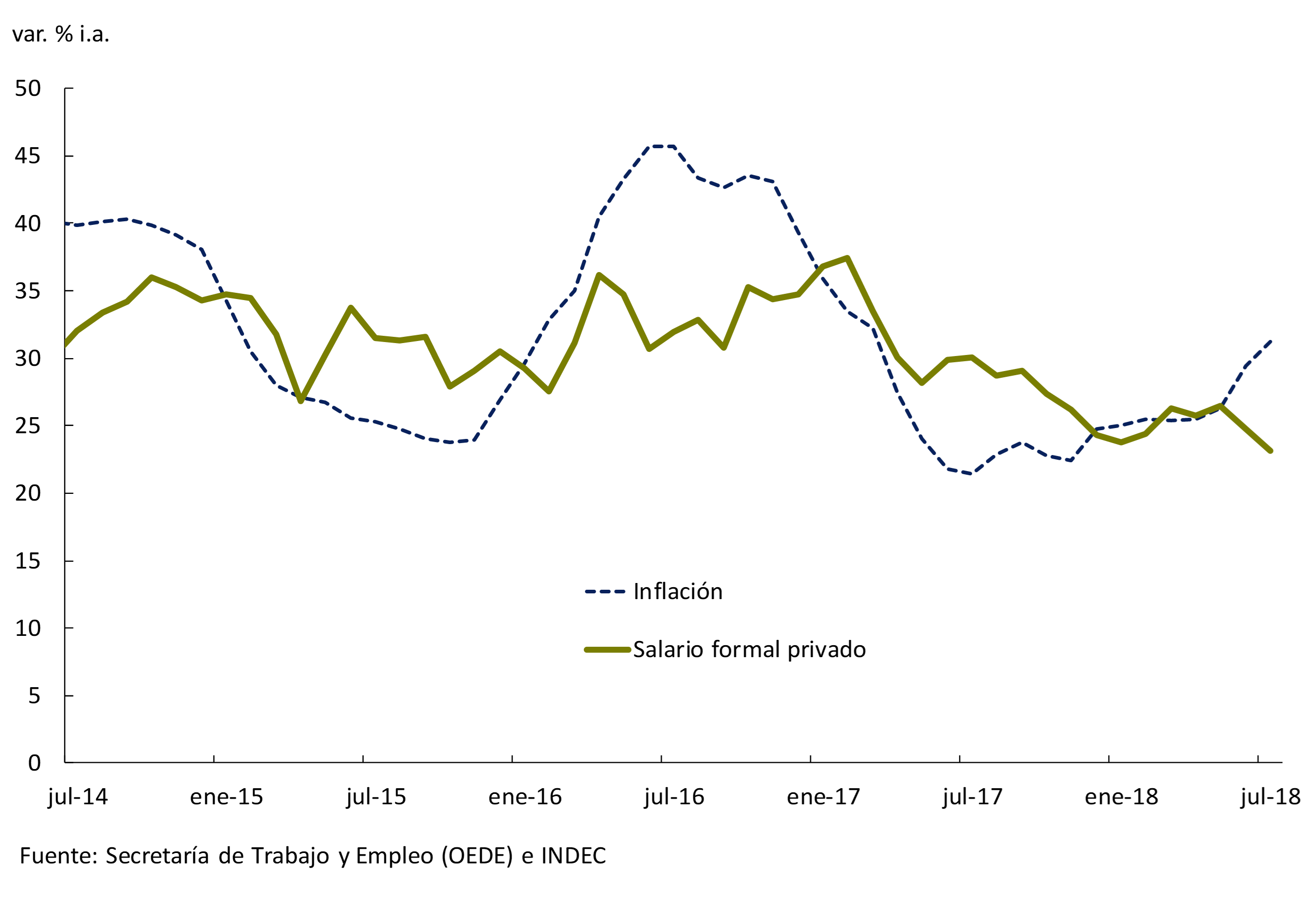En el segundo trimestre de 2018 la fuerte caída de la demanda interna (-2,1% s.e.) se sumó a la contracción de las exportaciones explicada por la sequía que afectó a la producción de soja y maíz.9 El menor ingreso de divisas por el shock de oferta del sector agrícola junto con el deterioro de las condiciones financieras y el fuerte aumento del tipo de cambio, afectaron a los salarios reales provocando una retracción del consumo privado (-1,1% s.e.) y de la inversión (-6,9% s.e.). Los indicadores adelantados permiten anticipar que la contracción de la demanda interna continuó en el tercer trimestre.