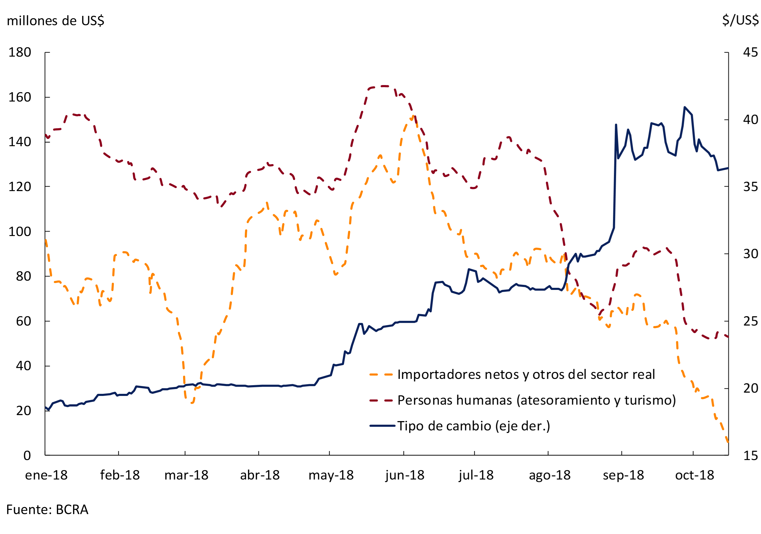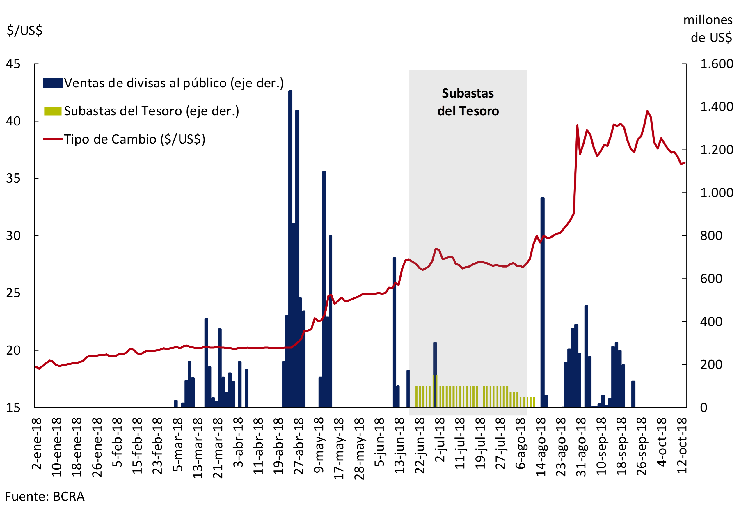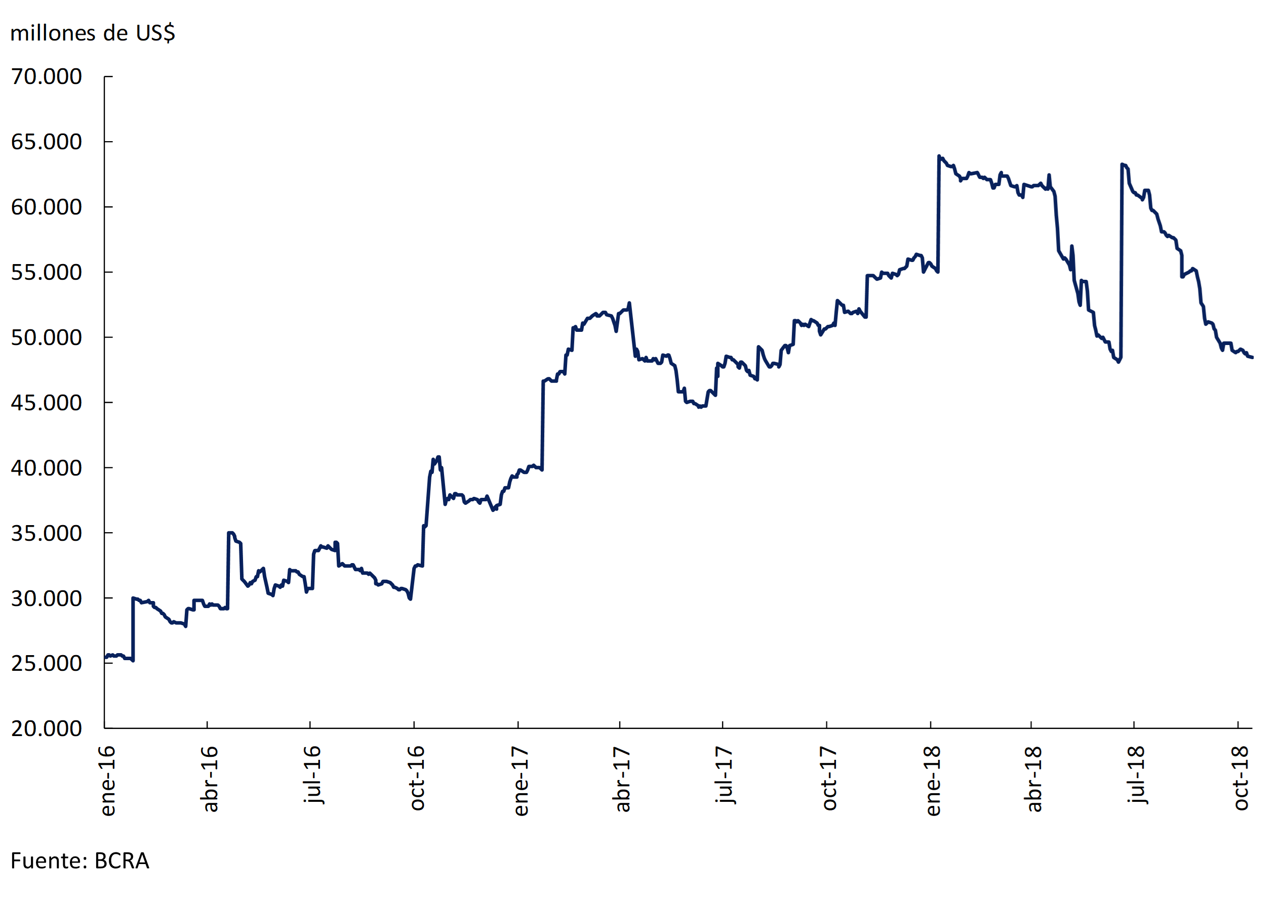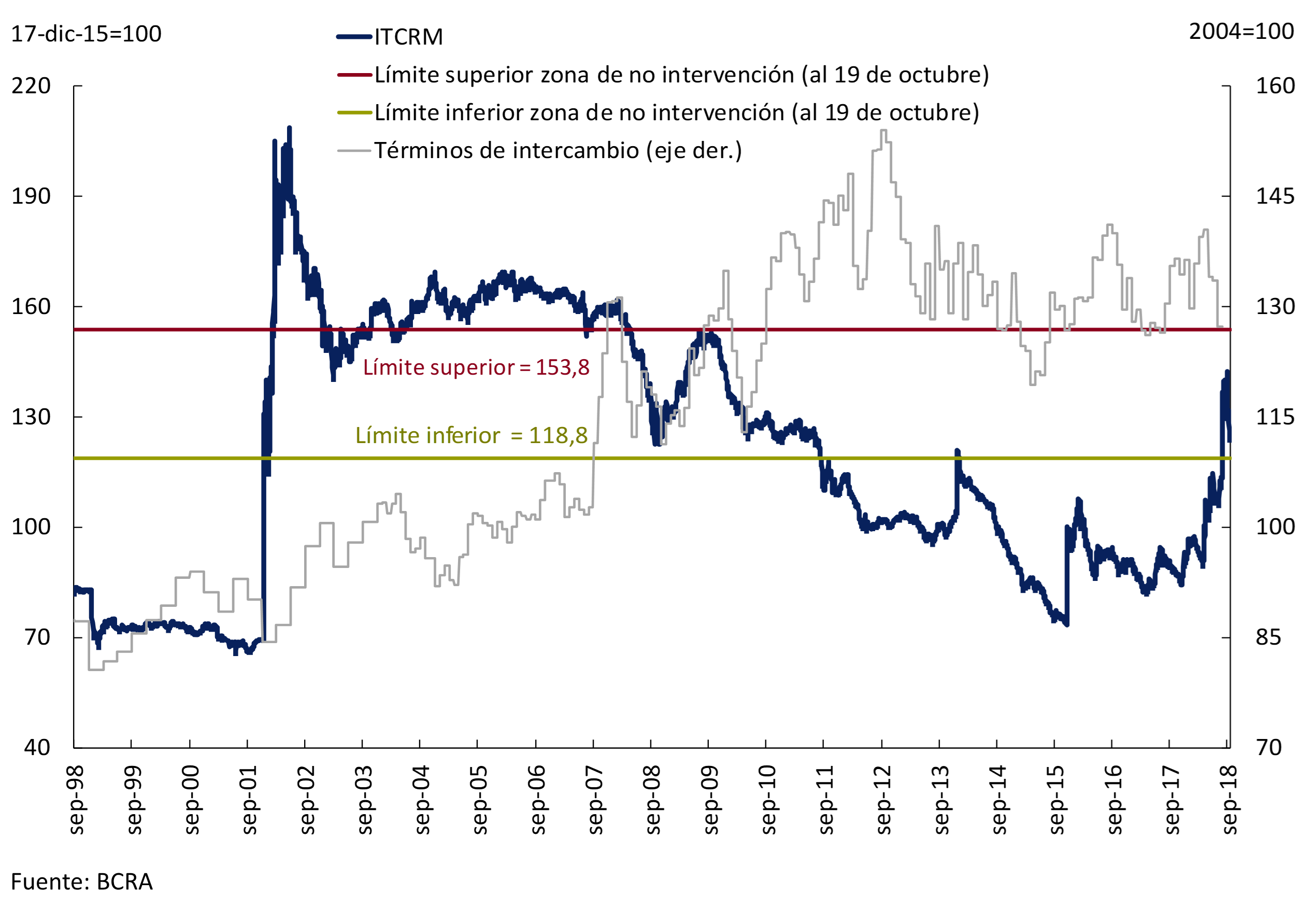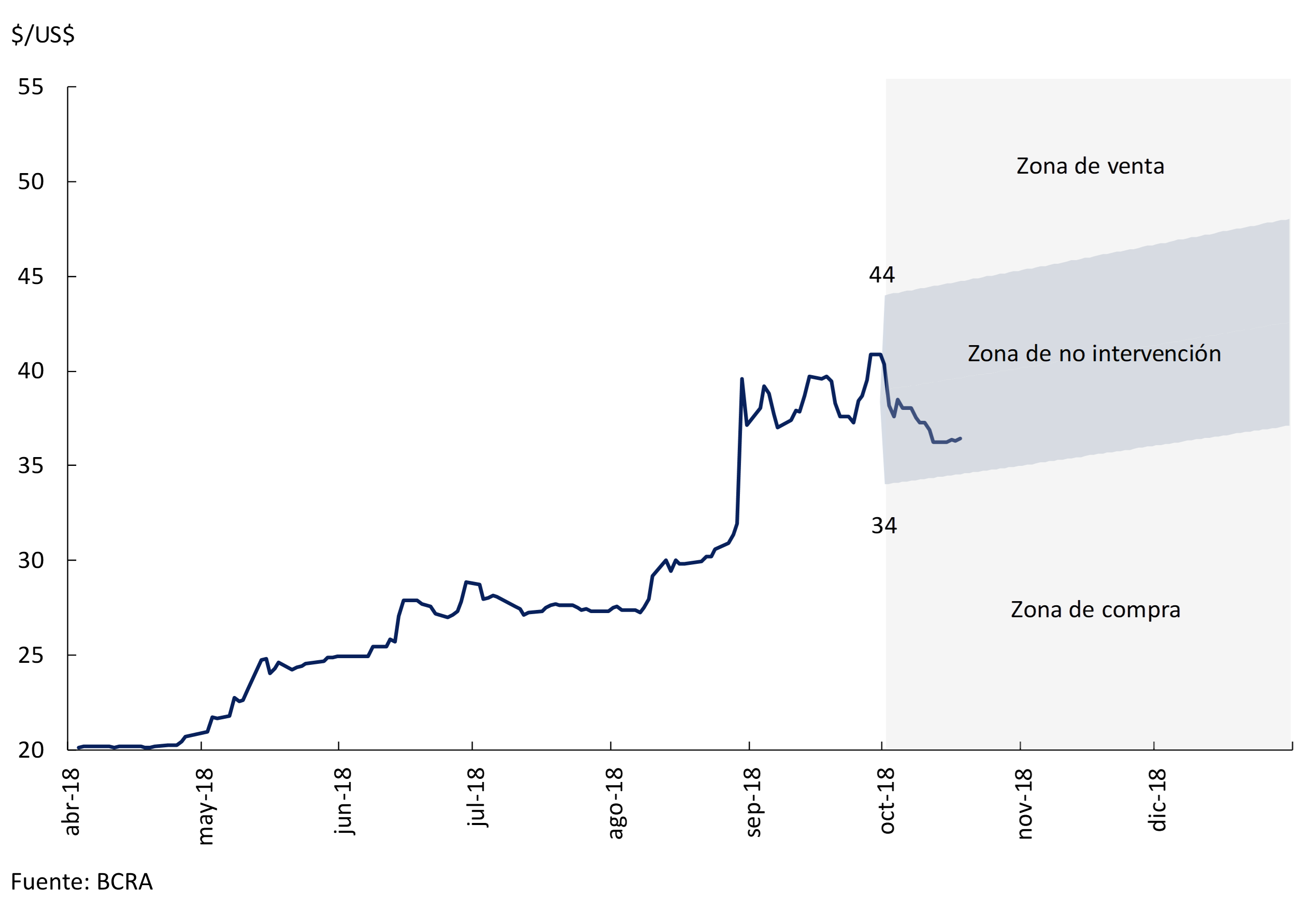 El objetivo de base monetaria se complementa con la definición de zonas de intervención y no intervención cambiaria para el tipo de cambio hasta fin de 2018. La zona de no intervención cambiaria quedó definida el 1º de octubre para un tipo de cambio de 34 pesos por dólar en el límite inferior y 44 pesos por dólar en el superior. Estos límites se ajustan diariamente a una tasa del 3% mensual. Por encima de la zona de no intervención, el BCRA puede realizar ventas de moneda extranjera por hasta 150 millones de dólares diarios, generando una contracción monetaria adicional en momentos de mayor debilidad del peso. De manera opuesta, el BCRA puede realizar compras de moneda extranjera cuando el peso se aprecia y se ubica debajo de la zona de no intervención. El BCRA puede decidir retirar o no los pesos inyectados por la compra de moneda extranjera en la zona de compra, de acuerdo con la marcha de la inflación y sus expectativas. Dentro de la zona de no intervención, el tipo de cambio fluctúa libremente. Este sistema combina adecuadamente los beneficios de la flexibilidad cambiaria para enfrentar shocks reales con la posibilidad de acotar fluctuaciones excesivas y disruptivos que puedan aparecer en un mercado cambiario aún poco profundo como el nuestro.