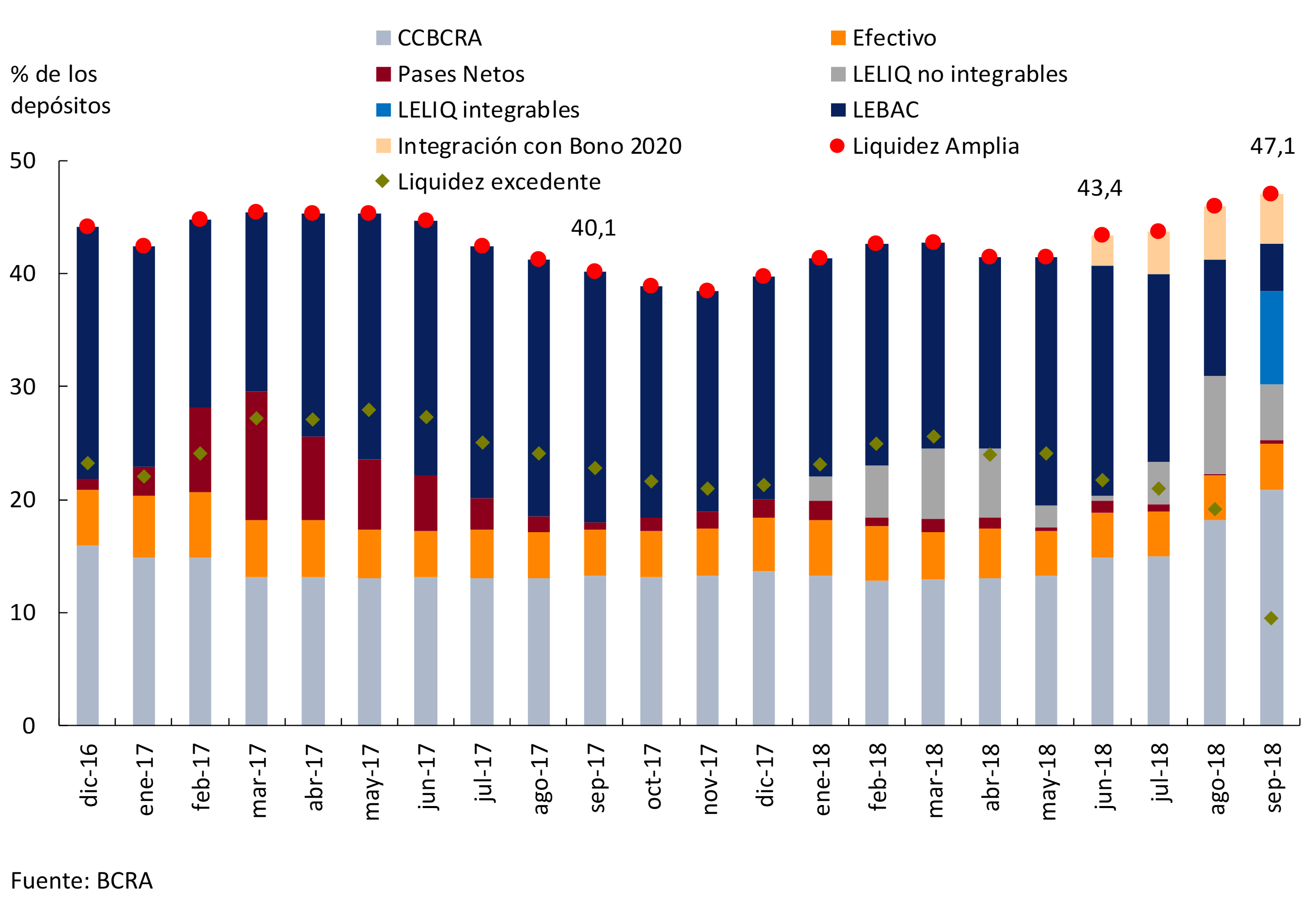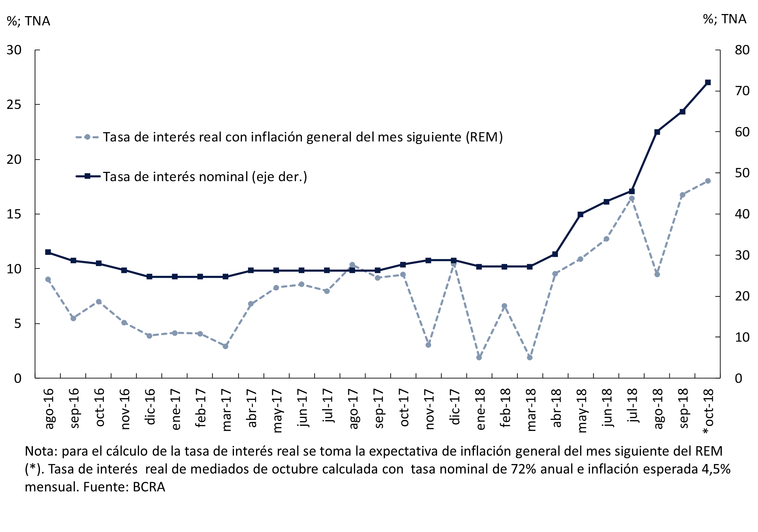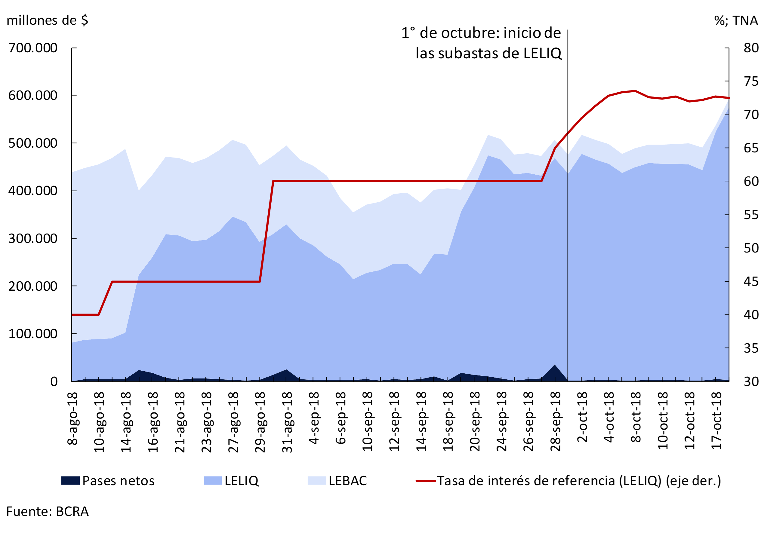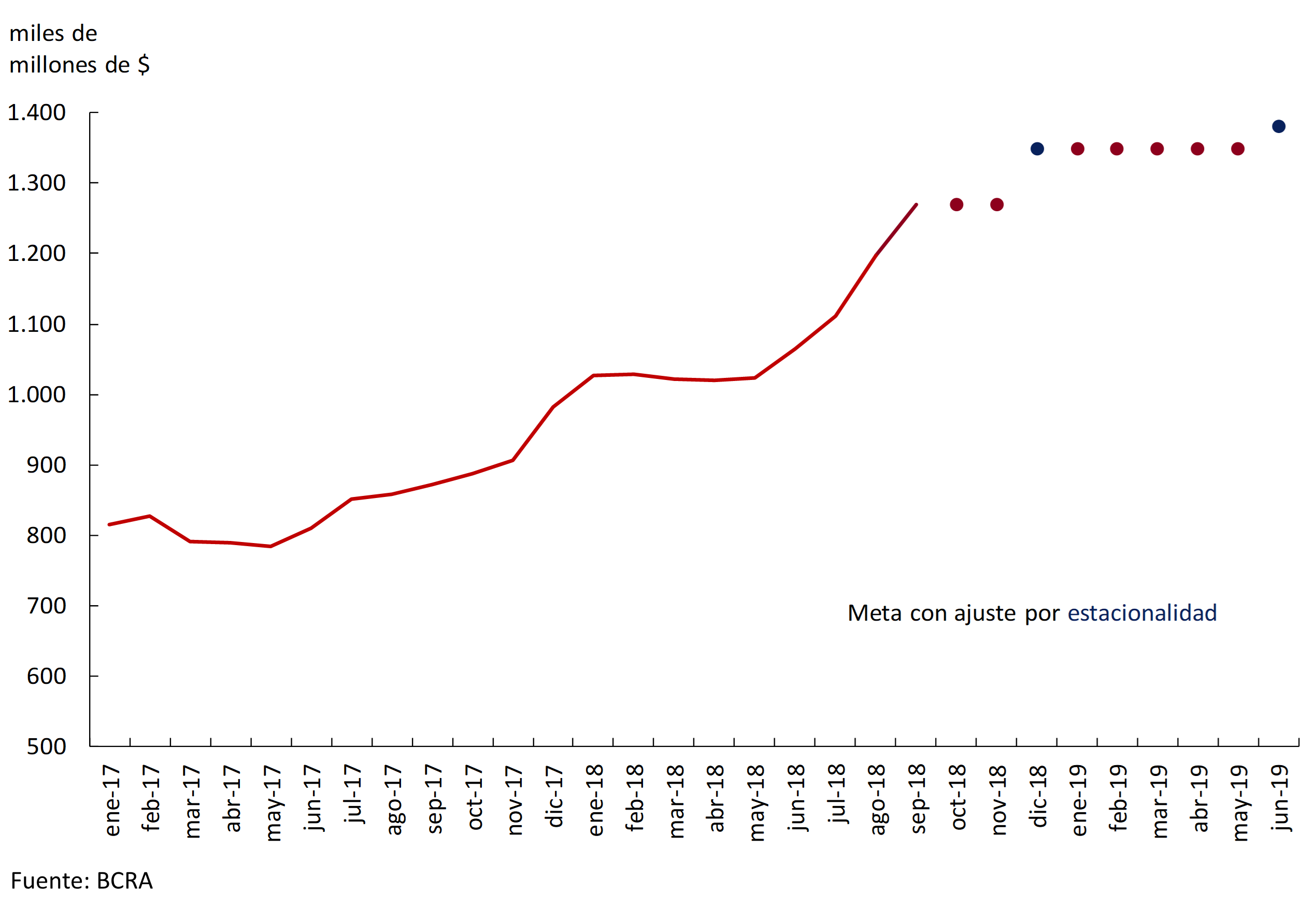 El nuevo régimen de política monetaria que entró en vigencia el 1º de octubre surge de la necesidad de establecer un compromiso concreto y potente, inmediatamente observable y verificable por el público. Así, el Banco Central se compromete a no aumentar la base monetaria hasta junio de 2019. El crecimiento nulo de la base monetaria constituye un compromiso desafiante, ya que este agregado venía creciendo a un ritmo superior al 2% mensual y, dados los aumentos de precios esperados para los próximos meses, la base monetaria real estará disminuyendo en el nuevo esquema. Se eligió este agregado monetario porque es el que está bajo control directo del BCRA. La meta de crecimiento mensual nominal cero de la base monetaria se ajustará con la estacionalidad de los meses de diciembre y junio, cuando se incrementa la demanda de dinero, evitando un excesivo sesgo contractivo en la política monetaria.