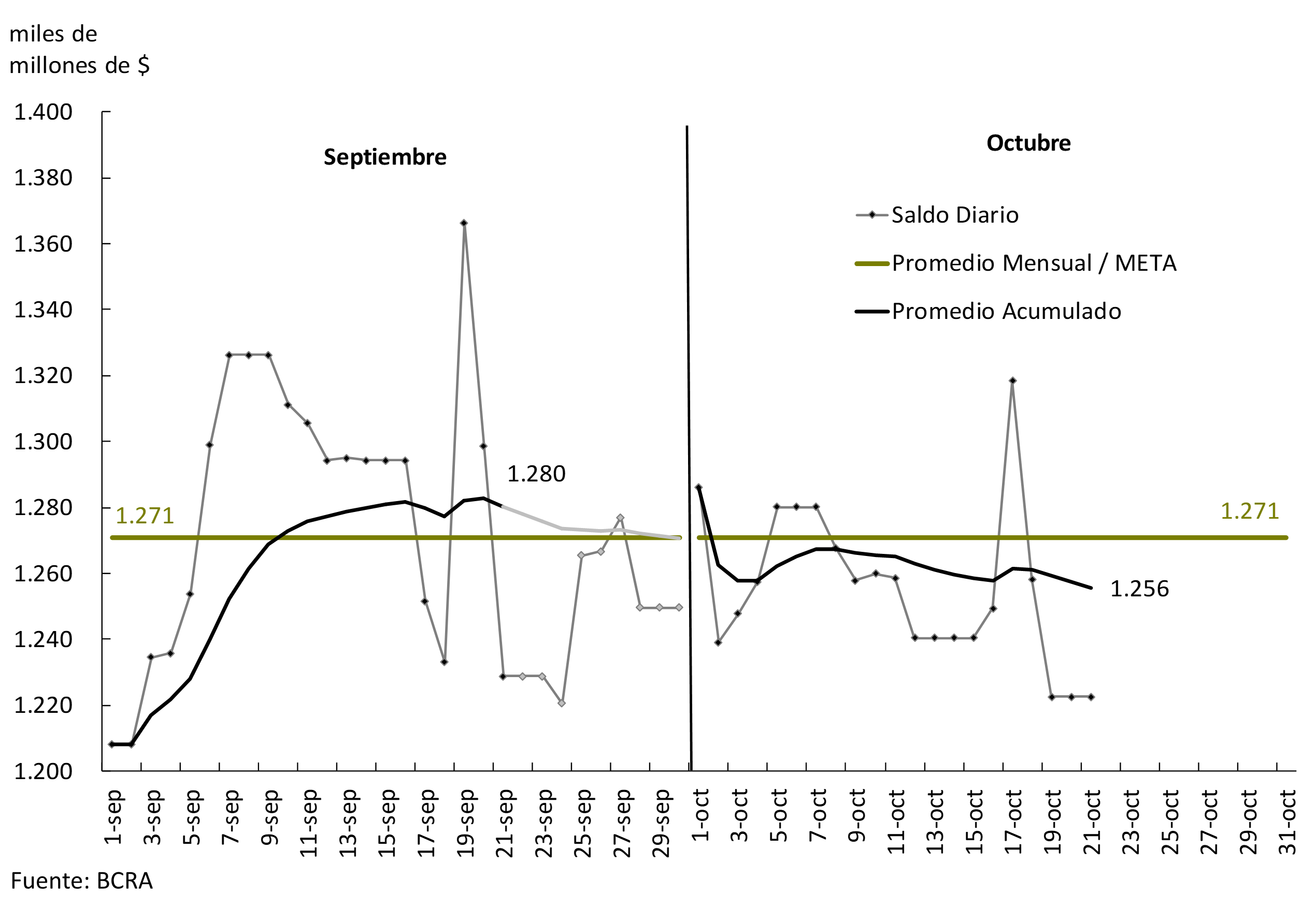 La meta de crecimiento cero de la base monetaria se establece en términos de promedio mensual de esta variable, por lo que la evaluación completa de su cumplimiento en el primer mes de vigencia podrá hacerse una vez finalizado octubre. Sin embargo, para hacer una evaluación preliminar y tomando en cuenta el comportamiento estacional intramensual de la variable, podemos establecer una comparación entre la base monetaria promedio en los primeros 21 días de octubre y su promedio en el mismo período del mes previo. Vemos que la base monetaria se redujo en 24,5 miles de millones de pesos. Esta reducción requirió en este período un esfuerzo adicional, ya que en las primeras dos semanas de septiembre el coeficiente de los encajes no remunerados era más bajo. Si se corrigiera la base monetaria de septiembre por este factor, el promedio de octubre hasta el día 21 sería 60,5 mil millones de pesos menor que el del mismo período de septiembre.