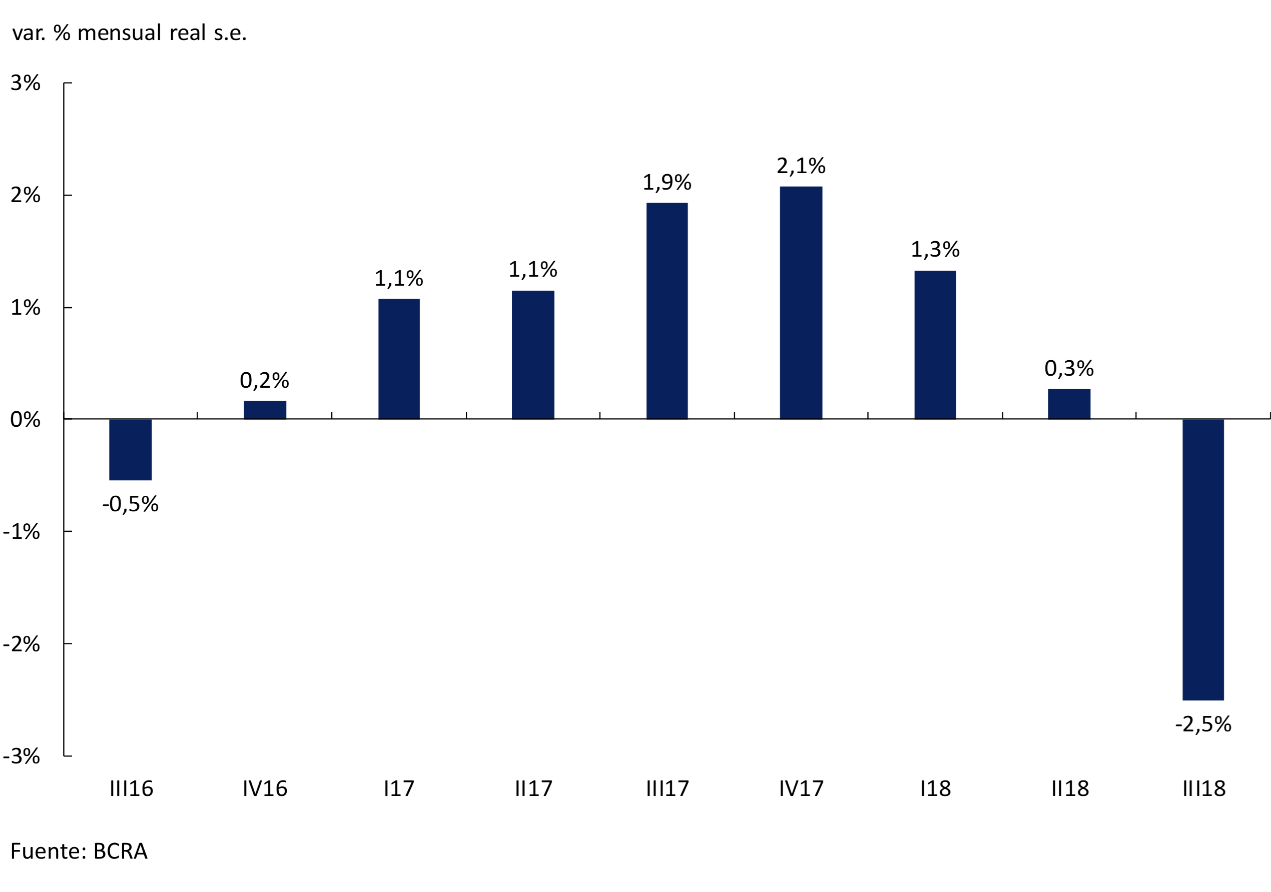 El nuevo marco de política monetaria del BCRA busca moderar la volatilidad cambiaria y reducir paulatinamente la inflación. Por su parte, el Poder Ejecutivo decidió acelerar el proceso de consolidación fiscal, condición necesaria para reducir el costo del financiamiento y disminuir la inestabilidad financiera y cambiaria. Hacia fines de septiembre se alcanzó un nuevo acuerdo con el equipo técnico del FMI con el objetivo de despejar la incertidumbre sobre el programa financiero de 2019. En los próximos meses, la economía irá transitando la corrección de los déficits externo y fiscal, permitiendo iniciar una recuperación durante 2019 sobre bases más sustentables.