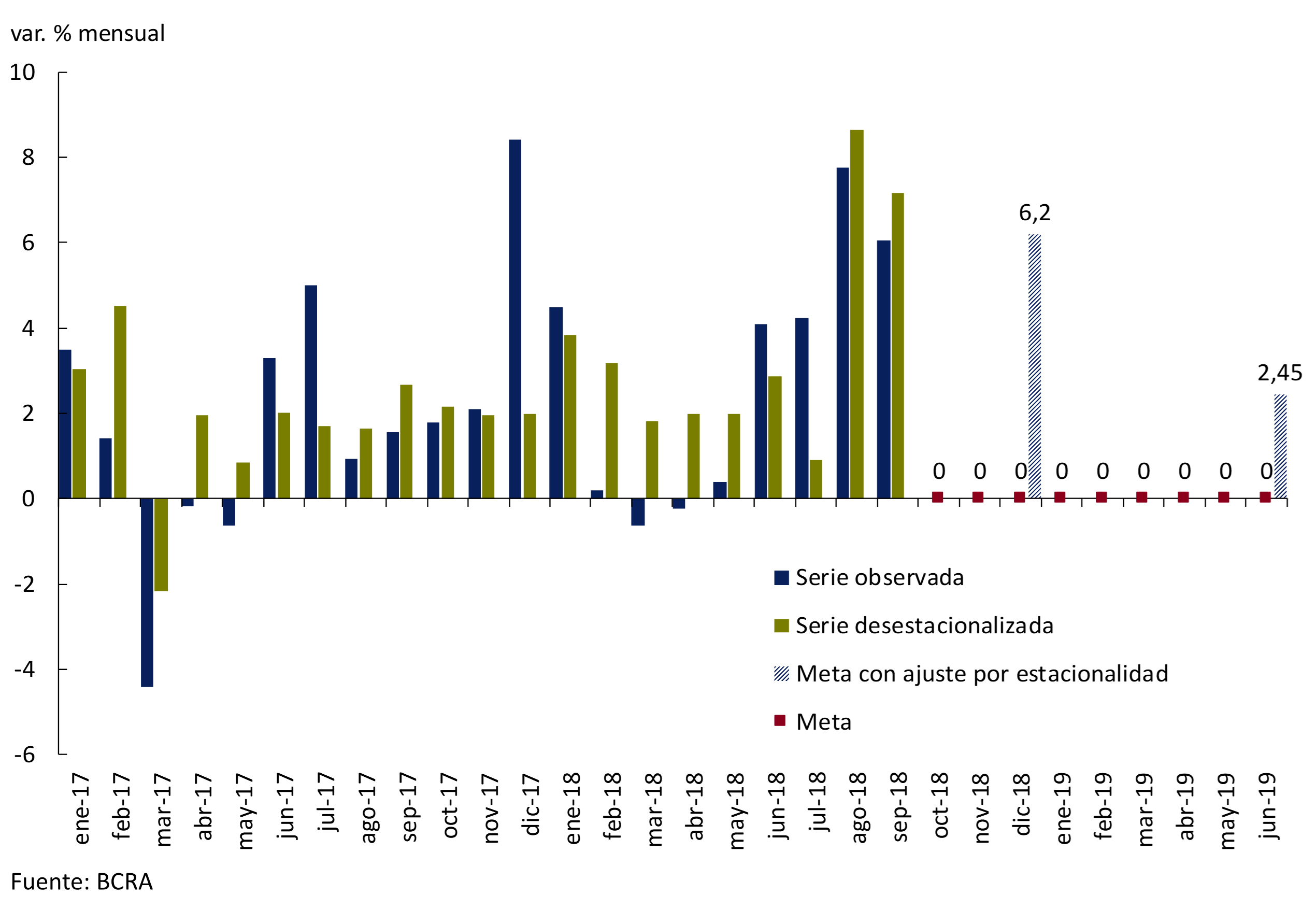 La visión del BCRA es que el plan monetario de crecimiento cero de la base monetaria, en conjunto con el anuncio de déficit fiscal primario cero para 2019 realizado por el Ministerio de Hacienda, es la herramienta necesaria para comenzar a reducir esta incertidumbre y disminuir tanto las expectativas como las tasas de inflación en los próximos meses. La autoridad monetaria considera además que es necesario reducir dicha incertidumbre para que la actividad económica pueda comenzar el camino de una recuperación sobre bases sustentables.