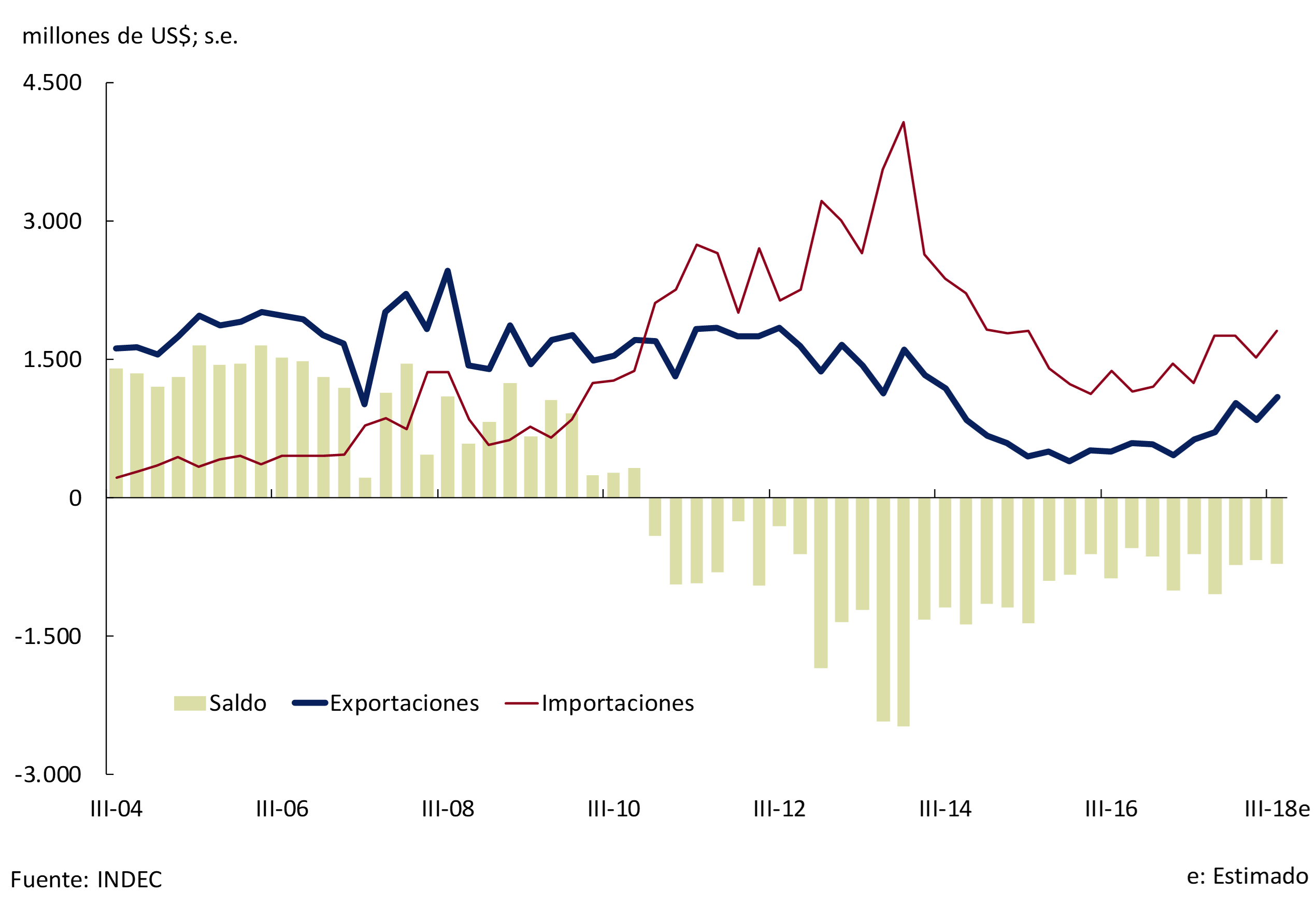 Se espera que la depreciación real del peso y la menor absorción doméstica contribuyan a un significativo ajuste del desbalance externo a partir del tercer trimestre de 2018. Sobre las importaciones se espera que influya el “efecto ingreso” negativo vinculado con el menor nivel de actividad económica. También existe evidencia empírica que indica que un cambio de gran magnitud en los precios relativos provoca un “efecto sustitución” en los patrones de gasto a favor de los bienes nacionales14 y limita la compra de bienes extranjeros. La perspectiva sobre el modo por el cual se reducirá el actual déficit de cuenta corriente aún presenta rasgos característicos de los ajustes típicos que experimentó históricamente la economía argentina: una preponderancia del efecto ingreso sobre el efecto sustitución. A futuro, y a medida que se consolide el régimen cambiario de flotación, se espera que los ajustes externos sean más suaves (ver Apartado 1 / Flotación cambiaria y volatilidad de la cuenta corriente del IPOM de Octubre de 2017).