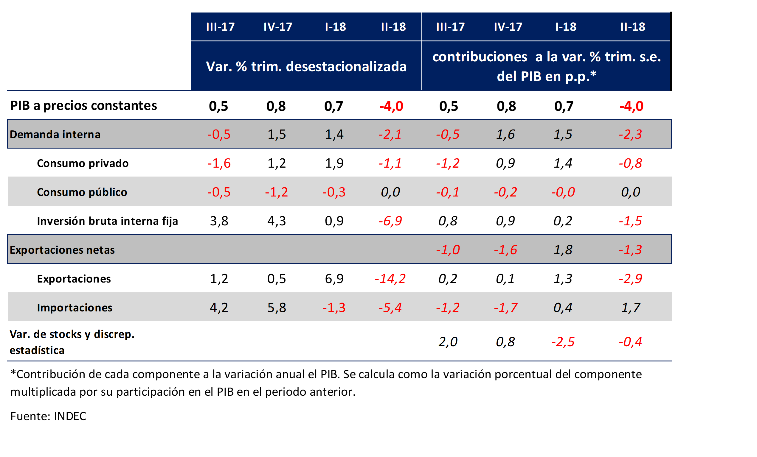 El consumo y la inversión, tanto pública como privada, cayeron nuevamente mientras que las exportaciones netas contribuyeron positivamente a la variación trimestral del producto. A nivel sectorial la caída fue difundida, siendo parcialmente compensada por la normalización de la actividad agrícola y la tendencia creciente de algunas actividades como la ganadería, el petróleo y el gas.