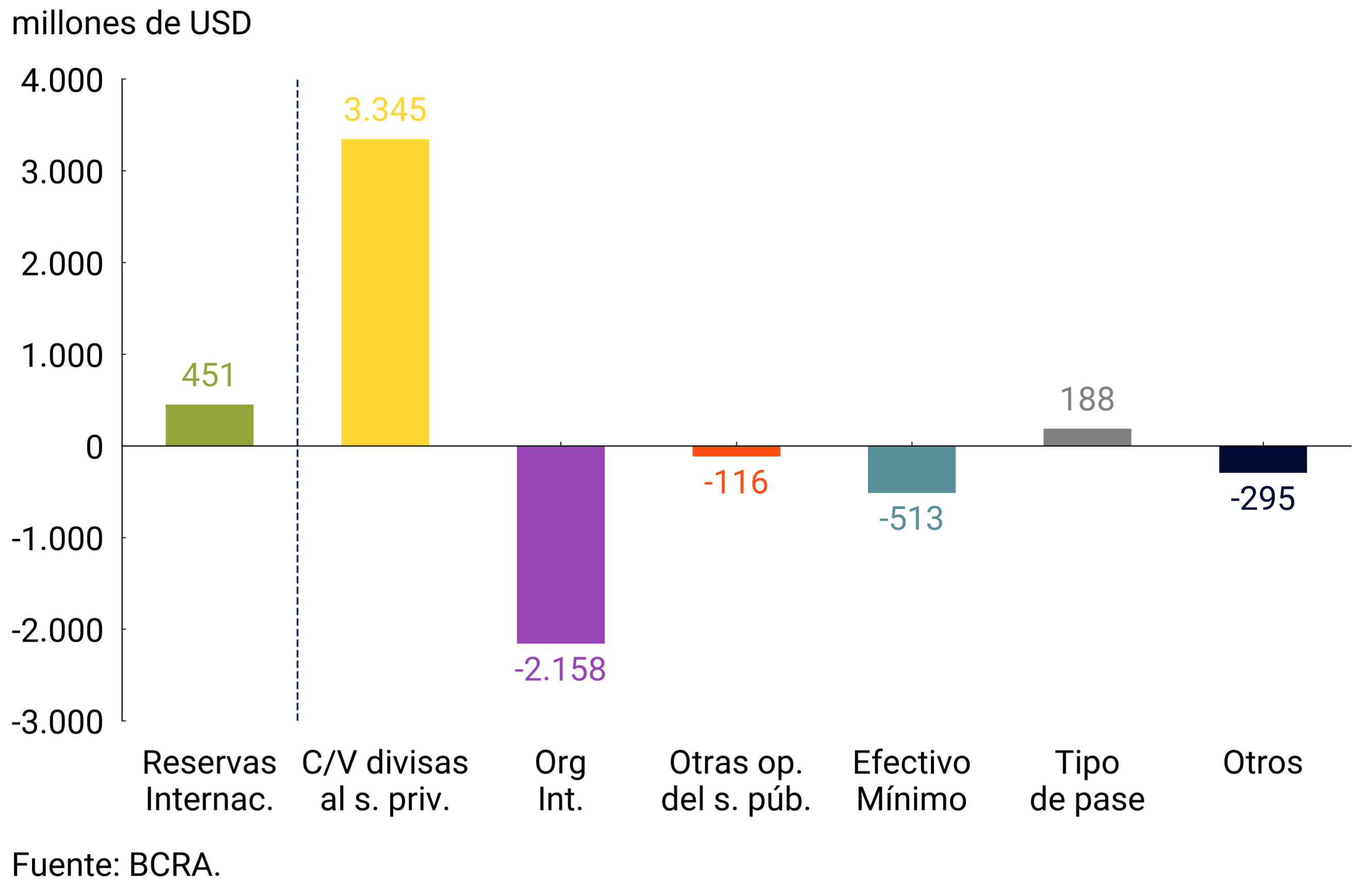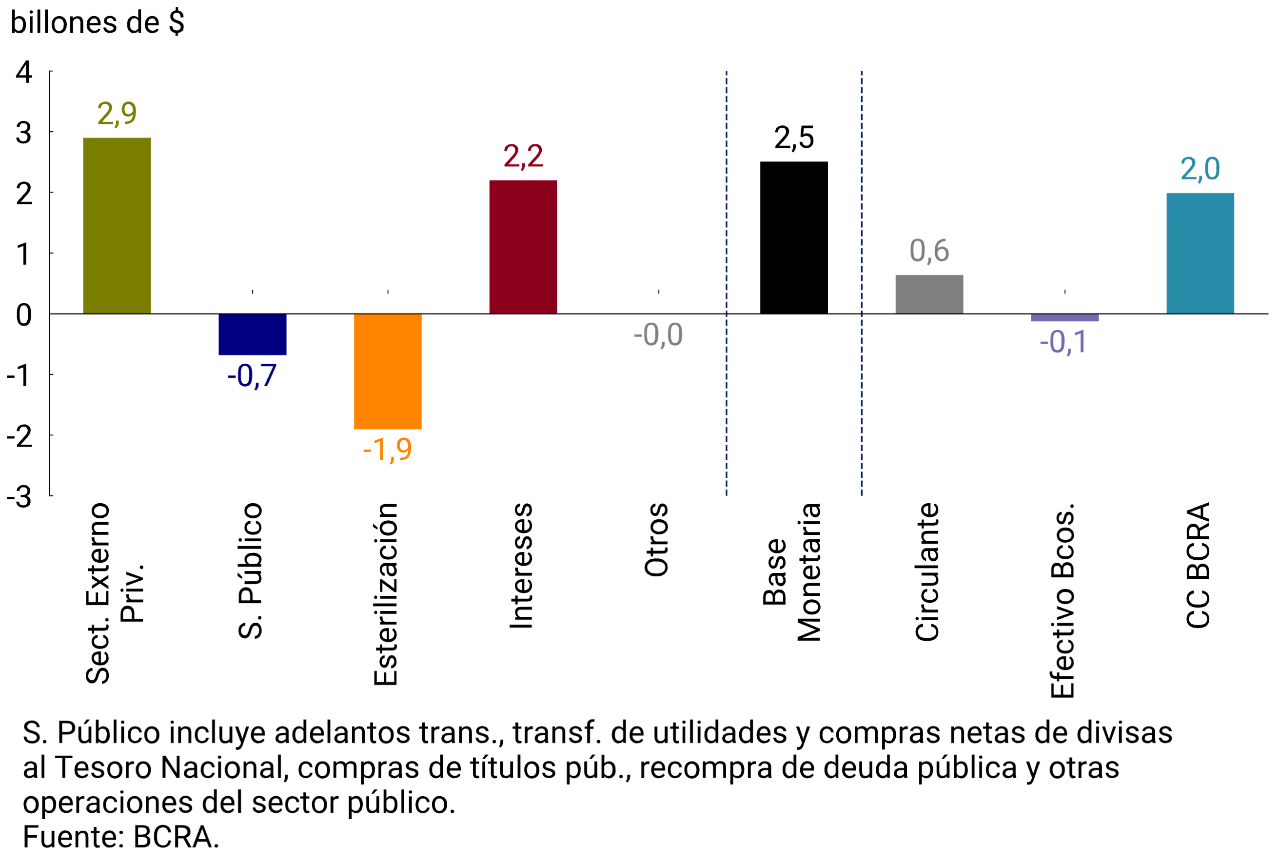 En tanto, las operaciones vinculadas al sector público resultaron contractivas, compensando parcialmente la expansión generada por los factores antes mencionados. Las operaciones en el mercado secundario con títulos del Tesoro Nacional (incluyendo las ejecuciones de las opciones de venta de títulos públicos por parte de las entidades financieras) fueron más que compensadas por el efecto de las ventas de divisas al Tesoro Nacional. En efecto, el fisco nacional utilizó parte de los pesos resultantes de las licitaciones del mes a la compra de divisas para hacer frente a pagos externos. De esta manera, las operaciones vinculadas con el sector público han generado una contracción de $3,4 billones desde el inicio de la gestión.