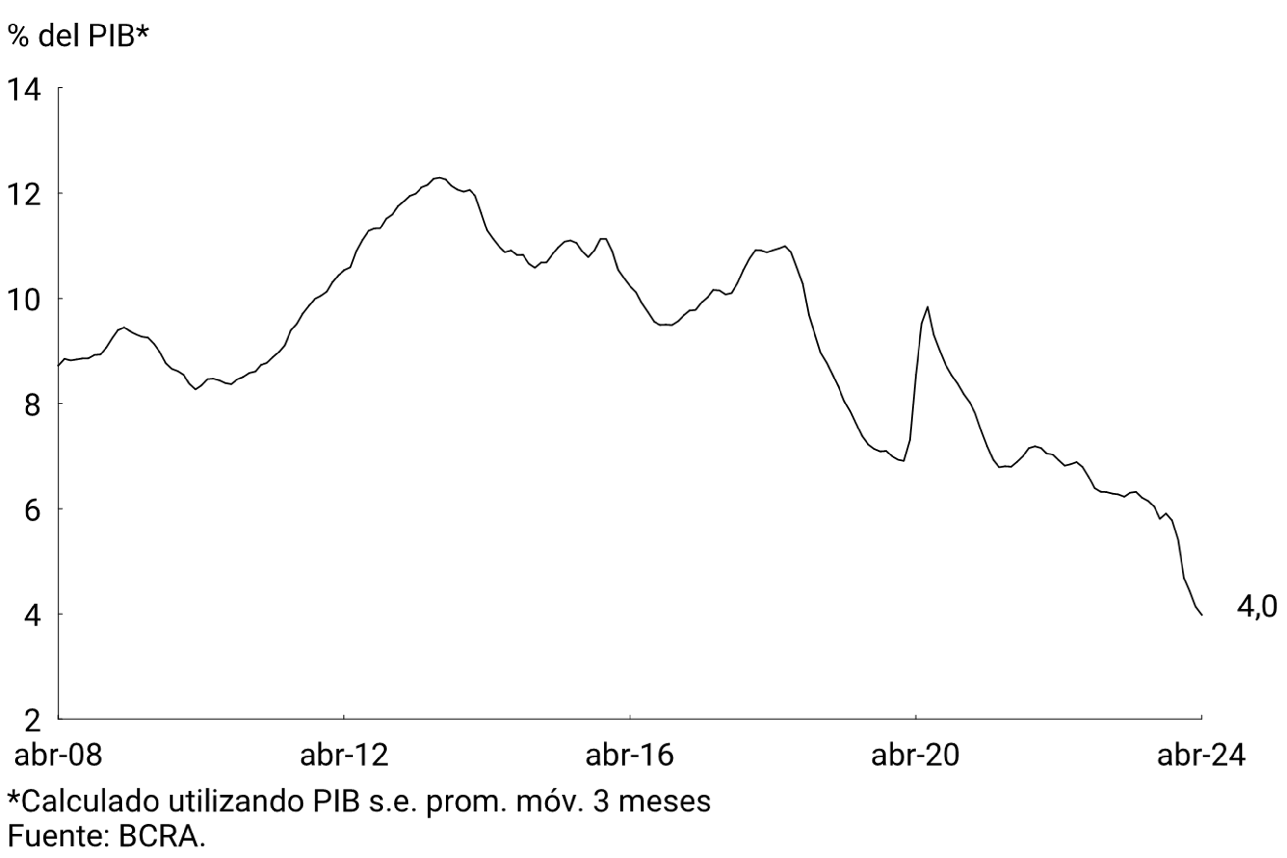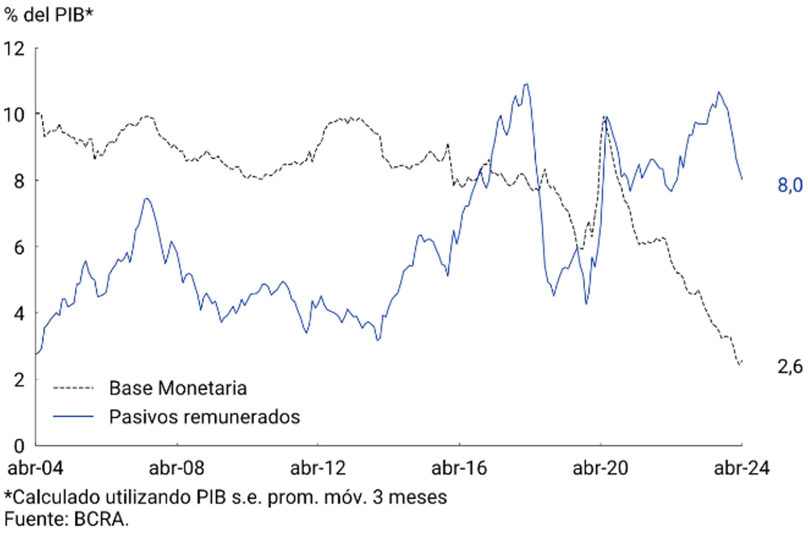 En términos reales y ajustada por estacionalidad, la variación promedio mensual de la Base Monetaria en abril fue 9,5%, en tanto, en términos interanuales se contrajo 38,2%. Como ratio del Producto se ubicó en 2,6%, lo que implicó un leve aumento respecto al mes anterior.