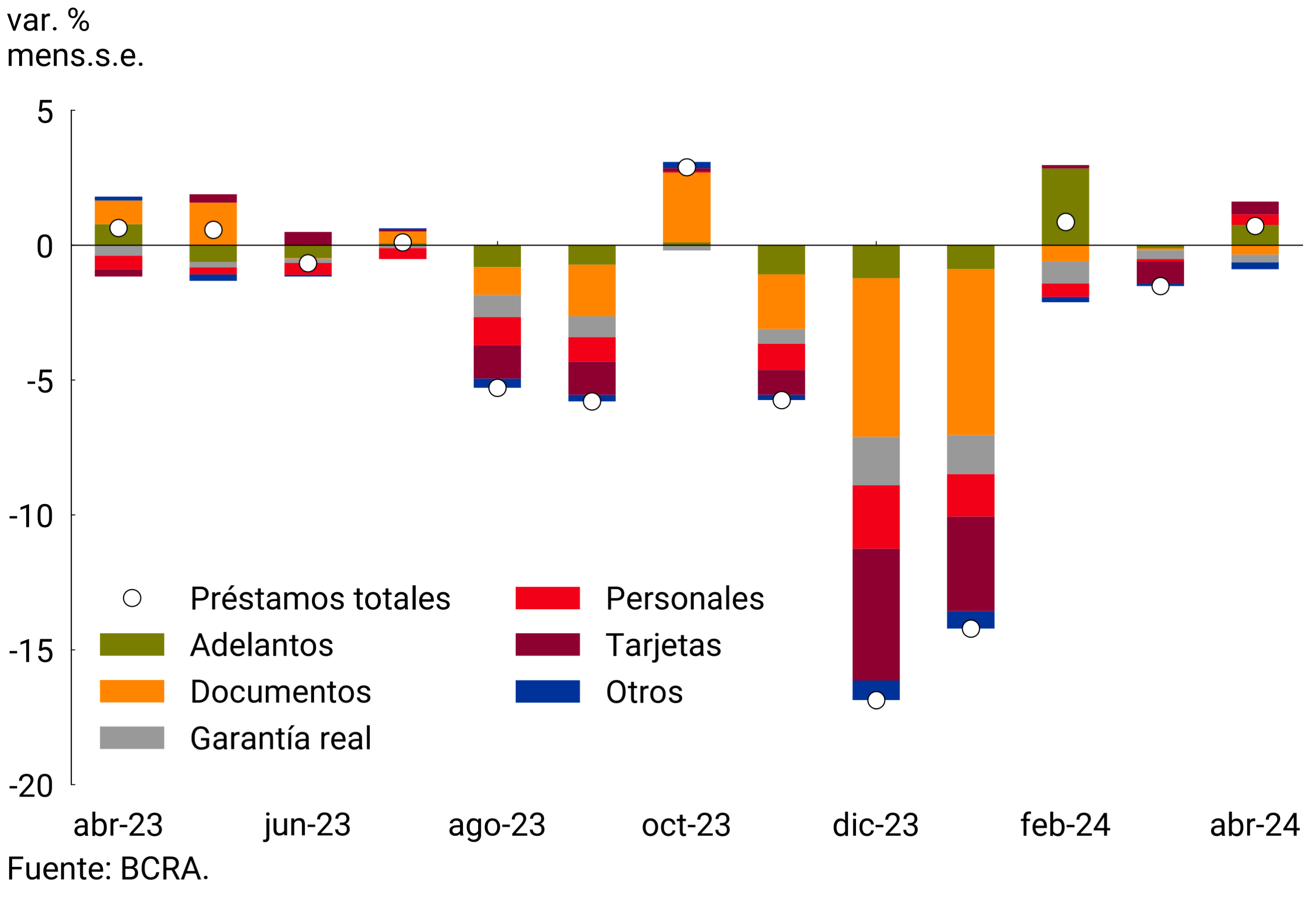 Los préstamos en pesos al sector privado presentaron en abril una expansión promedio mensual por aproximadamente $1,3 billones, lo que implicó un leve aumento a precios constantes (de 0,7% s.e.) respecto al mes previo. Las diferentes líneas de crédito tuvieron un comportamiento heterogéneo, con subas en los adelantos en cuenta corriente y, en menor medida, en los créditos personales y en los instrumentados con tarjetas de crédito, que fueron parcialmente contrarrestadas por la caída del resto de las financiaciones (ver Gráfico 2.2.1). En términos interanuales, los préstamos en pesos al sector privado registraron una contracción real de 38,2% y se posicionaron en 4% del Producto, un registro mínimo respecto a los valores de los últimos años (ver Gráfico 2.2.2). Este bajo nivel de financiamiento bancario se explica fundamentalmente por el proceso de desintermediación financiera experimentado durante los últimos años.