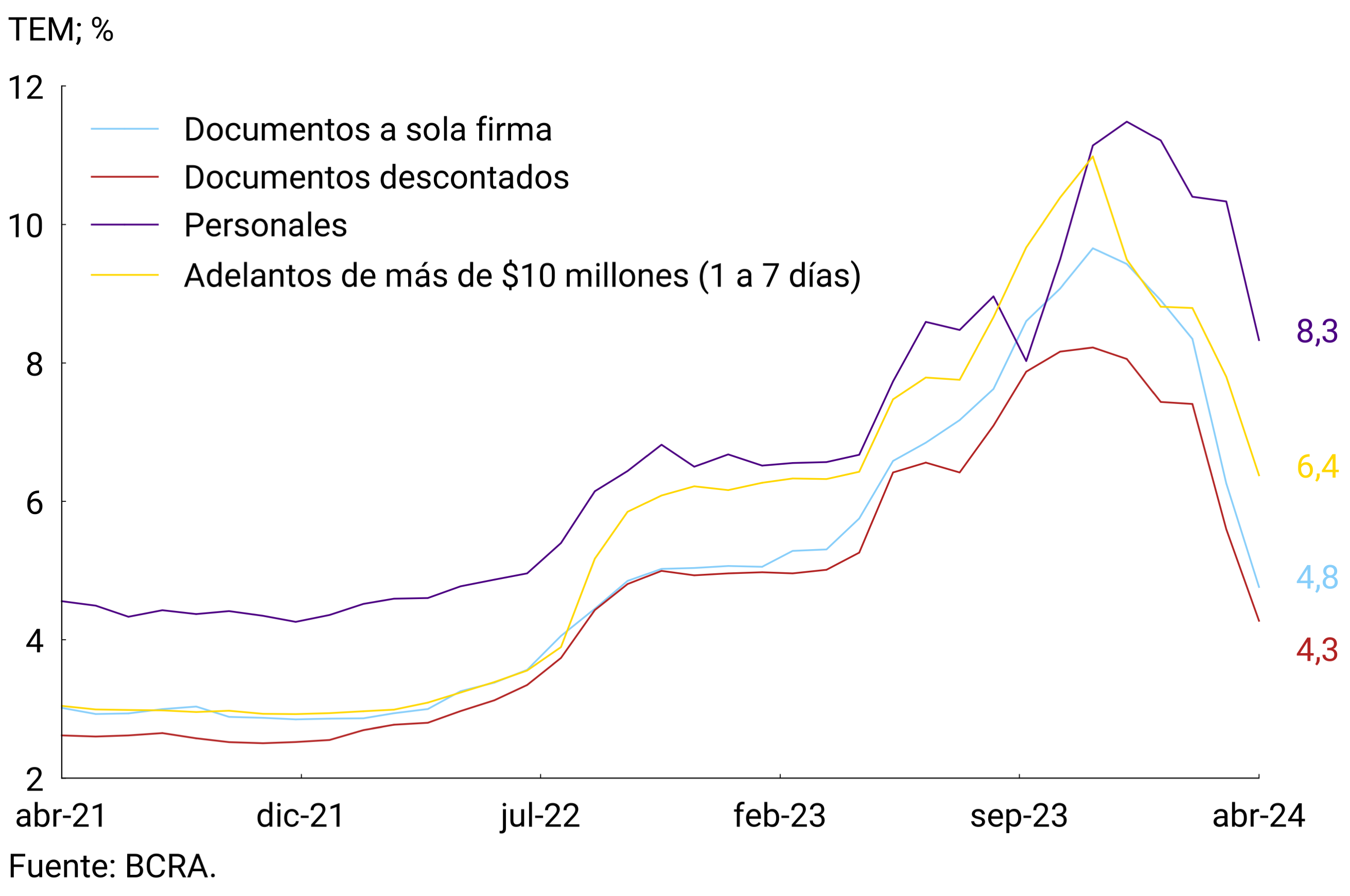 Desde el inicio de esta gestión, el BCRA ha tomado medidas, entre las que se destacan la reducción de la tasa de interés de política monetaria, la desregulación de las tasas de interés de los depósitos a plazo fijo y el sistema de incentivos para fomentar el financiamiento a las Micro, Pequeñas y Medianas Empresas (MiPyMEs), que han impactado sobre las tasas de interés de los préstamos, las que presentan una tendencia bajista desde diciembre de 2023 (ver Gráfico 2.2.3). Asimismo, cabe señalar que recientemente algunas entidades financieras han comenzado a ofrecer préstamos hipotecarios denominados en UVA.