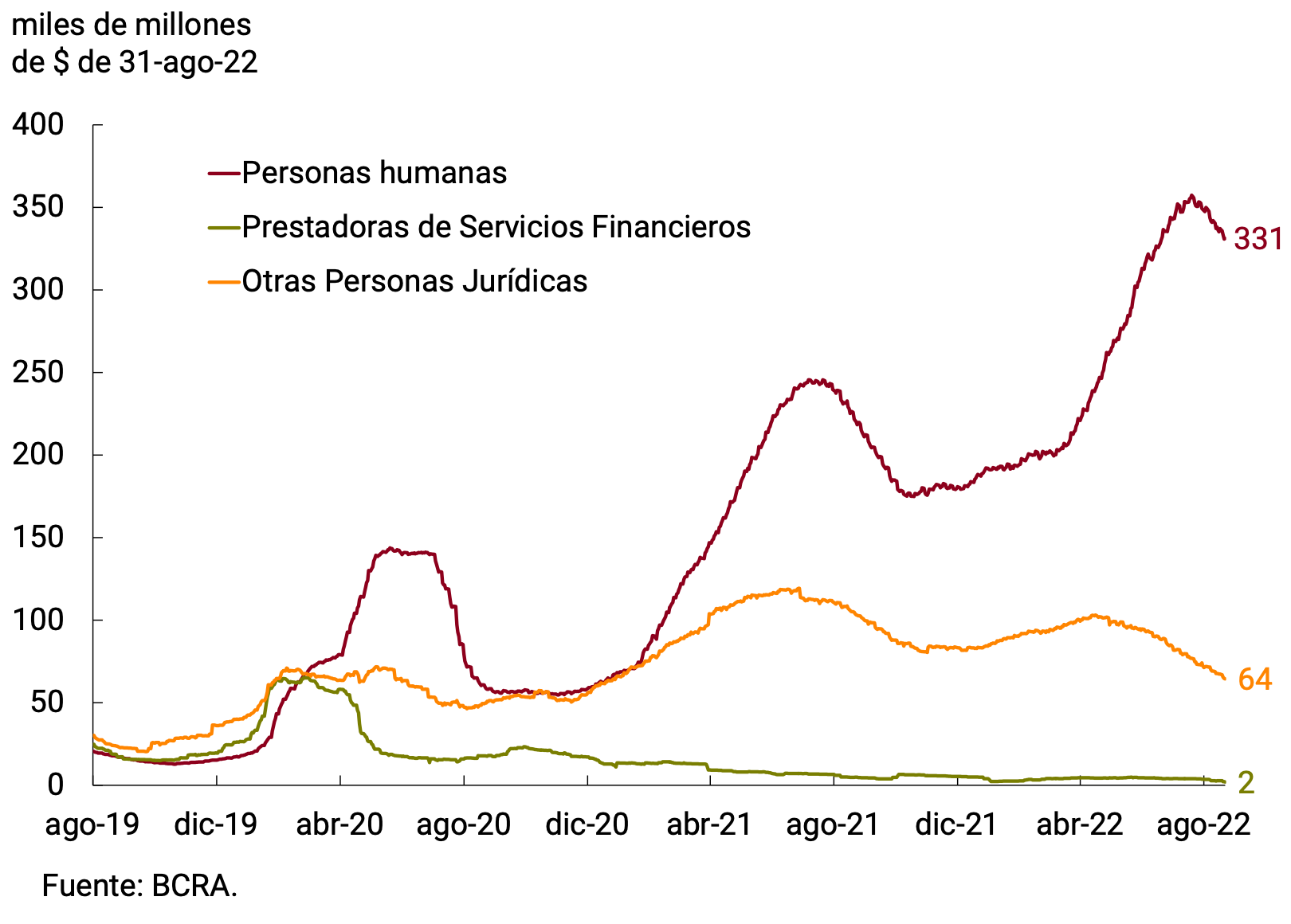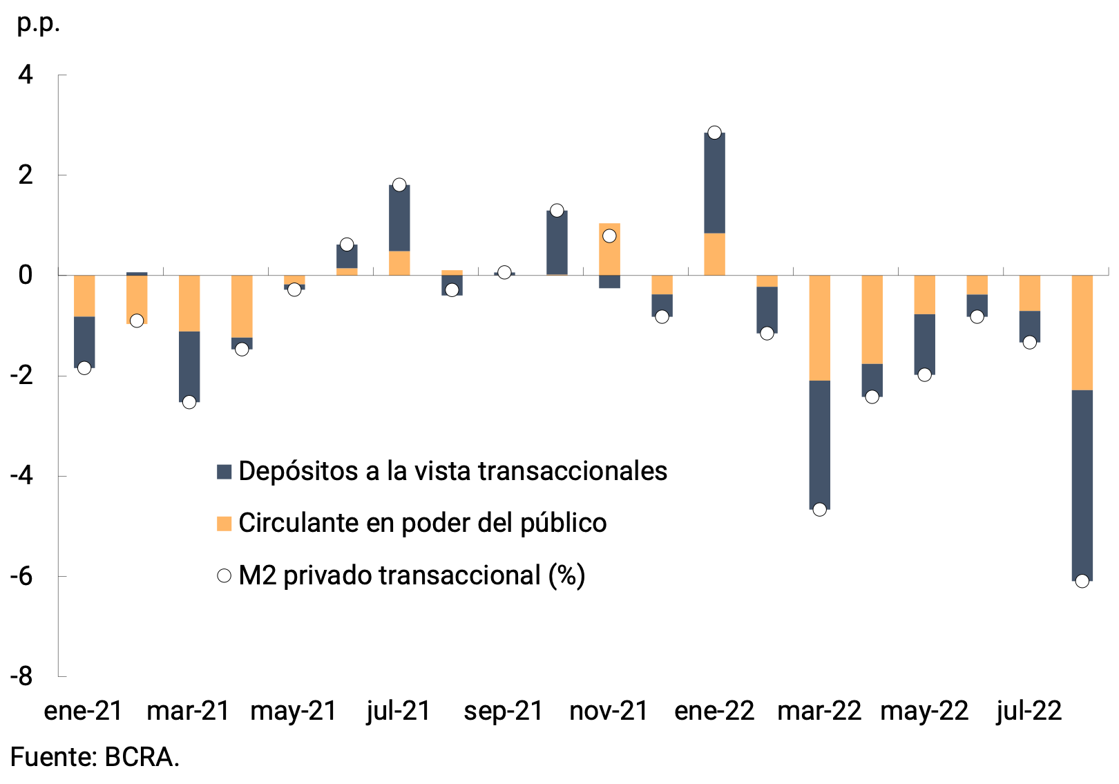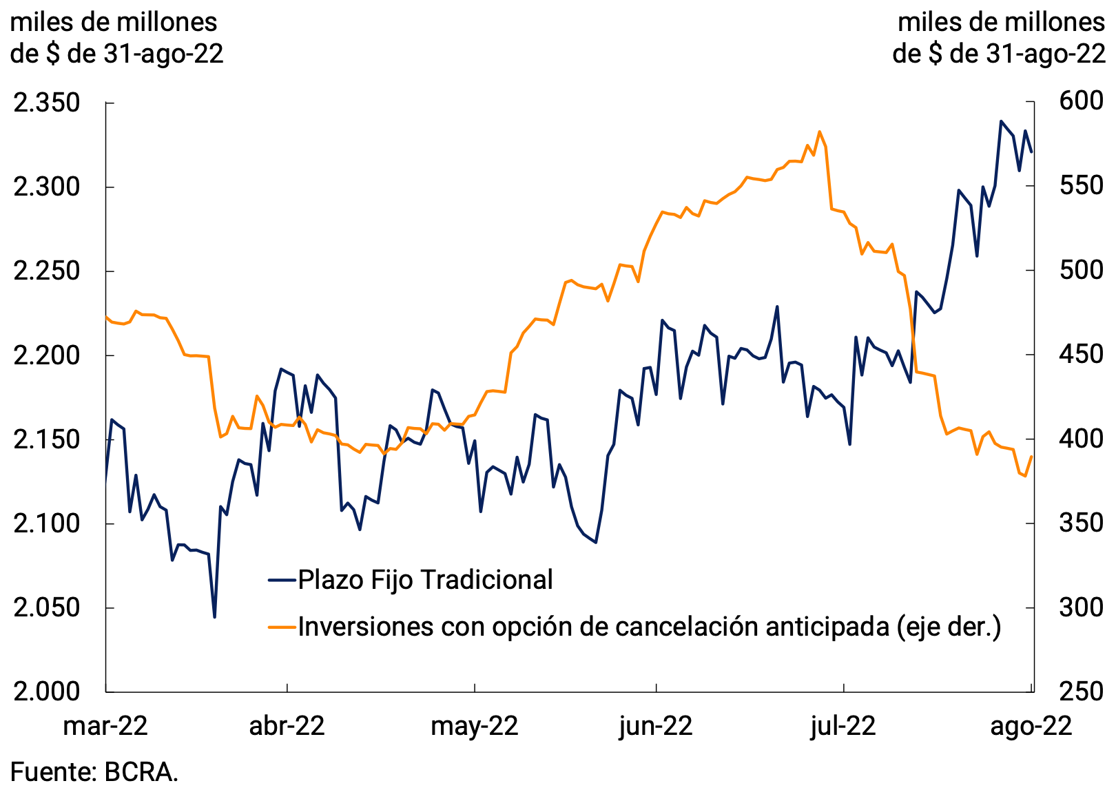 El agregado monetario amplio (M3 privado) habría registrado una contracción mensual a precios constantes y ajustado por estacionalidad, luego de tres meses de variaciones positivas. Esta contracción se explicó por el comportamiento de los medios de pago y, en menor medida, de los depósitos a plazo fijo. Pese al menor dinamismo que mostraron en agosto, las colocaciones a plazo fijo se mantuvieron en torno a los valores máximos de las últimas décadas, medidos a precios constantes.