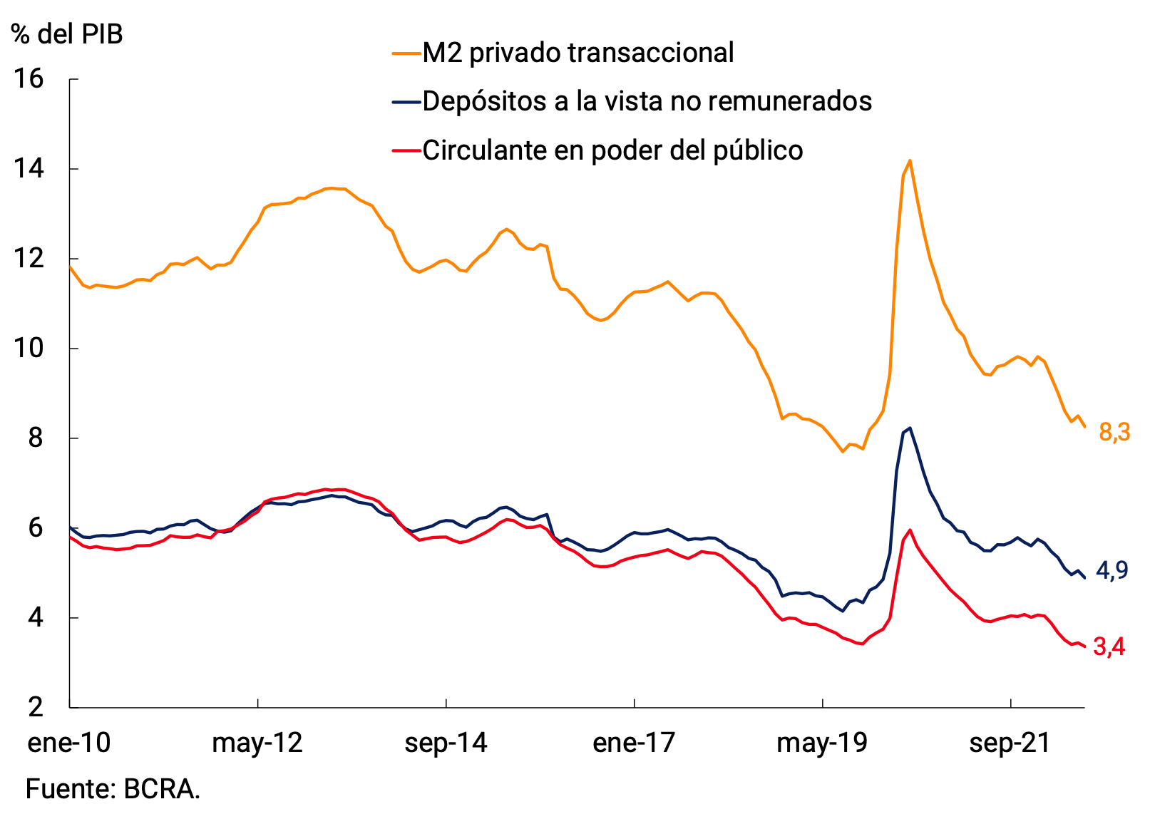 1 Corresponde al M2 privado excluyendo depósitos a la vista remunerados de empresas y prestadoras de servicios financieros. Se excluyó este componente dado que se asemeja más a un instrumento de ahorro que a un medio de pago.