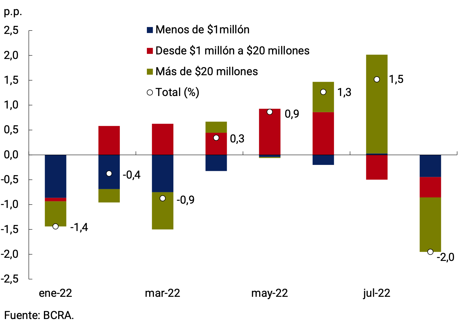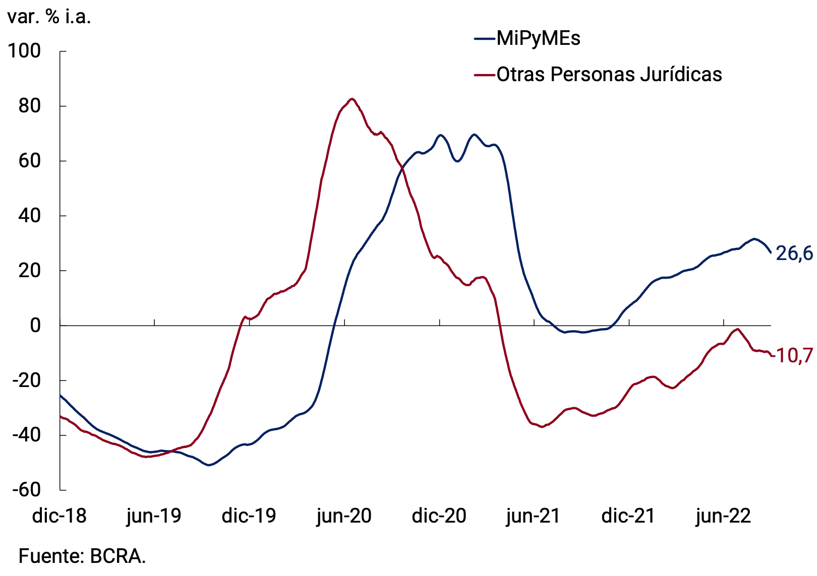 Las condiciones favorables de la LFIP continúan contribuyendo a sostener el crecimiento del financiamiento a las empresas de menor tamaño relativo. En efecto, diferenciando el crédito comercial por tipo de deudor se aprecia que en julio el crédito a las MiPyMEs a precios constantes se habría expandido en términos interanuales a un ritmo en torno al 26,6%, mientras que el destinado a las grandes empresas evidenció una contracción del orden del 10% i.a. (ver Gráfico 5.4).