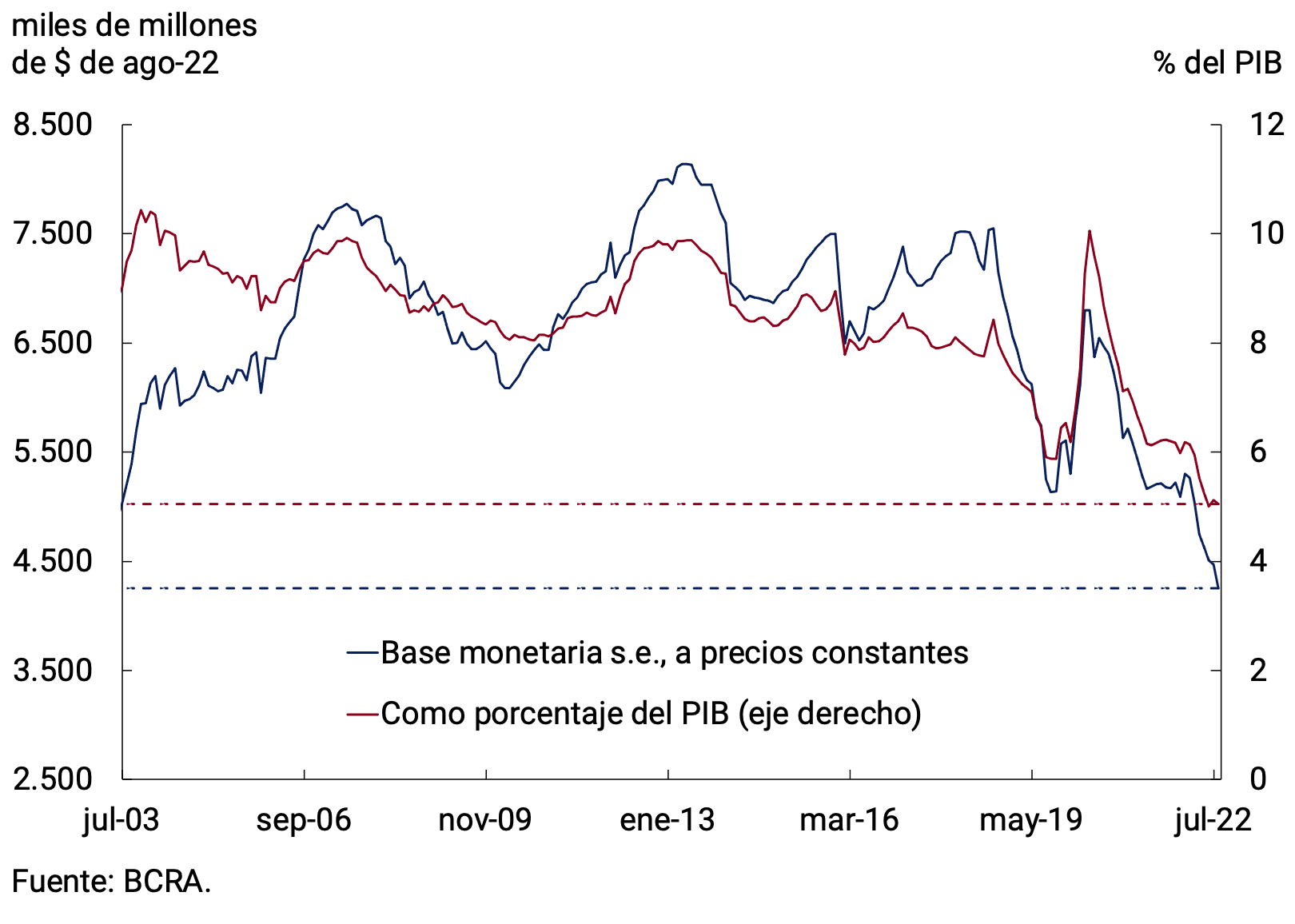 En agosto, la Base Monetaria se ubicó en promedio en $4.287,3 miles de millones, registrando un aumento mensual de 1,8% (+$75.240 millones) en la serie original a precios corrientes. Ajustada por estacionalidad y a precios constantes, habría exhibido una contracción de 4,8% y en los últimos doce meses acumularía una caída del orden del 18,3%. Como ratio del PIB la Base Monetaria se ubicaría en 5,0%, cifra levemente inferior a la del mes previo y el mínimo valor desde 2003 (ver Gráfico 4.1).