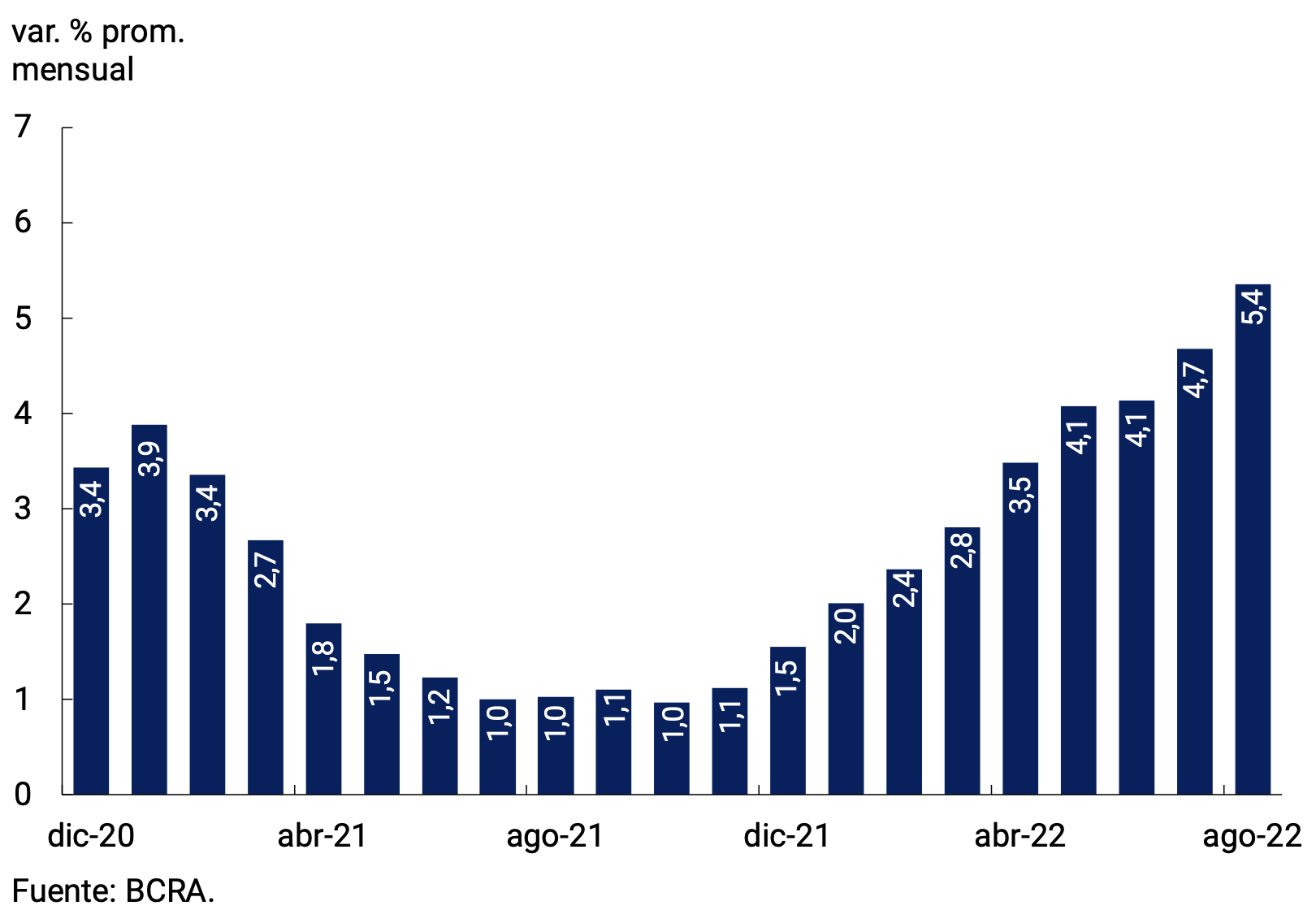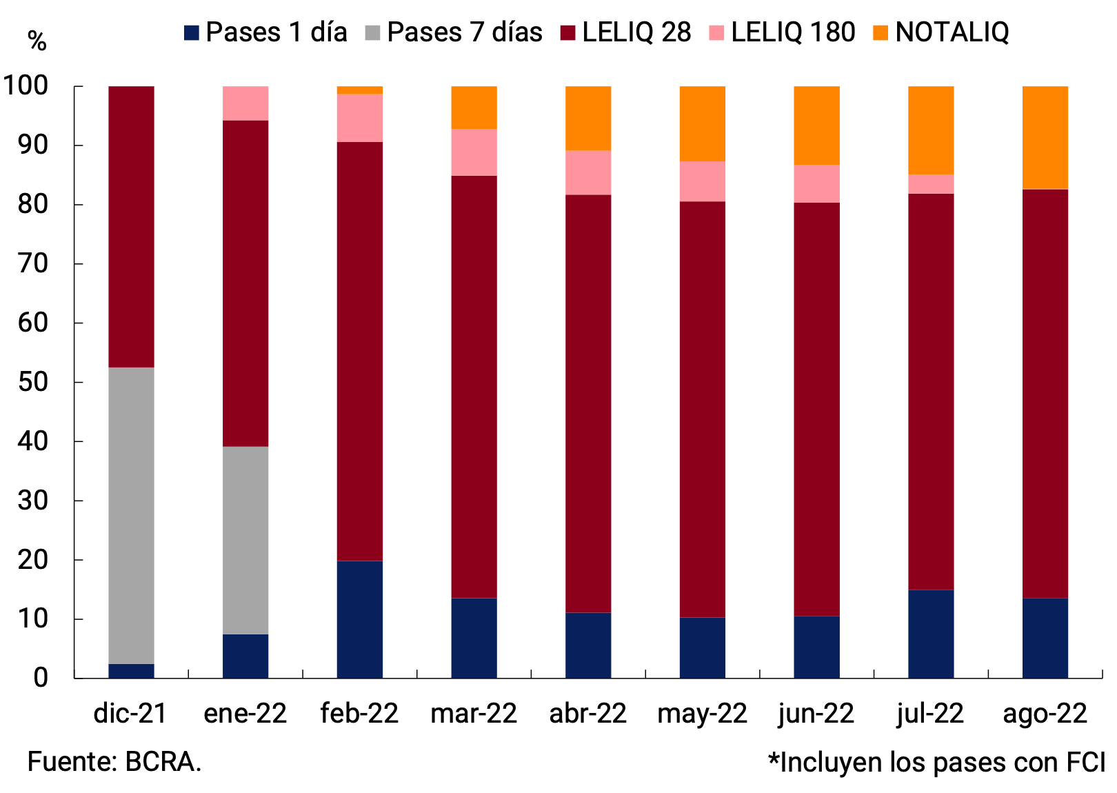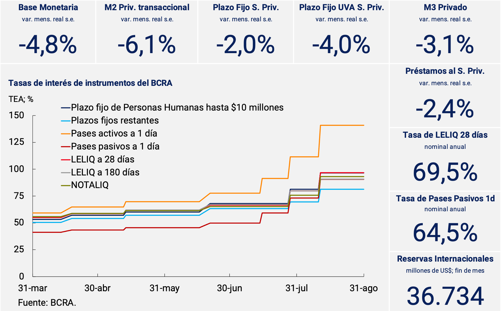 El BCRA aceleró el ritmo de suba de la tasa de interés de sus instrumentos de regulación monetaria y al mismo tiempo elevó las tasas de interés mínimas de los depósitos a plazo fijo. De este modo, busca propender hacia retornos positivos en términos reales de los instrumentos de ahorro en pesos y preservar la estabilidad monetaria y cambiaria. Asimismo, con el objetivo de reforzar el canal de transmisión de la política monetaria a los distintos segmentos del sistema financiero y del mercado de capitales, desde mediados de agosto, el BCRA comenzó a ofrecer pases pasivos a 1 día a Fondos Comunes de Inversión (FCI).