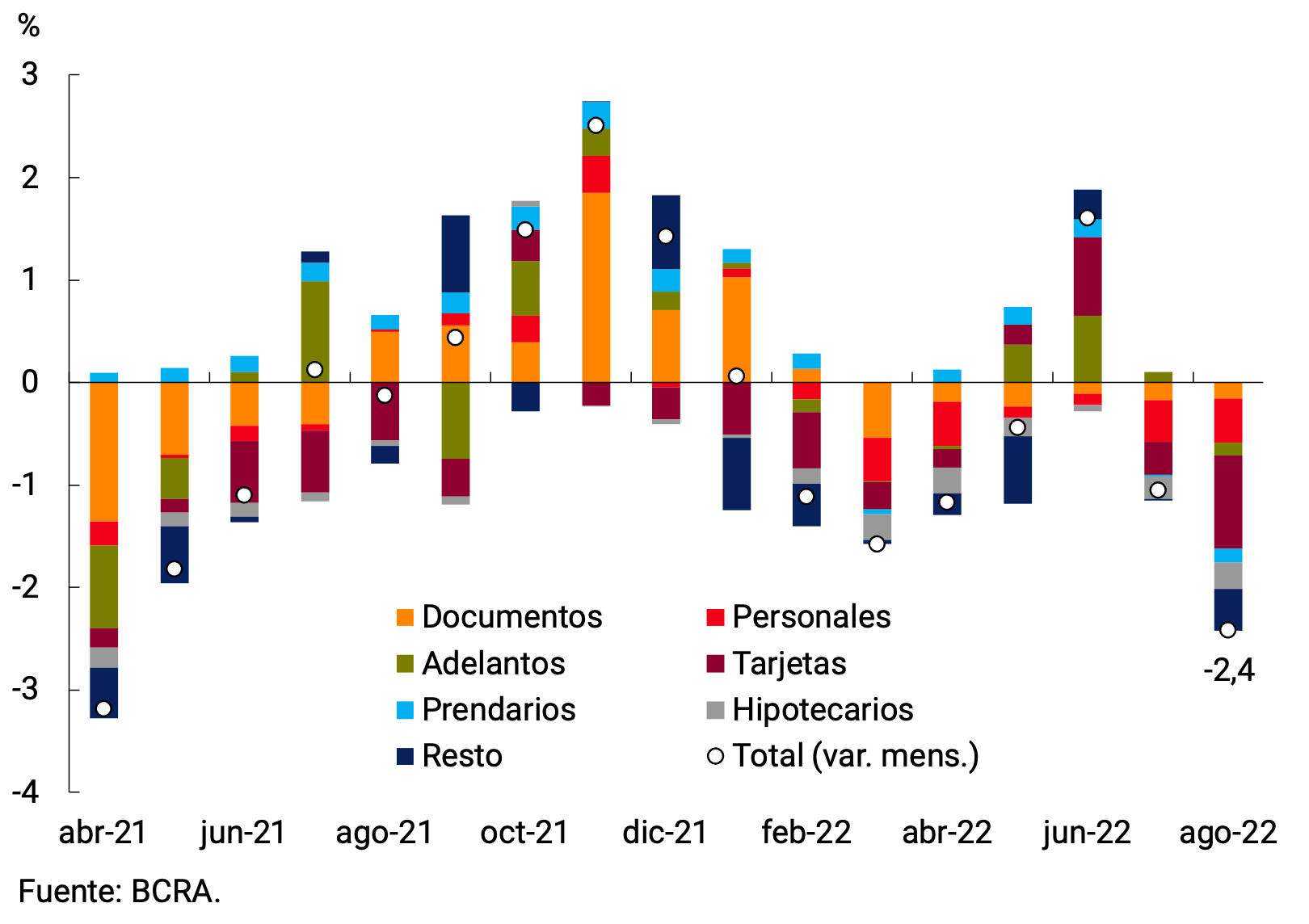 Analizando la evolución de los préstamos por tipo de financiación, las líneas con destino esencialmente comercial cayeron 1,4% mensual s.e. en términos reales. En la comparación interanual y a precios constantes se mantienen en un nivel 8,8% superior al de agosto de 2021. Al interior de estas líneas, los adelantos en cuenta corriente habrían caído 1,1% s.e. en términos reales (+11,3% i.a.). Por su parte, el financiamiento otorgado mediante documentos habría exhibido una merma a precios constantes de 0,6% s.e. (+14,9% i.a.), explicada tanto por los documentos a sola firma como por los documentos descontados.