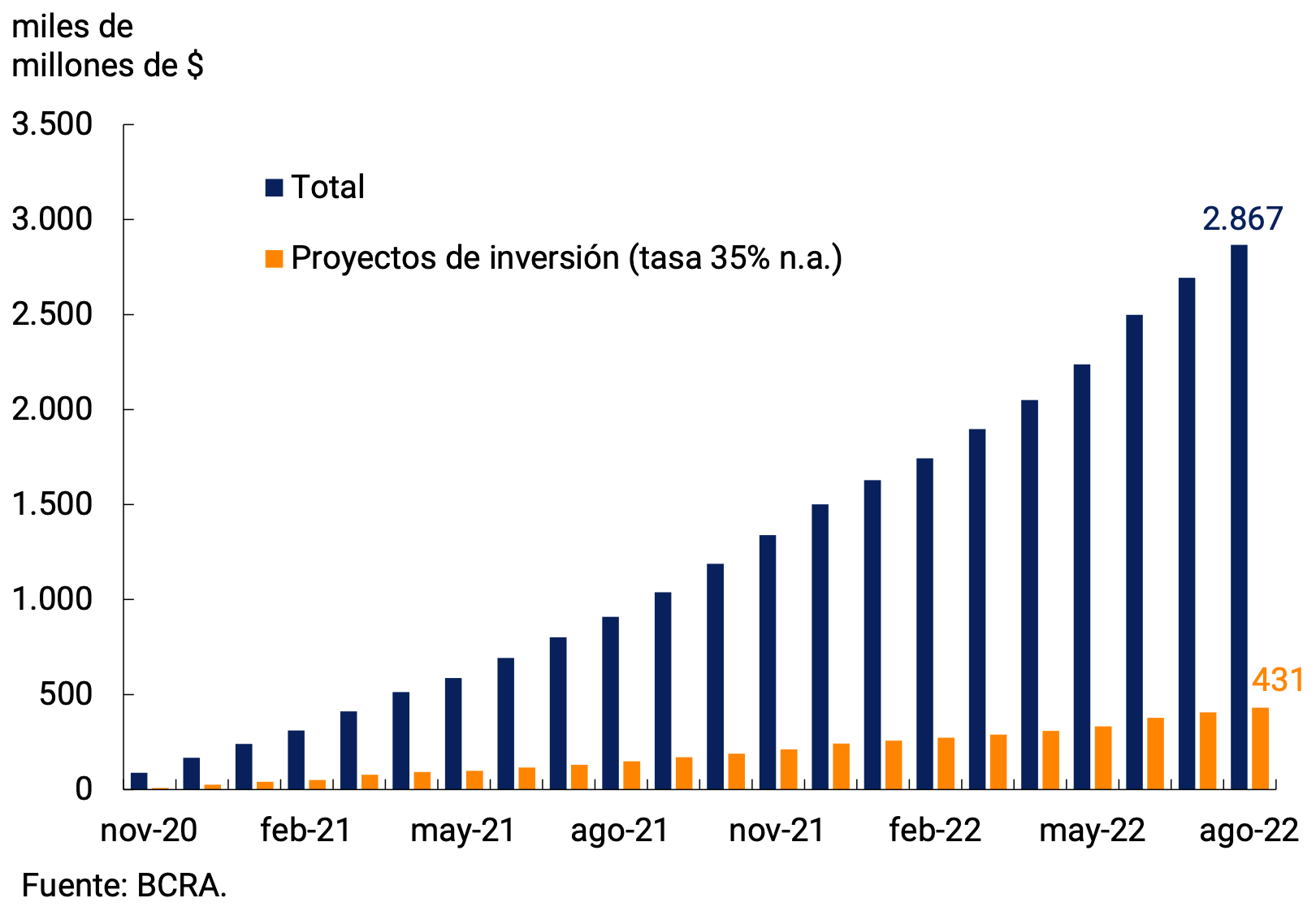 La Línea de Financiamiento para la Inversión Productiva (LFIP) continuó siendo la principal herramienta utilizada para canalizar el crédito productivo a Micro, Pequeñas y Medianas Empresas (MiPyMEs). A fines de agosto, los préstamos otorgados en el marco de la LFIP acumularon aproximadamente $2.867 miles de millones desde su lanzamiento, con un incremento de 6% respecto al mes pasado (ver Gráfico 5.3). En cuanto a los destinos de estos fondos, alrededor del 85% del total desembolsado corresponde a financiaciones de capital de trabajo y el resto a la línea que financia proyectos de inversión. Al momento de esta publicación, el número de empresas que accedió a la LFIP ascendió a 298.308. Cabe señalar que, en línea con el aumento de las tasas de interés de referencia del BCRA, se elevó la tasa máxima de la línea para financiar capital de trabajo desde 58% a 69% n.a.; y la correspondiente a proyectos de inversión pasó de 50% a 59% n.a.
