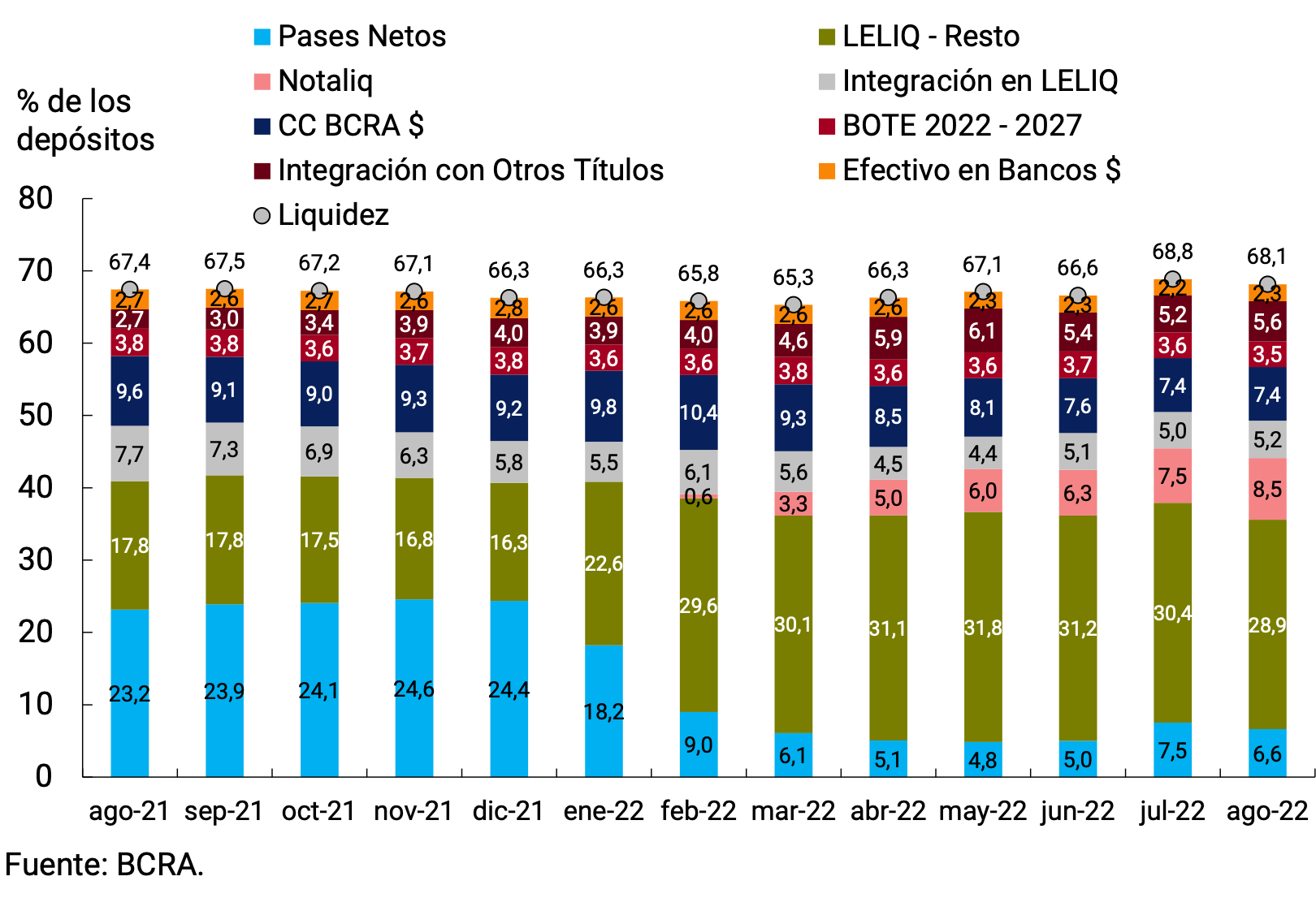 6 Incluye las cuentas corrientes en el BCRA, el efectivo en bancos, los saldos de pases netos concertados con el BCRA, las tenencias de LELIQ y NOTALIQ y los bonos públicos elegibles para integrar encajes.
