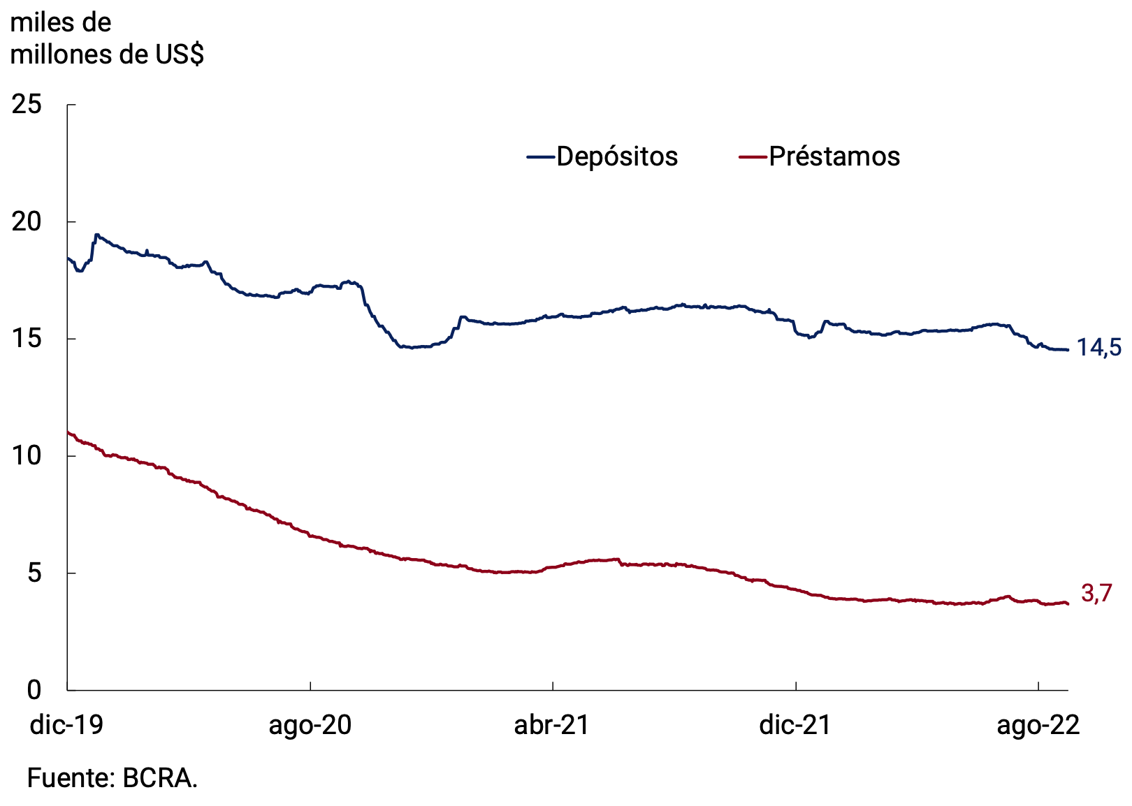 En el segmento en moneda extranjera, los principales activos y pasivos de las entidades financieras presentaron variaciones negativas. Así, el saldo promedio mensual de los depósitos del sector privado se ubicó en torno a los US$14.600 millones, registrando una caída de US$471 millones respecto al mes anterior. Parte de esta caída se explicó por el arrastre estadístico de julio, arrojando la variación punta una contracción de US$115 millones. Los depósitos a la vista de personas humanas de menos de US$1 millón fueron los que concentraron la mayor parte de disminución observada en el mes. Por otra parte, el saldo promedio mensual de los préstamos al sector privado fue de US$3.714 millones, lo que significó una caída de US$133 millones respecto al mes anterior, explicada por el comportamiento de los depósitos a sola firma (ver Gráfico 7.1).