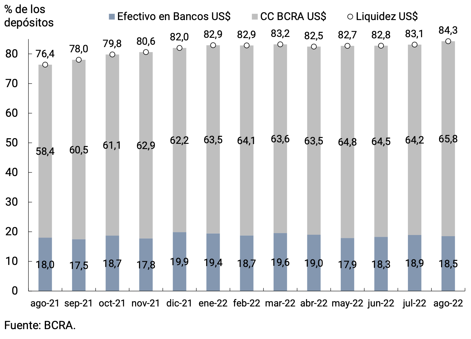 La liquidez de las entidades financieras en el segmento en moneda extranjera se ubicó en 84,3 de los depósitos de agosto, mostrando un incremento de 1,2 p.p. con respecto al mes de julio. El aumento se explicó por el desempeño de las cuentas corrientes en el BCRA, y fue parcialmente compensado por una caída en el efectivo en bancos (ver Gráfico 7.2).