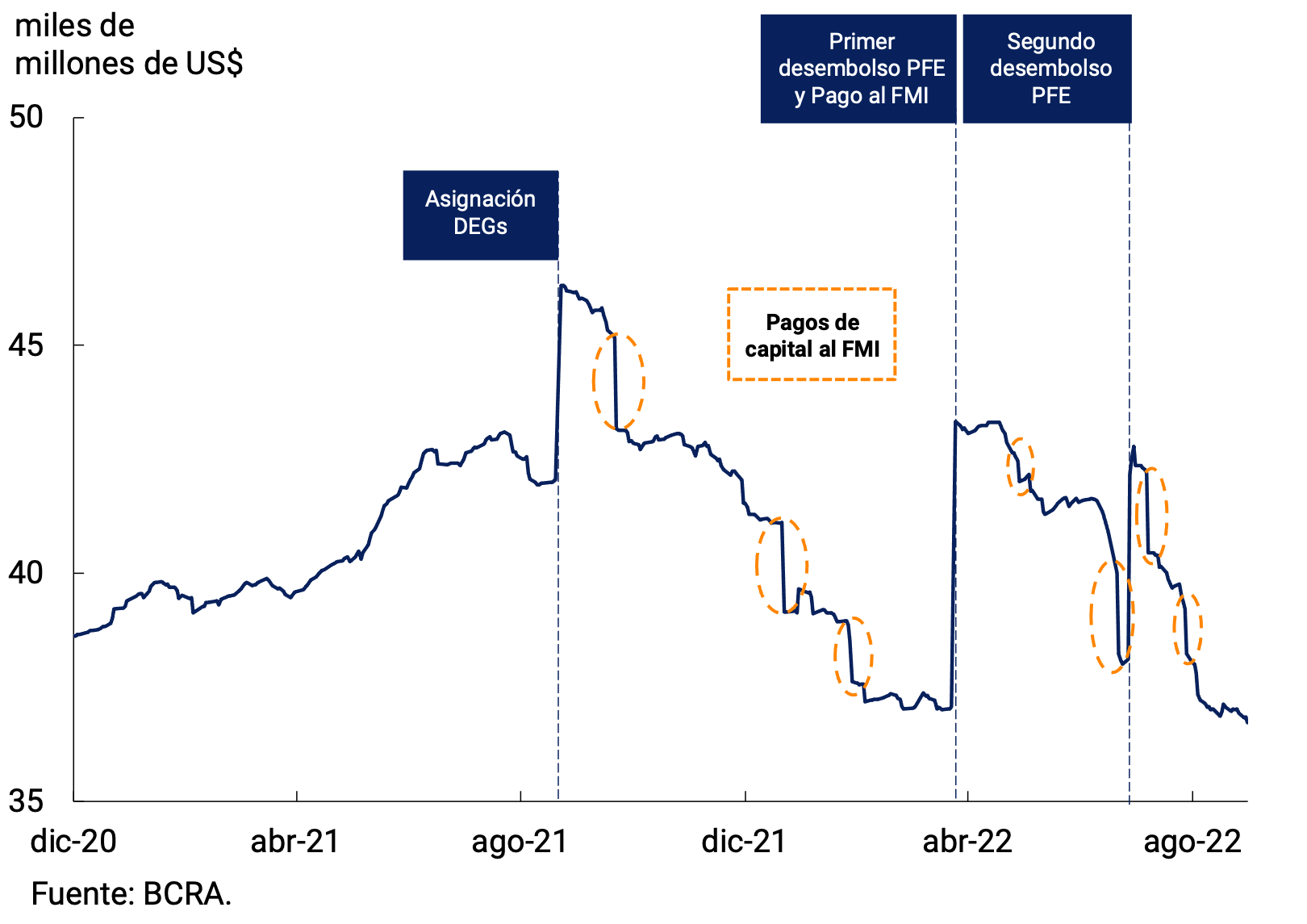 En agosto las Reservas Internacionales del BCRA finalizaron con un saldo de US$36.734 millones, reflejando una disminución de US$1.498 millones respecto al valor registrado a fines de julio (ver Gráfico 7.3). La caída del mes estuvo explicada por las pérdidas por valuación de los activos externos netos; los pagos a organismos internacionales, entre los que se destacó el pago de intereses al Fondo Monetario Internacional por US$452 millones; y la venta neta de divisas al sector privado. Cabe resaltar que la dinámica de estas últimas se revirtió a mediados de mes, aunque sin lograr revertir lo sucedido en la primera mitad.