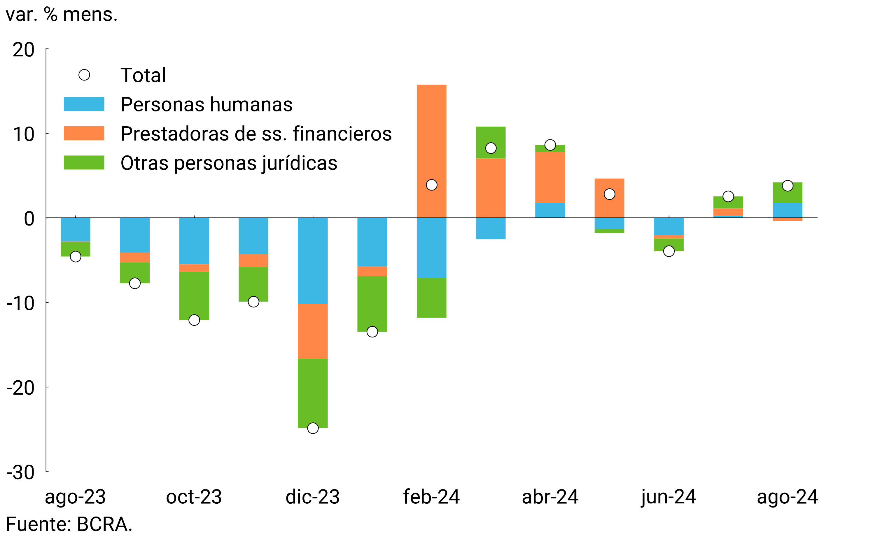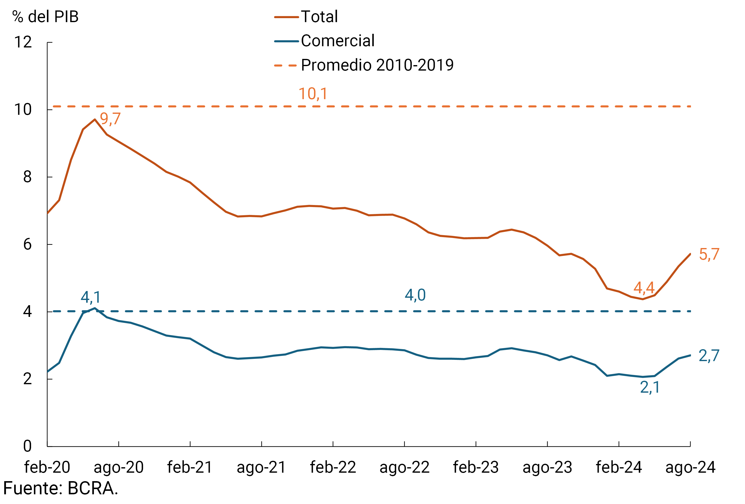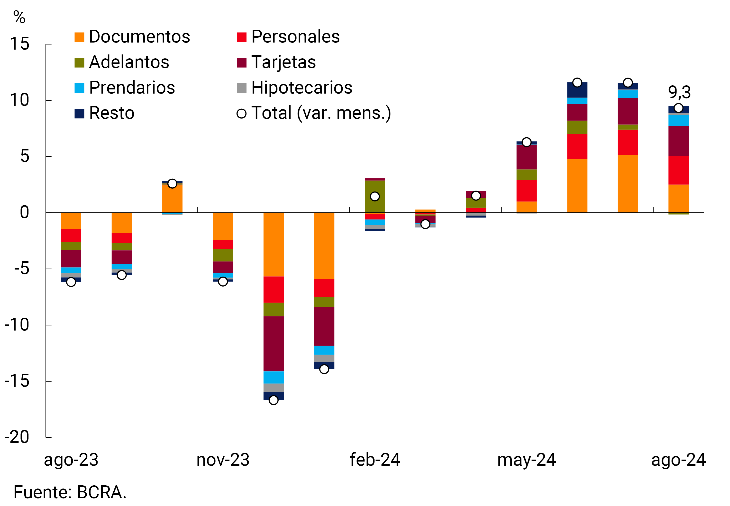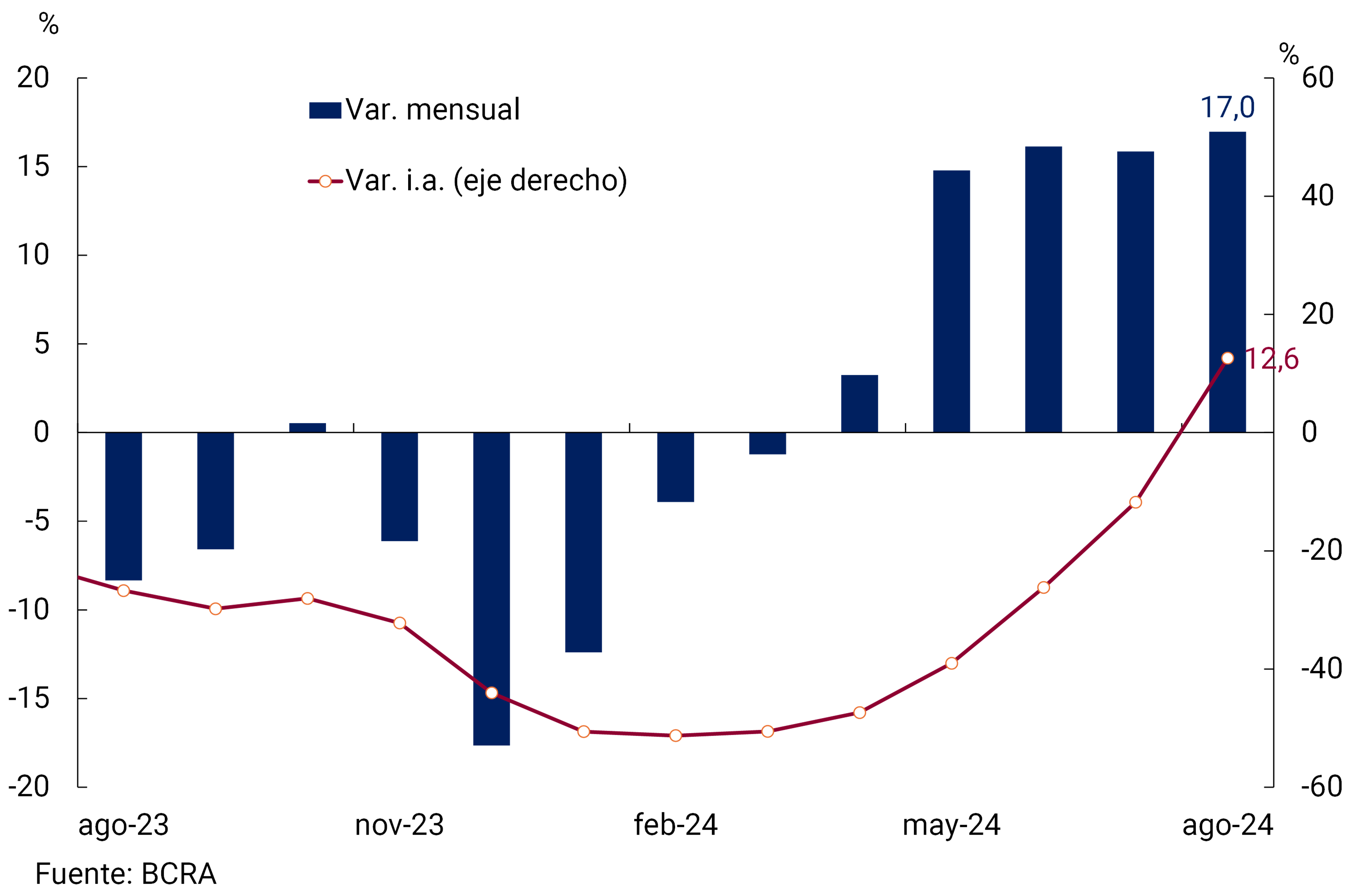 El crédito comercial, por su parte, creció 6,0% real sin estacionalidad en agosto, con una leve desaceleración respecto a las tasas de crecimiento registradas en el bimestre junio-julio. El crecimiento de los préstamos comerciales fue impulsado por los préstamos instrumentados a través de documentos, que aumentaron 8,2% s.e. en el mes. Dentro de estas financiaciones, tanto los documentos a sola firma como los documentos descontados experimentaron un incremento real sin estacionalidad durante el mes. Por su parte, los adelantos en cuenta corriente fueron la única línea de crédito con una caída real durante agosto, al reducirse 1,2% s.e respecto al stock registrado en julio.