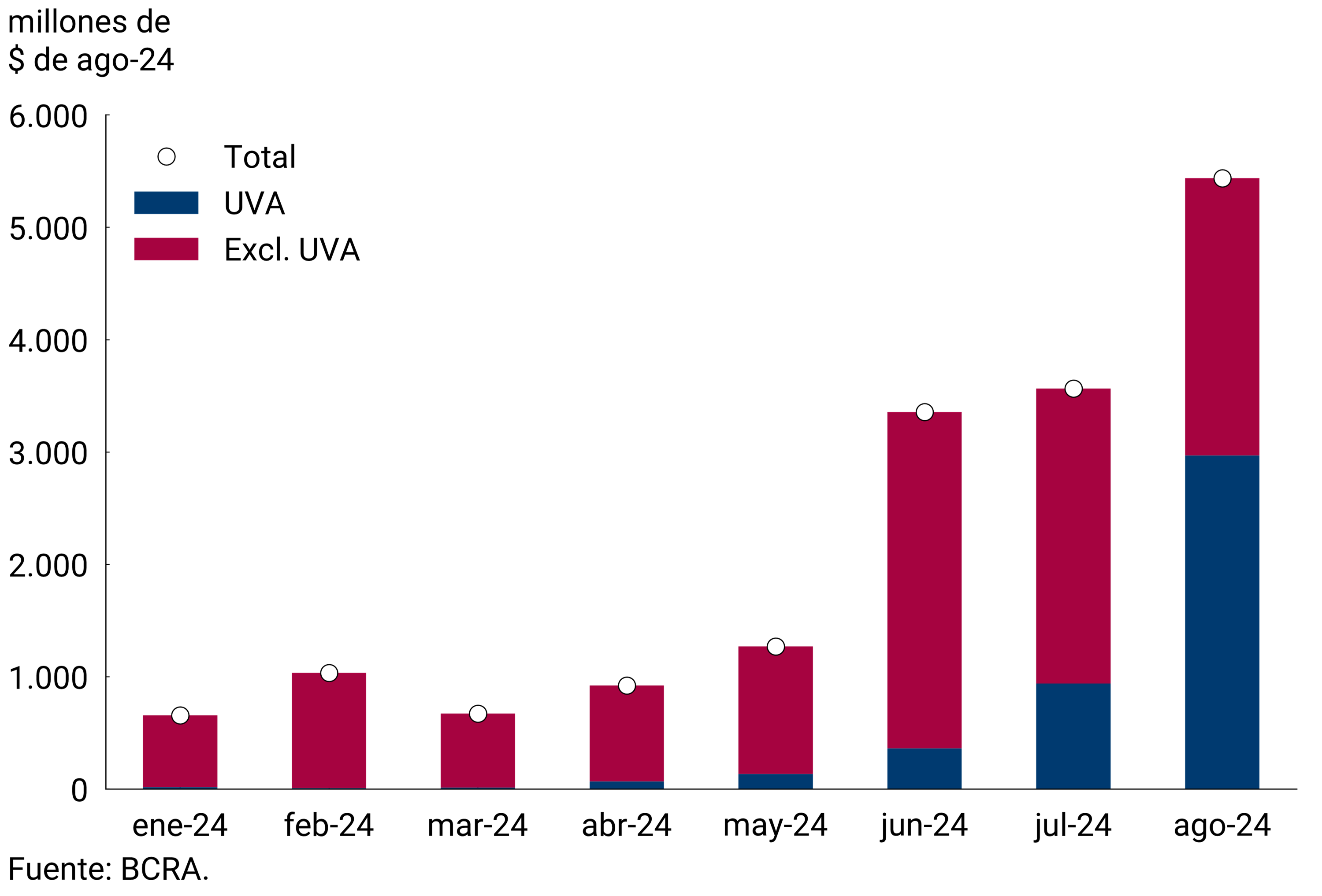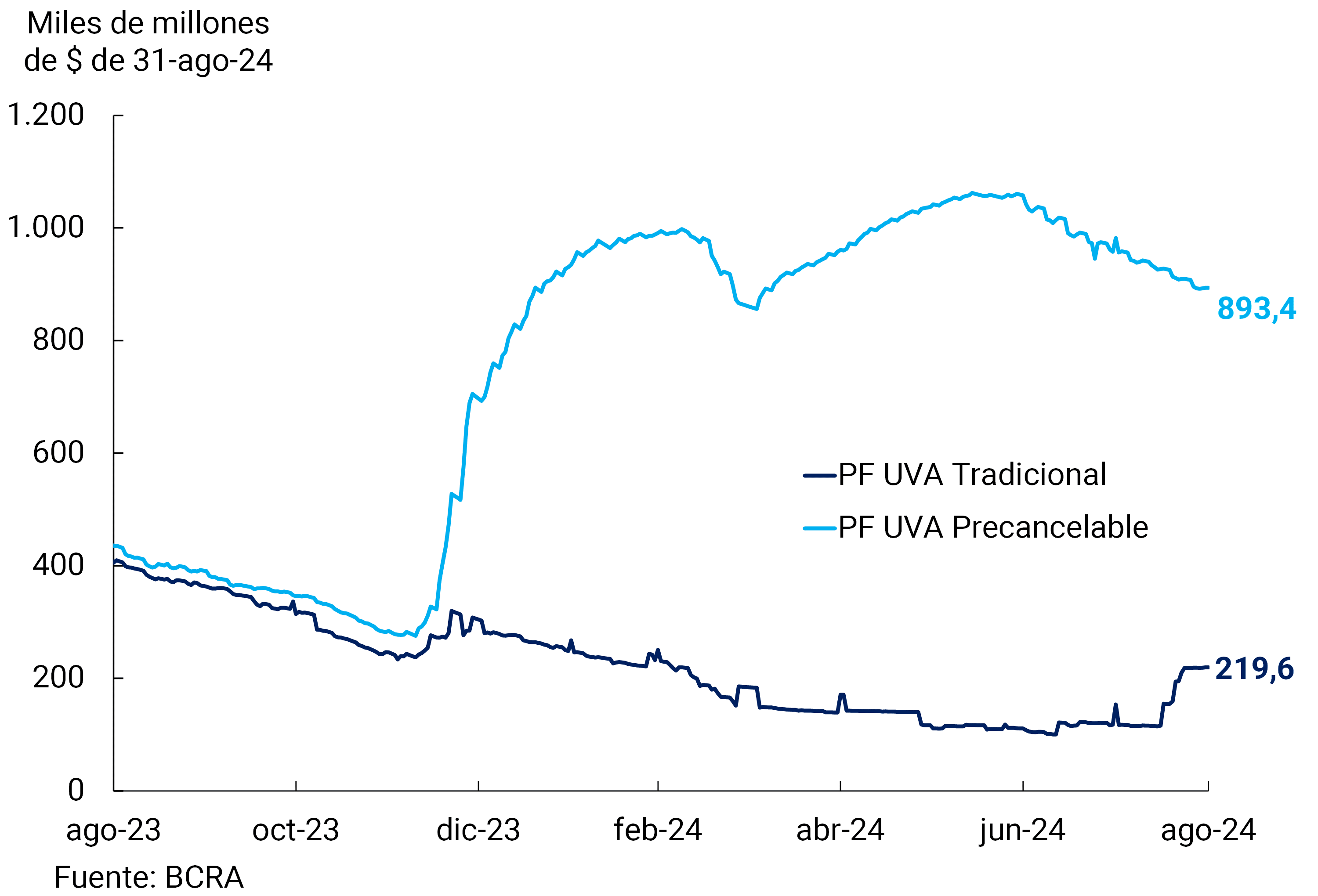 A nivel de los componentes de la demanda de dinero, el crecimiento se concentró en los instrumentos remunerados2. En particular, los depósitos a plazo del sector privado crecieron en el mes 3,6% s.e. a precios constantes, con un aumento en las colocaciones de personas humanas y jurídicas (excluyendo las Prestadoras de Servicios Financieros; ver Gráfico 2.1). Dentro de las colocaciones a plazo, cabe señalar que las denominadas en UVA del segmento tradicional mostraron un incipiente crecimiento, tratándose de la primera suba del año (ver Gráfico 2.2). En cambio, los depósitos a la vista remunerados se mantuvieron sin grandes cambios en agosto, en línea con el patrimonio de los Fondos Comunes de Inversión de Money Market (FCI MM). En el segmento no remunerado, se observaron variaciones poco significativas en términos reales, con una caída de los depósitos a la vista no remunerados de 0,8% s.e. y una suba de 1,9% s.e. del circulante en poder del público.