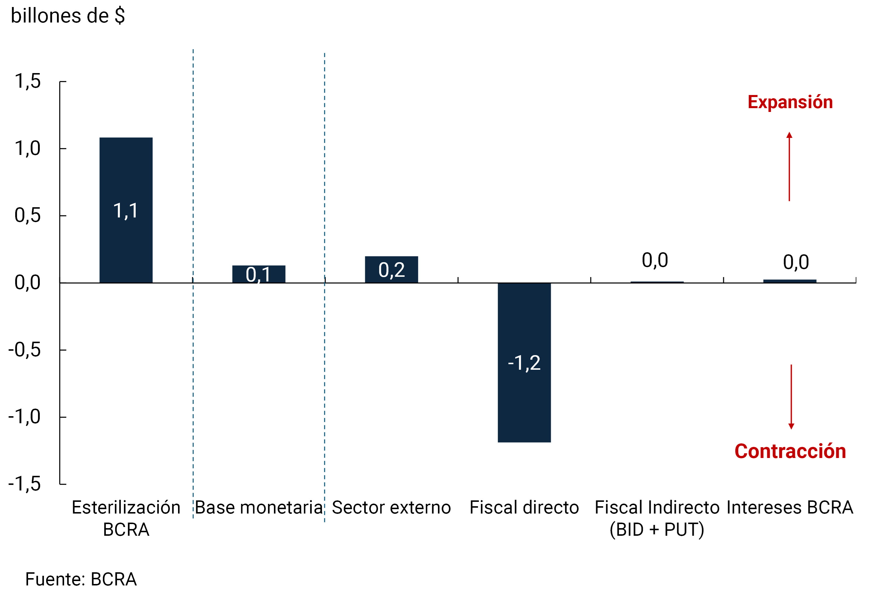 En línea con el comportamiento de la demanda de dinero, la Base Monetaria presentó un leve aumento en el mes. Uno de los factores de expansión fue la compraventa de dólares al sector privado. Por otro lado, las entidades financieras redujeron sus tenencias de LEFI, aunque estos fondos se dirigieron en gran parte a las licitaciones primarias del Tesoro Nacional, que depositó lo obtenido por encima de los vencimientos en una cuenta en el BCRA compensando, de esta forma, parte de la expansión generada previamente.