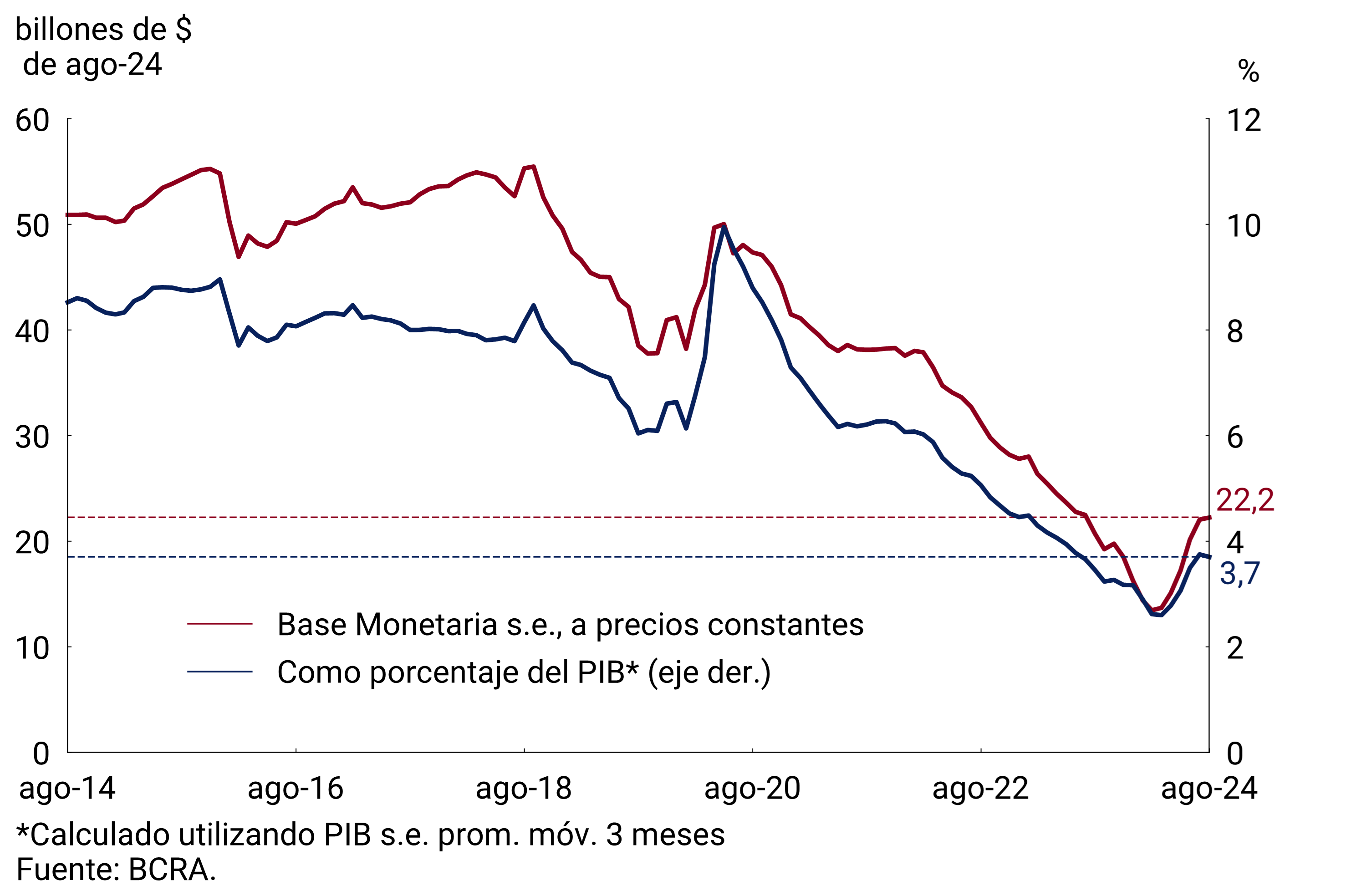 Así, la Base Monetaria registró un aumento promedio mensual de 0,9% a precios constantes y sin estacionalidad. De esta manera, se ubicó en 3,7% del PIB (ver Gráfico 3.1.2).