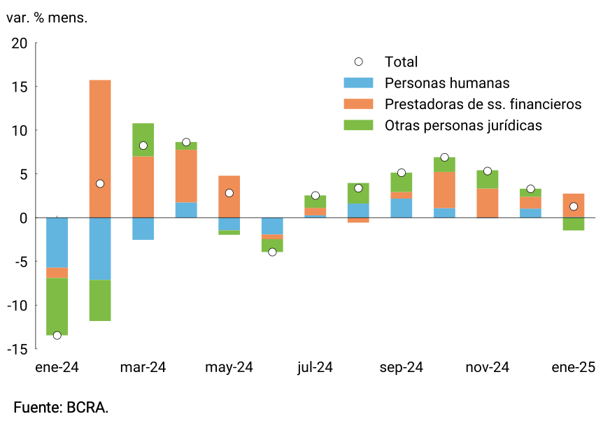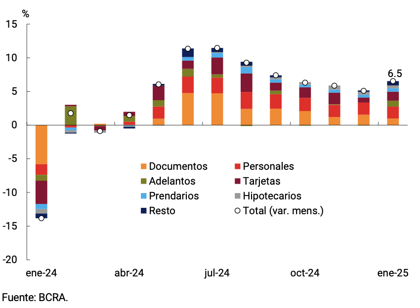 Por último, el crédito al consumo aumentó 6,6% mensual a precios constantes, acumulando un incremento real de 105,4% en comparación con enero de 2024. Los préstamos personales aumentaron 9,1% s.e. en términos reales frente a diciembre, con un crecimiento interanual superior a 200% (ver Gráfico 3.2.4). Por su parte, las financiaciones en tarjetas de crédito crecieron 4,8% mensual s.e. a precios constantes y acumulan un crecimiento real de 66,8% durante los últimos 12 meses.