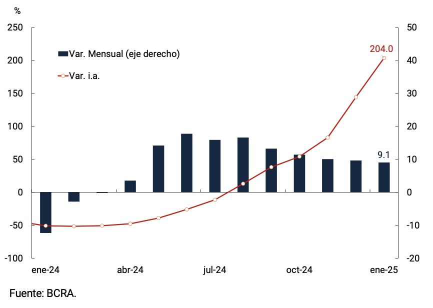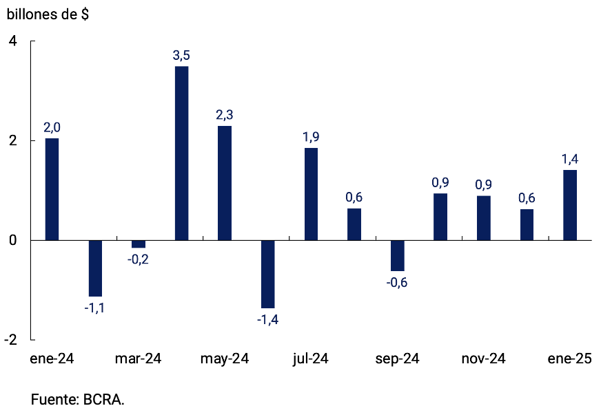>En enero, los préstamos en pesos al sector privado registraron un aumento cercano a $3,4 billones, lo que implicó un crecimiento mensual de 6,5% s.e. a precios constantes, con una aceleración respecto a las tasas de crecimiento observadas en noviembre y diciembre de 2024. Así, el crédito al sector privado acumula ya 10 meses consecutivos de crecimiento, con una variación interanual real de 98,7%. En términos del PIB, el crédito al sector privado habría alcanzado 7,3% del PIB, con un incremento de 2,9 p.p. respecto al mínimo registrado en abril de 2024 y 0,4 p.p. frente al mes previo (ver Gráfico 3.2.2).