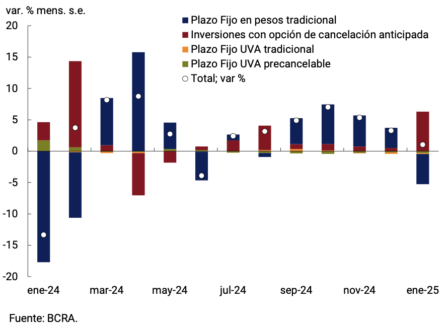 El agregado amplio total (M3 Total) creció $3,9 billones en el primer mes del año, de los cuales $2,9 billones correspondieron al crecimiento del M3 privado. En términos reales y sin estacionalidad, este último registró una ligera caída (0,1%), luego de nueve meses consecutivos de aumento. En cuanto a los componentes, los medios de pagos privados (circulante en poder del público y depósitos a la vista transaccionales) mostraron un mayor dinamismo que los depósitos remunerados, reflejando una mayor preferencia por activos líquidos por parte de los agentes económicos, en un contexto de desinflación y recuperación de la actividad económica.