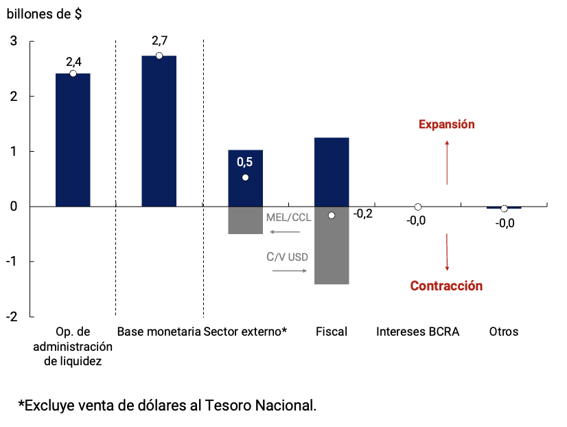 La demanda de dinero se nutrió fundamentalmente del crecimiento de los préstamos en pesos al sector privado (creación secundaria de dinero), los cuales registraron un aumento de $3,4 billones. A precios constantes y sin estacionalidad, los préstamos crecieron 6,5%, con un aumento generalizado a todas las líneas de crédito. Los factores de creación primaria fueron prácticamente neutros.
