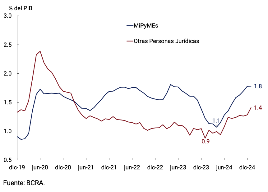Los préstamos comerciales aceleraron su crecimiento en enero al registrar un aumento de 5,7% real s.e. frente a diciembre y acumulan así 12 meses consecutivos de crecimiento, encontrándose actualmente 93,5% por encima de su nivel de un año atrás siempre en términos reales. El avance de los créditos comerciales estuvo impulsado por los adelantos en cuenta corriente, que crecieron 9,1% mensual s.e. en términos reales y se encuentran 72,2% por encima del nivel registrado un año atrás. Los préstamos instrumentados a través de documentos crecieron en enero a un ritmo de 3,3% mensual s.e. en términos reales y 99,9% i.a.. Este crecimiento fue explicado tanto los documentos descontados como por los documentos a sola firma, con aumentos reales de 3,3% en ambos casos. Al analizar la evolución del crédito comercial según el tipo de deudor se observa que tanto el crédito destinado a PyMEs como el dirigido a grandes empresas mostraron una expansión en el primer mes de 2025. El crédito destinado a grandes empresas habría crecido 11,4% mensual s.e. a precios constantes y 105,1% i.a., para ubicarse en 1,4% del PIB. Por su parte, los préstamos a PyMEs habrían aumentado 1,6% real s.e. frente a diciembre de 2024 y acumulan un avance de 86,0% i.a.. Así, el crédito bancario a PyMEs alcanzó 1,8% del PIB (ver Gráfico 3.2.3)..