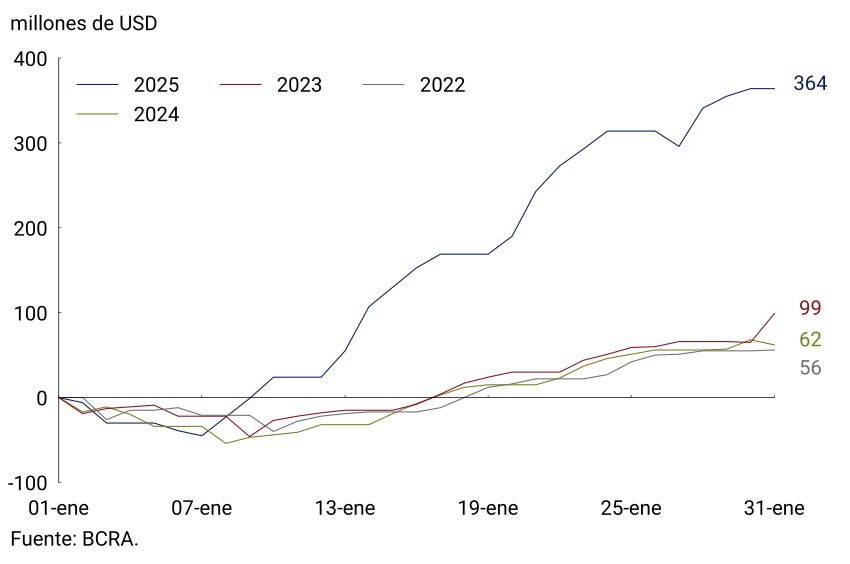 Las Reservas Internacionales del BCRA finalizaron enero con un saldo de USD28.310 millones, disminuyendo en USD1.330 millones respecto a fines de diciembre. Esta caída se explicó principalmente por pagos de vencimientos de bonos soberanos en dólares por parte del del Gobierno Nacional (incluidos en “Otras operaciones del sector público”). En sentido opuesto operaron las compras netas de divisas al sector privado que dejaron un saldo de USD1.617 millones y, en menor medida, el aumento de la cuenta corriente en moneda extranjera de las entidades financieras en el BCRA (ver Gráfico 4.2).