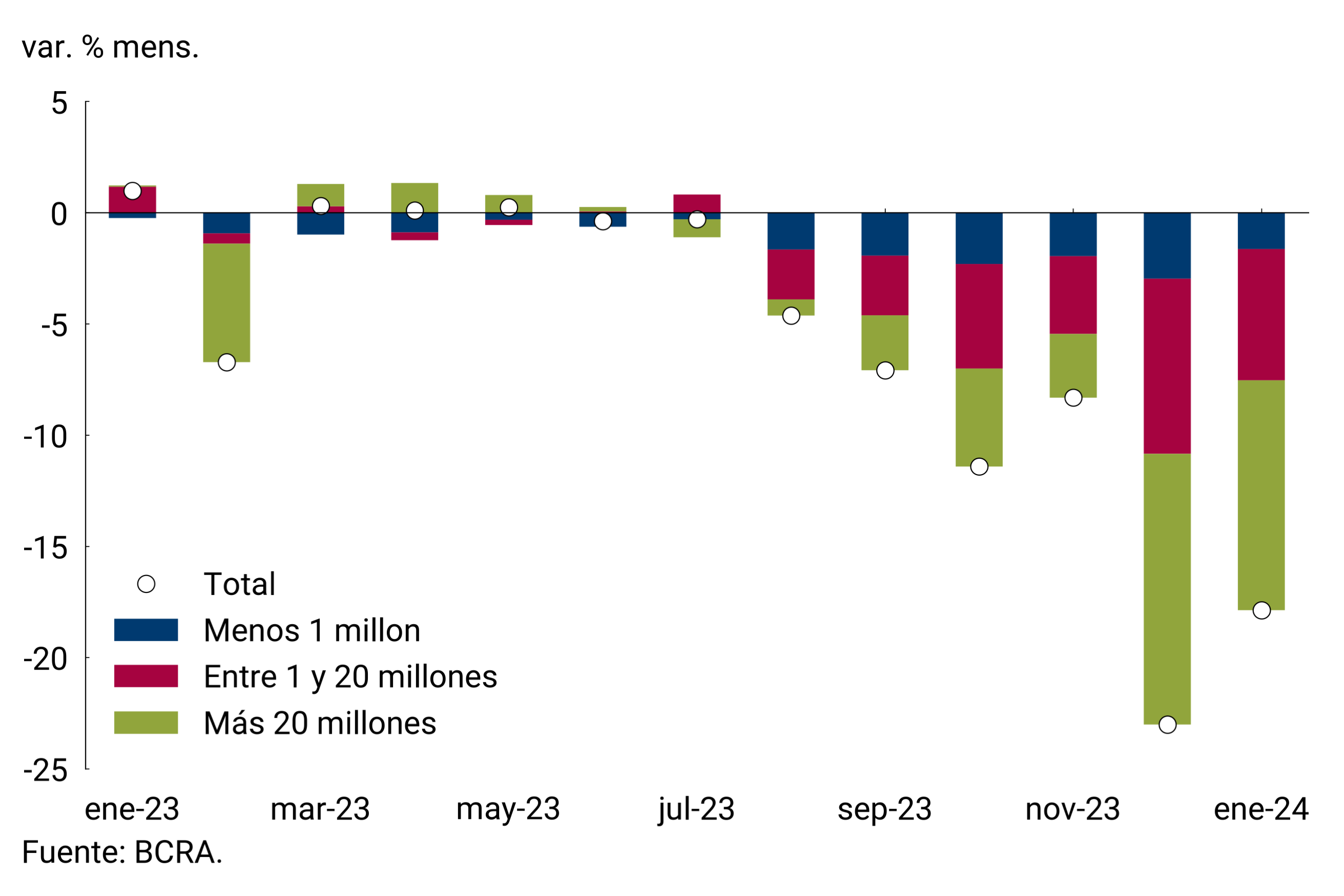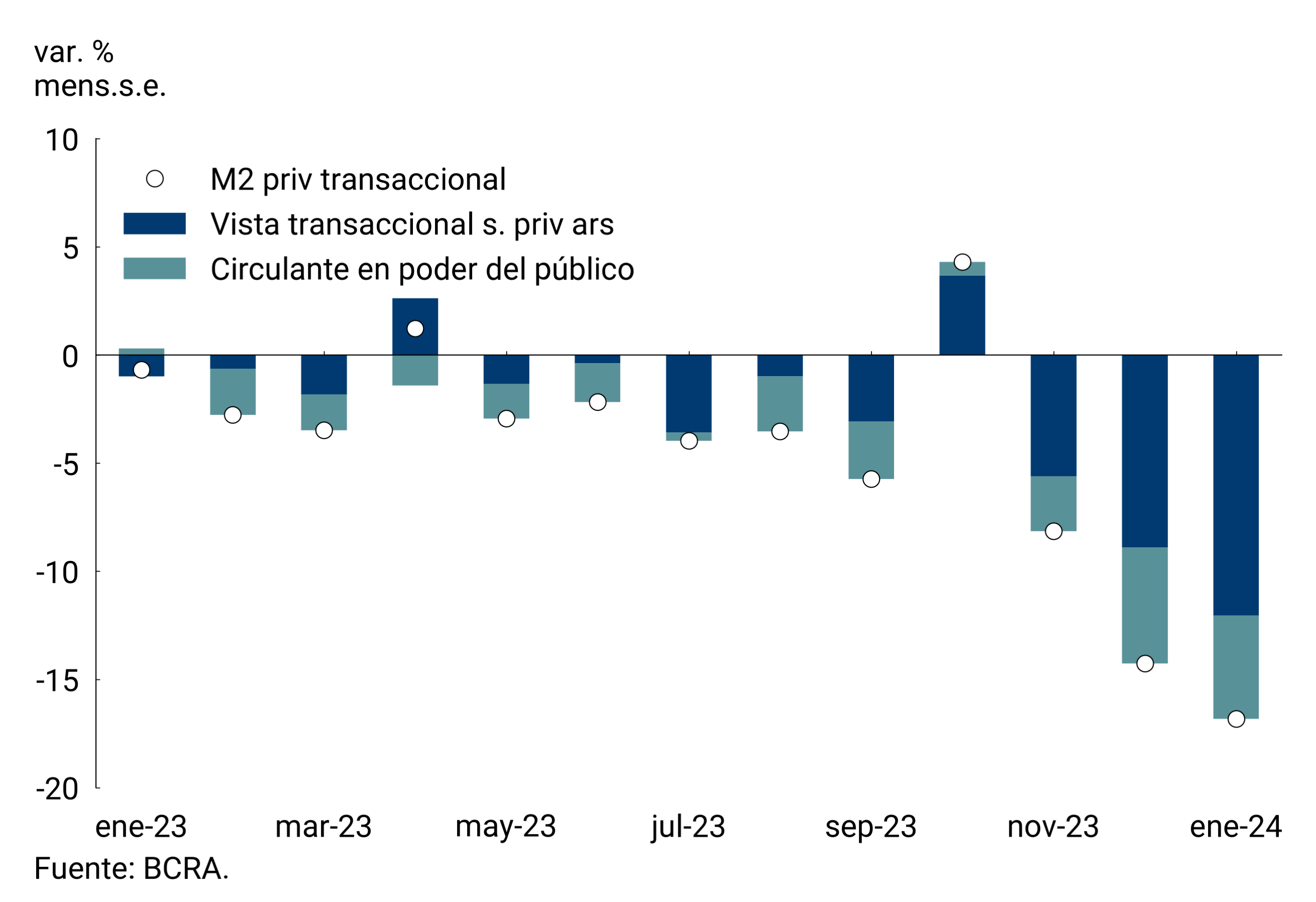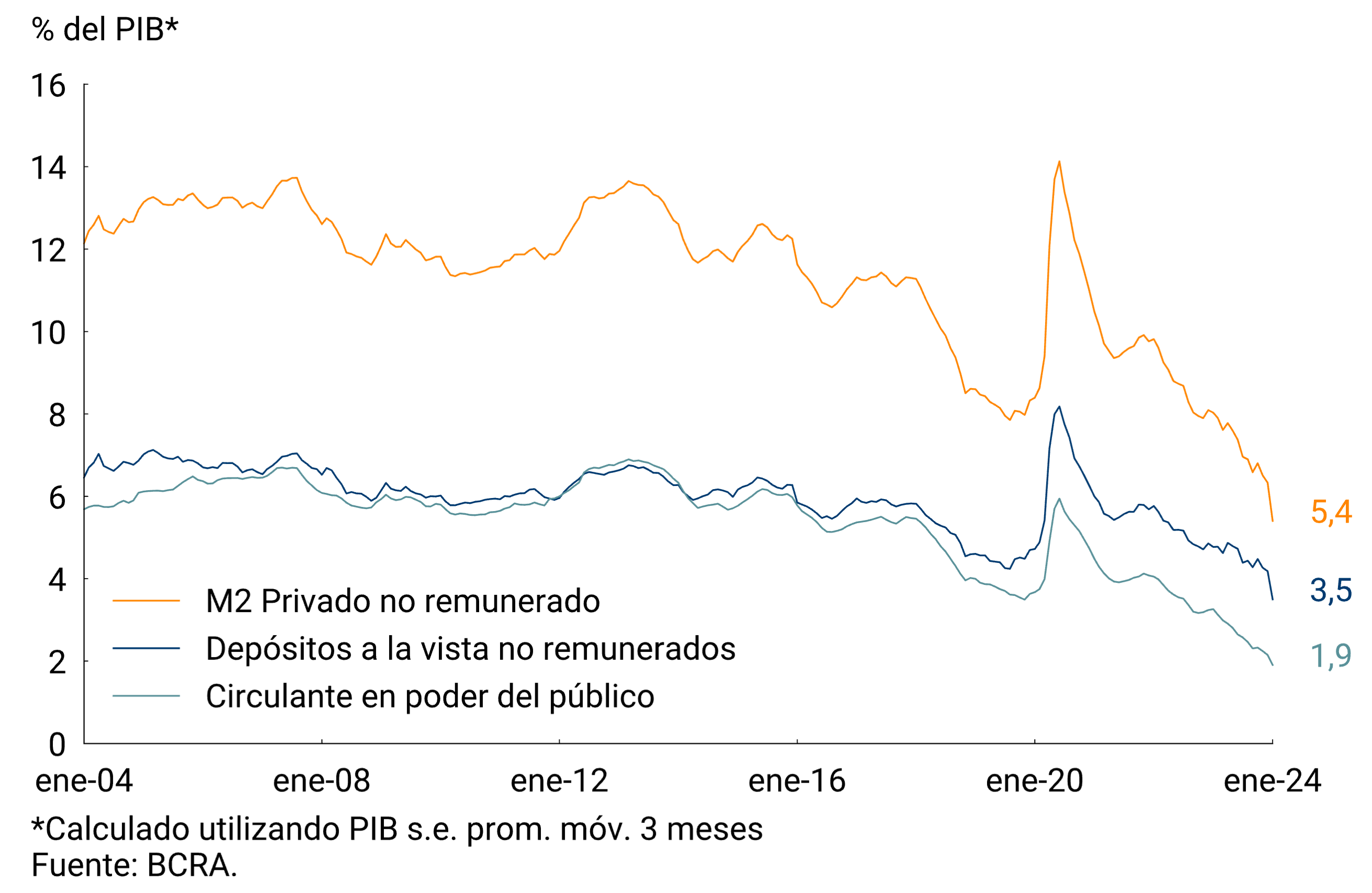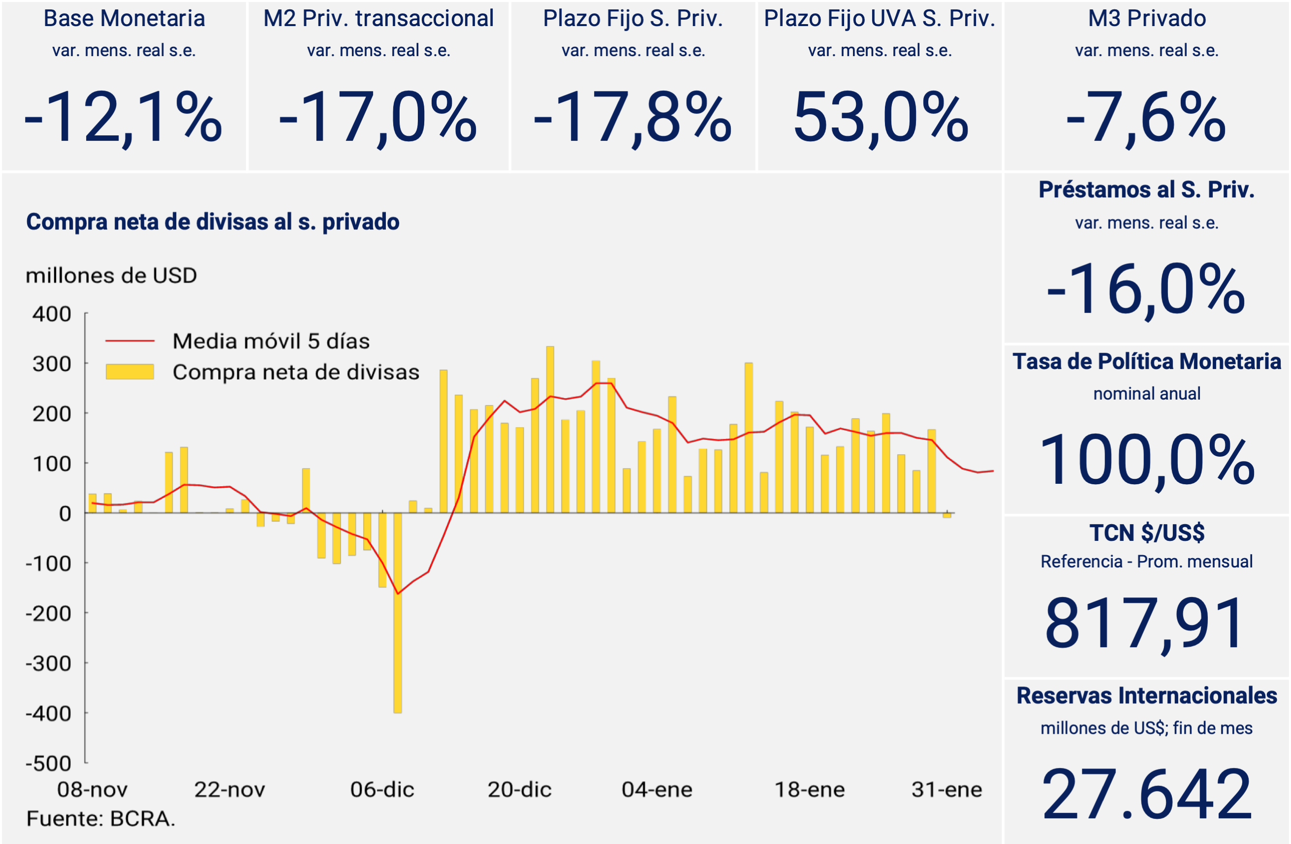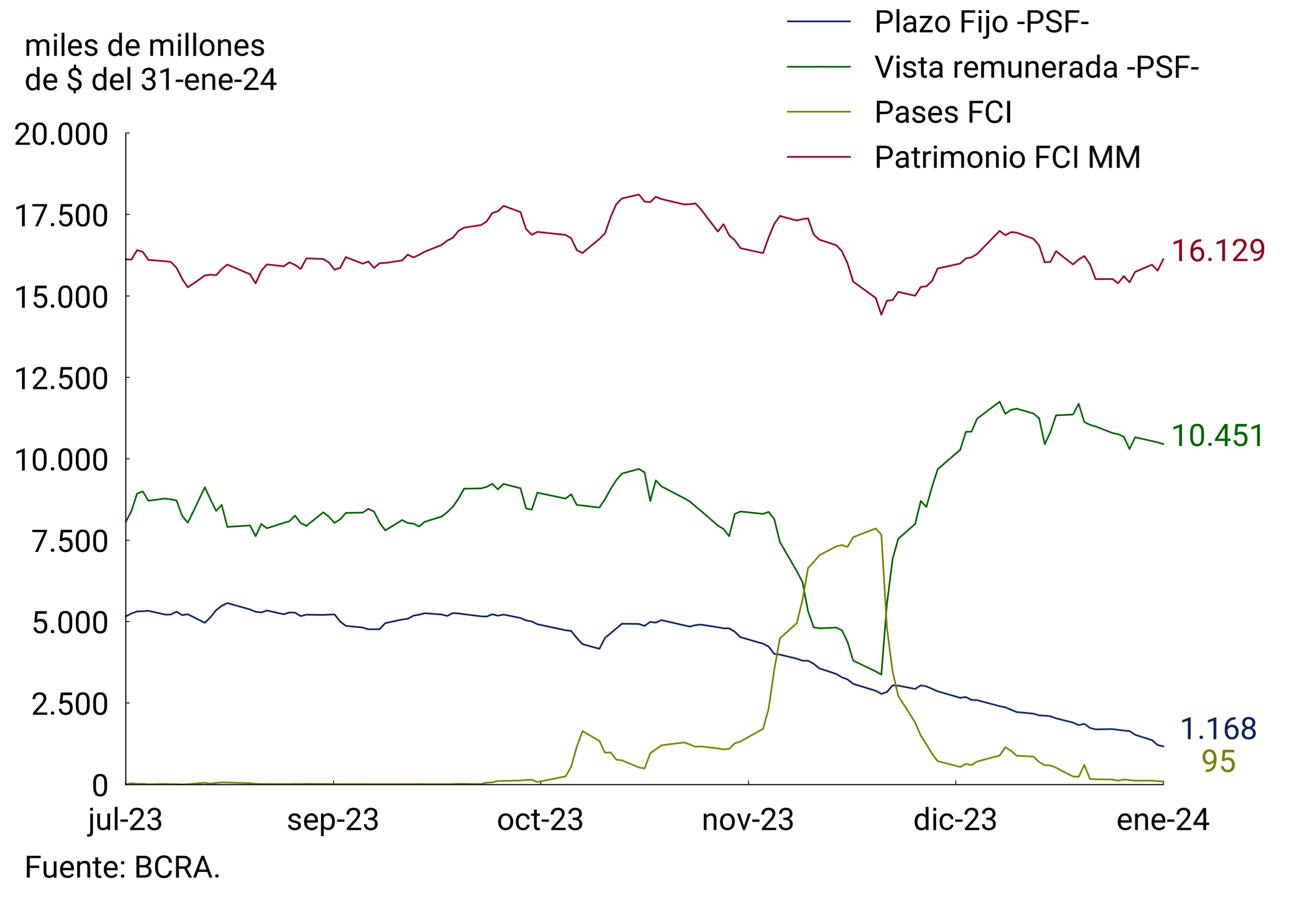En el primer mes del año, el agregado monetario amplio (M3 privado) siguió mostrando una contracción a precios constantes y sin estacionalidad. A nivel de los componentes, la dinámica fue explicada casi en su totalidad por la demanda de medios de pago (circulante y depósitos a la vista “tradicionales”), que continuaron evidenciando una caída. Por su parte, los instrumentos de ahorro en pesos se mantuvieron sin cambios significativos, con un comportamiento heterogéneo por tipo de depósito. En efecto, las colocaciones a plazo fijo en pesos del sector privado continuaron mostrando una contracción en términos reales, que fue compensada por una mayor demanda de depósitos a la vista remunerados. Esto último mostró una mayor preferencia por parte de los agentes por activos remunerados y líquidos.