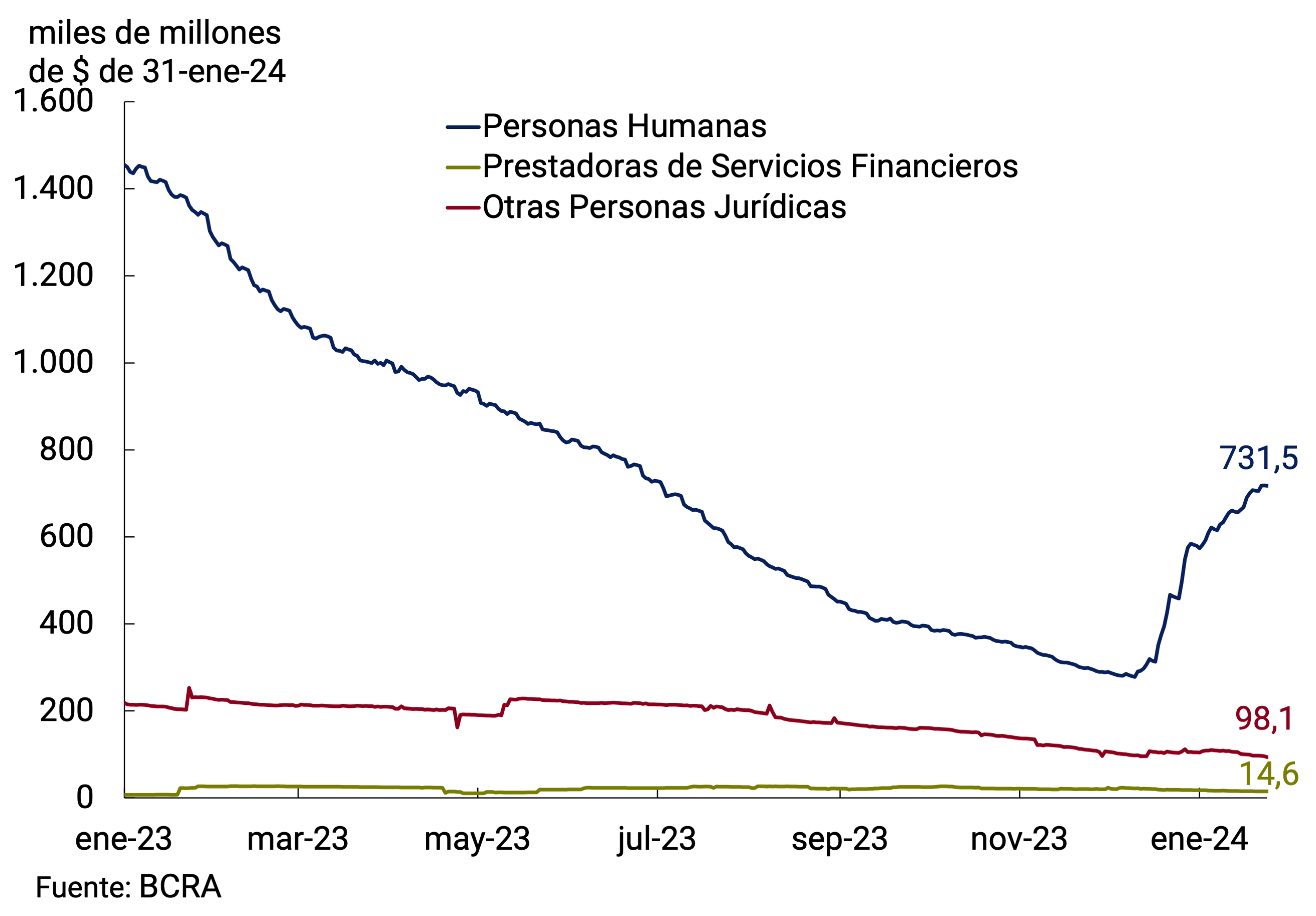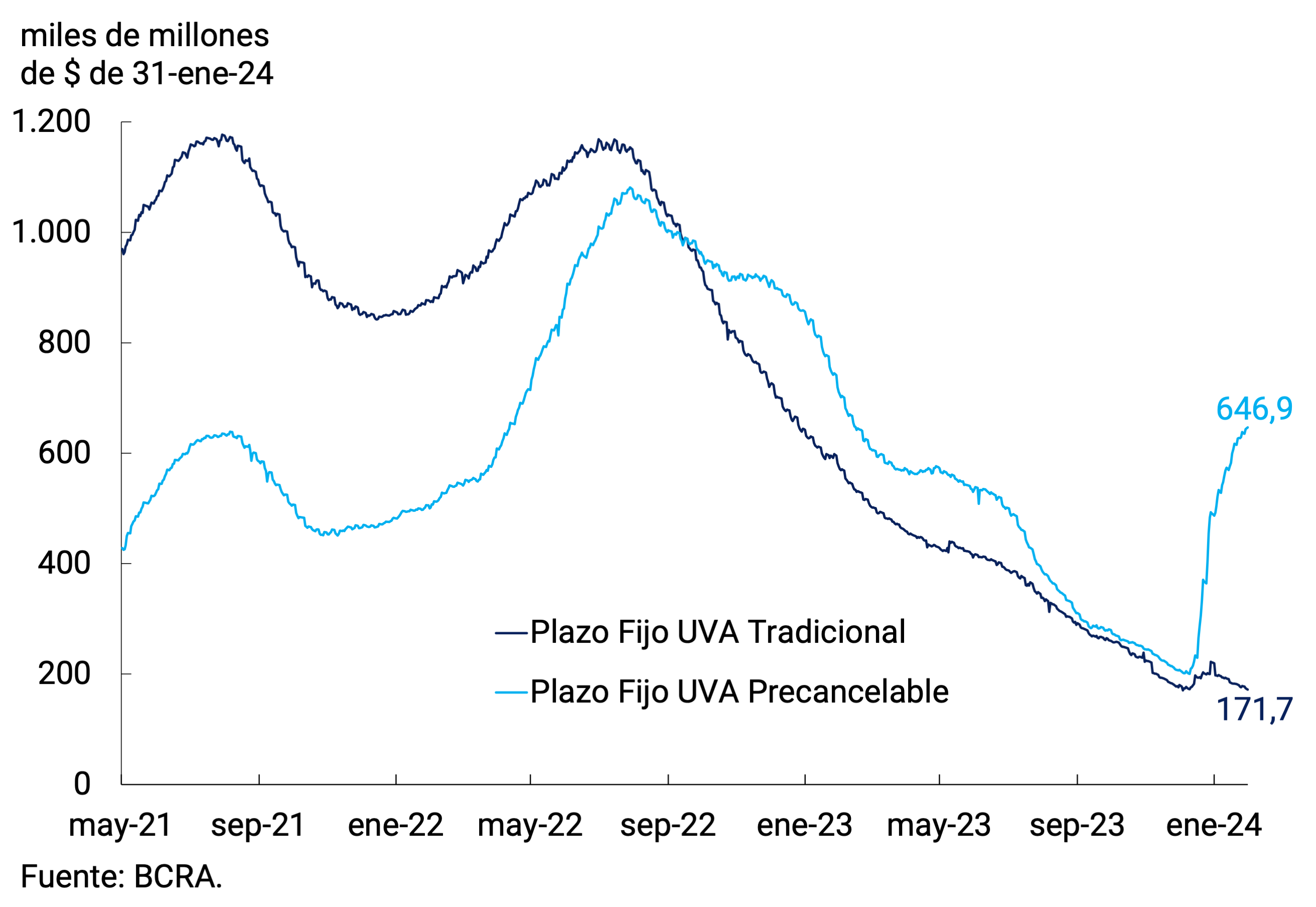 El Directorio del BCRA mantuvo sin cambios la tasa de interés mínima garantizada de los depósitos a plazo fijo en el primer mes del año2. Dicha tasa de interés, aplicable a todos los titulares del sector privado no financiero, continuó así en 110% n.a., lo que implica un rendimiento efectivo mensual de 9%.