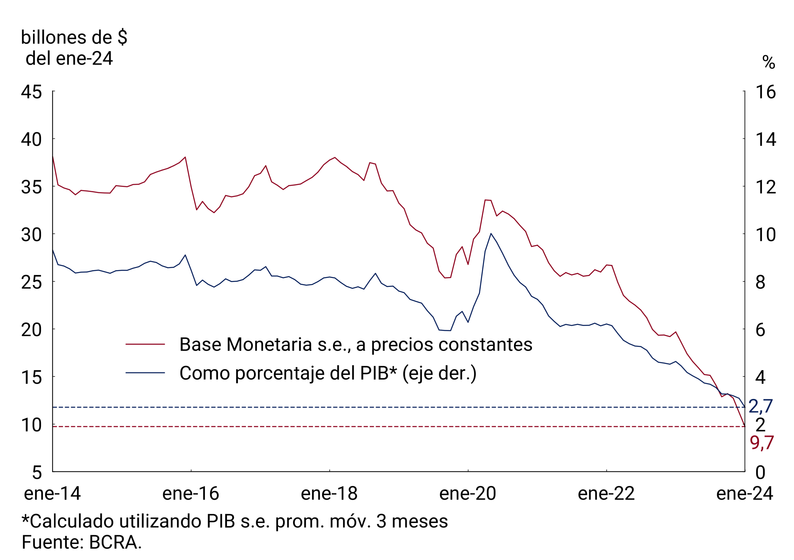 En enero, el saldo promedio de la Base Monetaria fue de $10,2 billones, lo que implicó una expansión mensual de $1,0 billones (11,1%) a precios corrientes. Cabe señalar que la Base Monetaria presenta una estacionalidad positiva en enero, por lo que si se corrige este efecto y se la mide a precios constantes habría exhibido en realidad una contracción de 12,1% en el mes. En la comparación interanual, habría acumulado una caída del orden del 50% y, como ratio del PIB, se ubicaría actualmente en 2,9% (ver Gráfico 4.1).