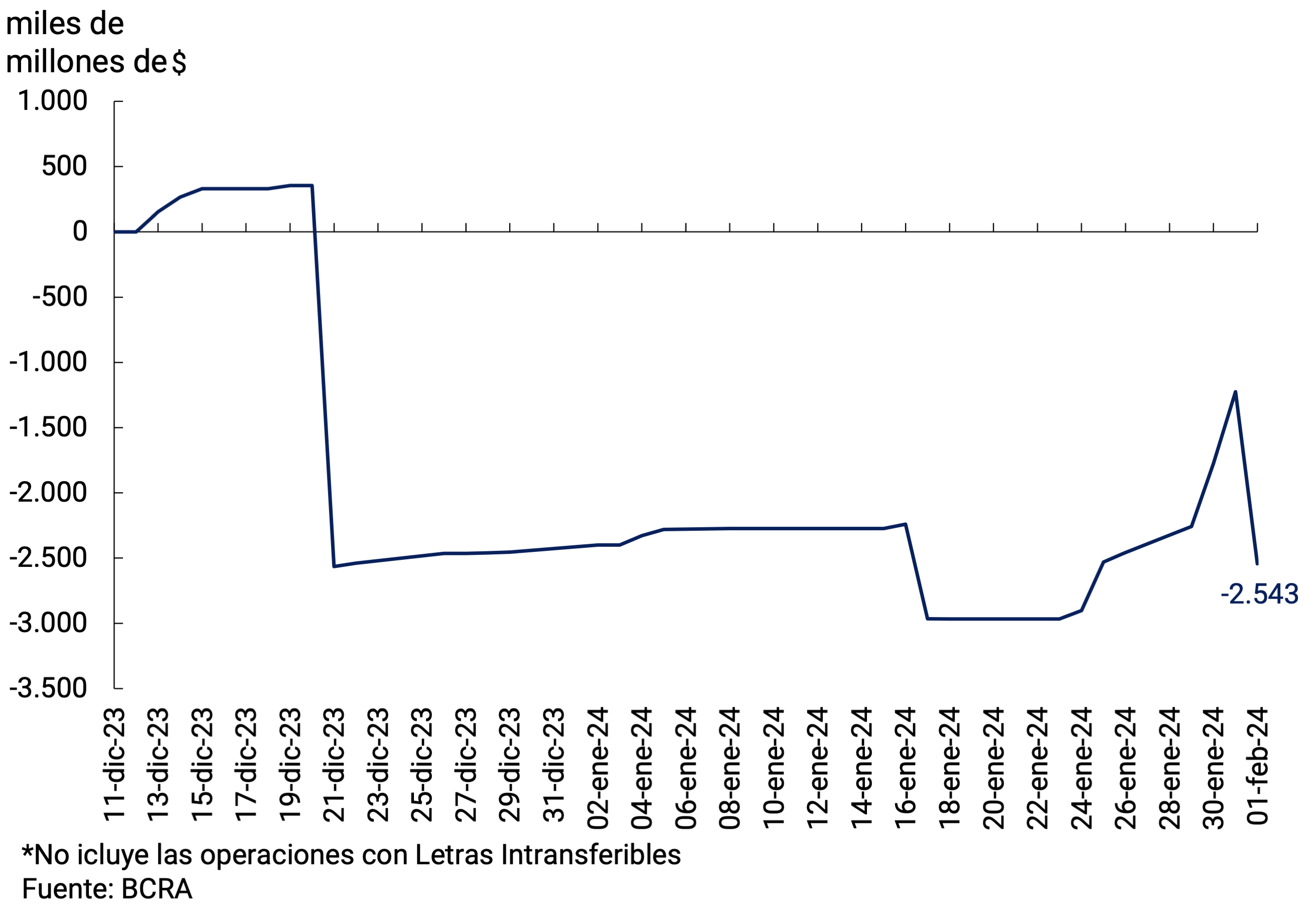 Recientemente el Fondo Monetario Internacional (FMI) aprobó la séptima revisión del Programa de Facilidades Extendidas (PFE). En línea con lo decidido por las autoridades y anunciado en los Objetivos y planes de política monetaria para 2024, se fijó una meta de financiamiento monetario al Tesoro Nacional nulo para 2024. En este sentido, desde el 11 de diciembre, las operaciones de financiamiento directo o indirecto tuvieron un efecto neto contractivo por aproximadamente $1,2 billones. Asimismo, el acuerdo permitió el desembolso, neto de pagos al organismo, de USD2.700 millones. Esto último, sumado a las compras de divisas al sector privado (USD3.270 millones), permitió que las Reservas Internacionales se incrementaran en USD4.568 millones.