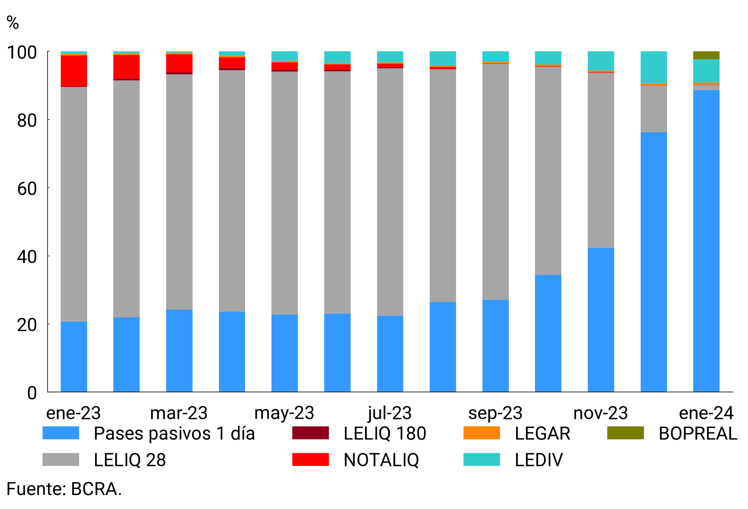 Respecto de los instrumentos de política monetaria, el BCRA decidió mantener su tasa de política monetaria (pases pasivos a 1 día) en 100% n.a. (8,6% e.m.). De este modo, la tasa de los pases pasivos a 1 día para FCI permaneció en 85% n.a. (7,2% e.m.), mientras que la tasa de interés de pases activos a 1 día se mantuvo en 160% n.a. (14% e.m.). Las medidas adoptadas en diciembre, orientadas a simplificar la señal de tasa de política monetaria y racionalizar su esquema de gestión de liquidez, llevaron a una nueva configuración de los instrumentos de regulación monetaria4. Entre estas medidas, se discontinuaron las licitaciones de LELIQ y de este modo se alcanzó su desarme completo el día 11 de enero, fecha del último vencimiento. Parte de esos fondos se canalizaron hacia pases pasivos a 1 día y licitaciones del Tesoro Nacional. Así, con datos a fin de mes, los pasivos remunerados quedaron conformados en un 88,7% por pases pasivos a 1 día. El resto correspondió fundamentalmente a LEDIV y BOPREAL (ver Gráfico 4.3). Como porcentaje del Producto, los pasivos remunerados se ubicarían en 9,2% del PIB, 0,5 p.p. menos que en diciembre (ver Gráfico 4.4).